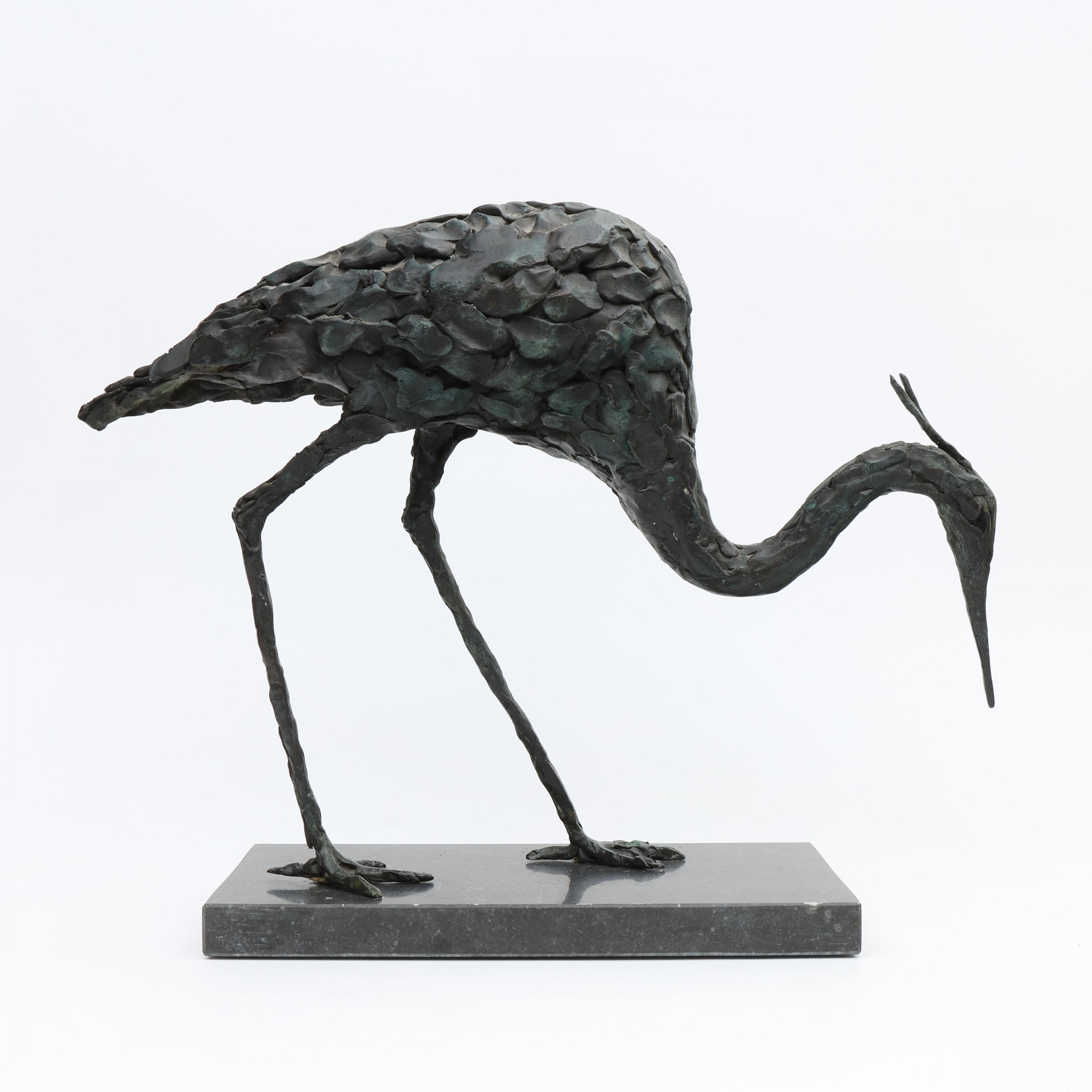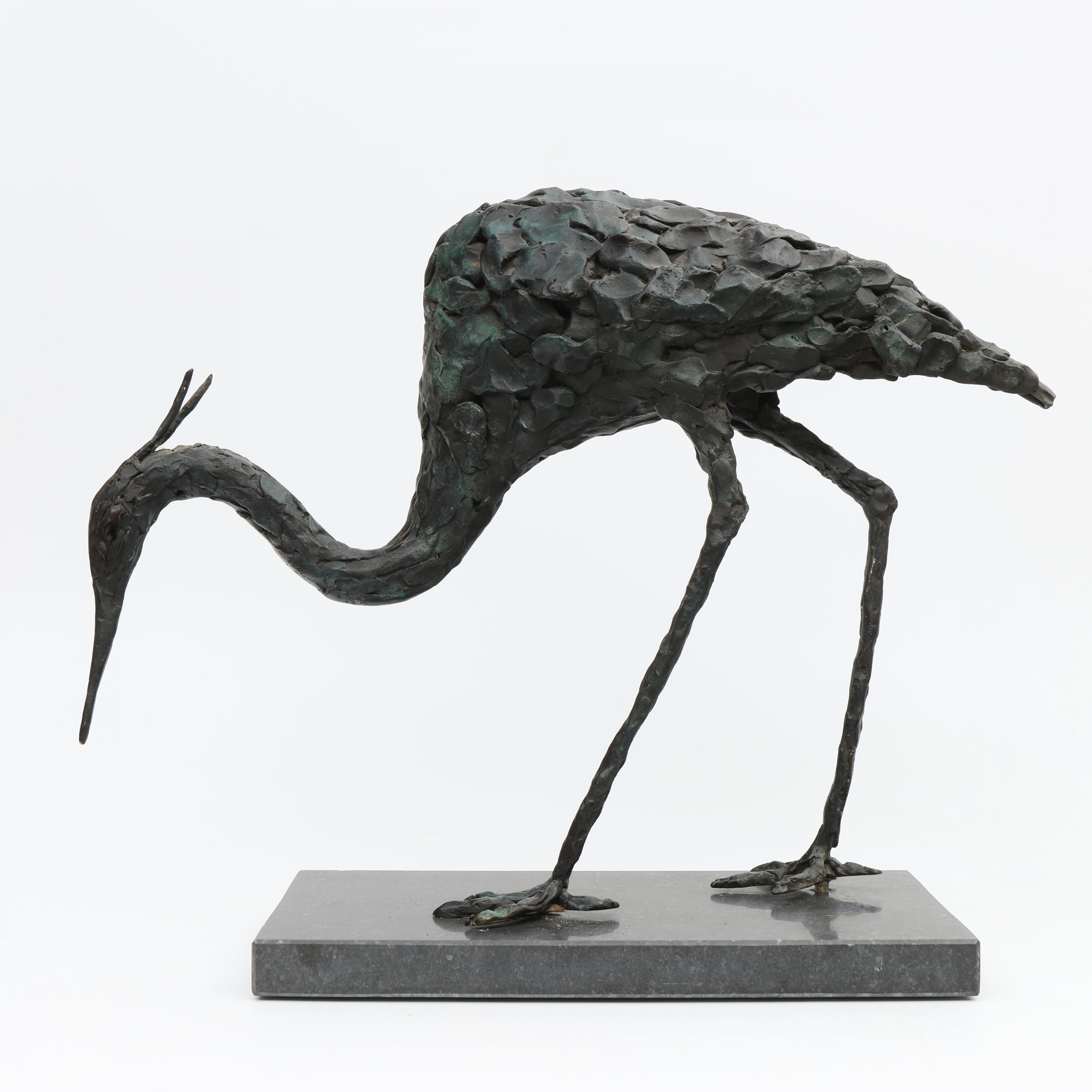 Jacqueline van der Laan - van Strien (geb. 1948), groen gepatineerd bronzen sculptuur, 'Reiger',