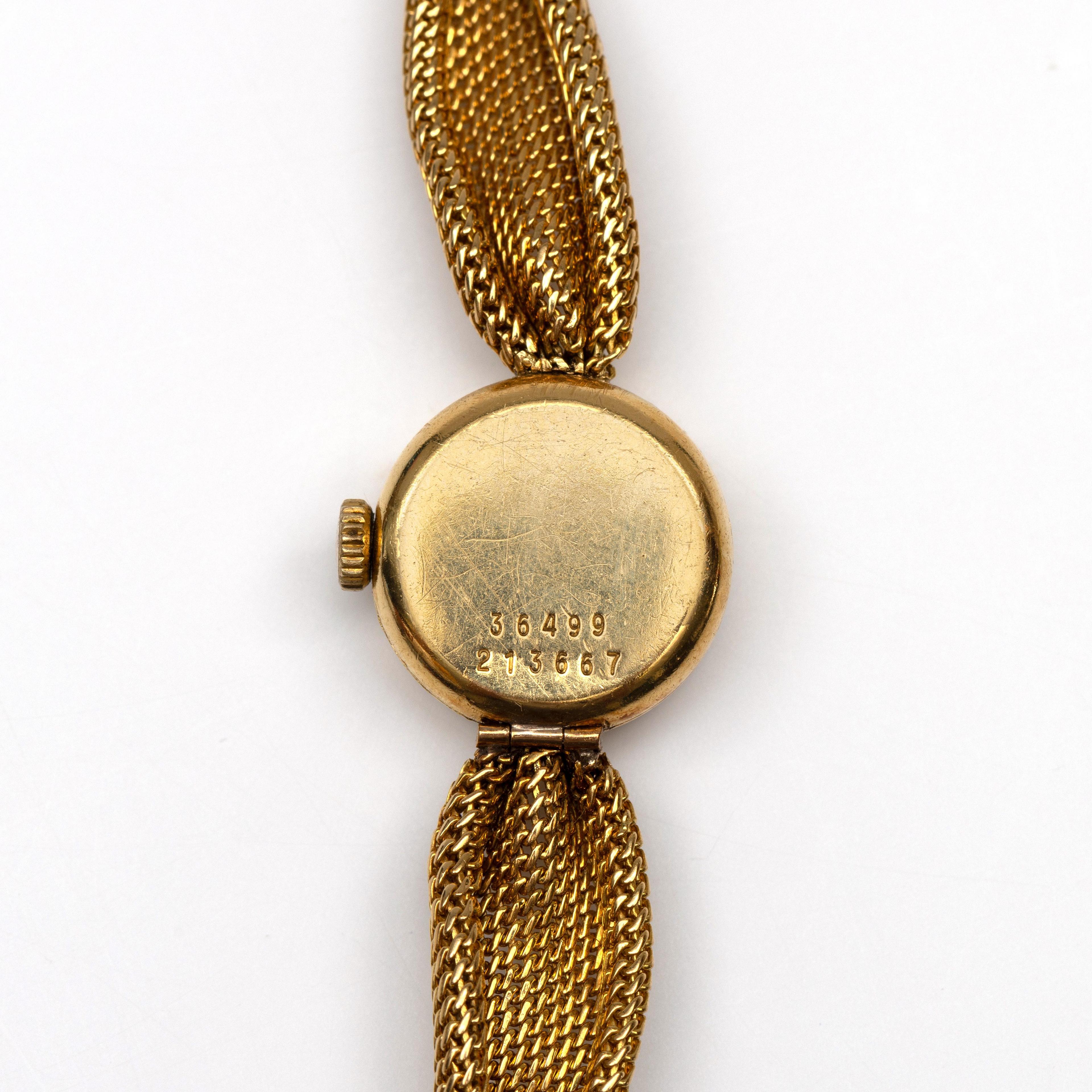 Baume & Mercier, 18 k. gold wristwatch, mid-20th century. Manual wind. With a gold-coloured dial and batons at the hours. On a mesh bracelet, pinched together at the dial, creating the impression of a fabric ribbon.
