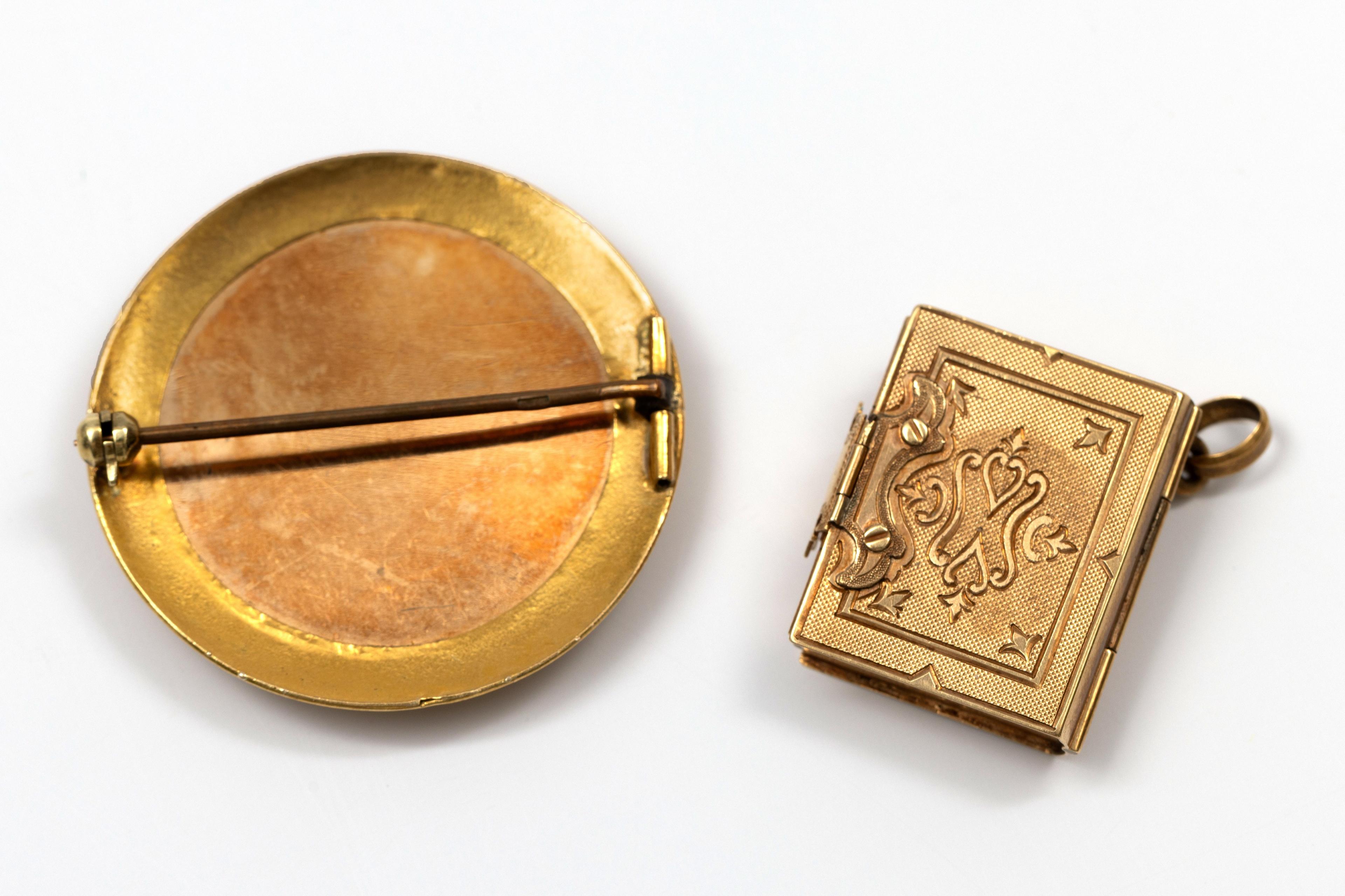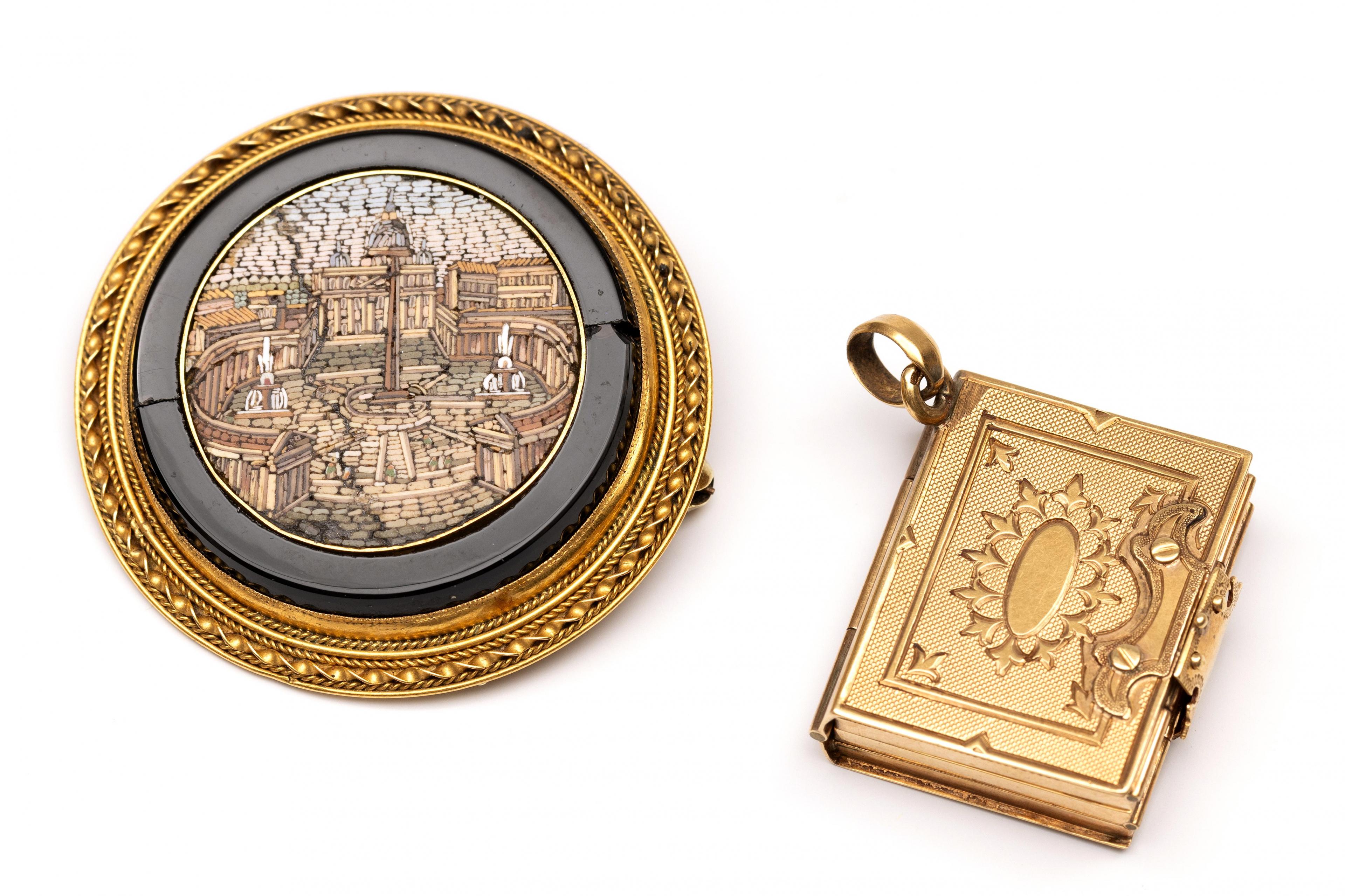 14 k. Gold round brooch with micromosaic, 19th century. Depicting St. Peter's Square in Rome. Herewith a gold locket in the shape of a book, 19th century. With space for four photos.