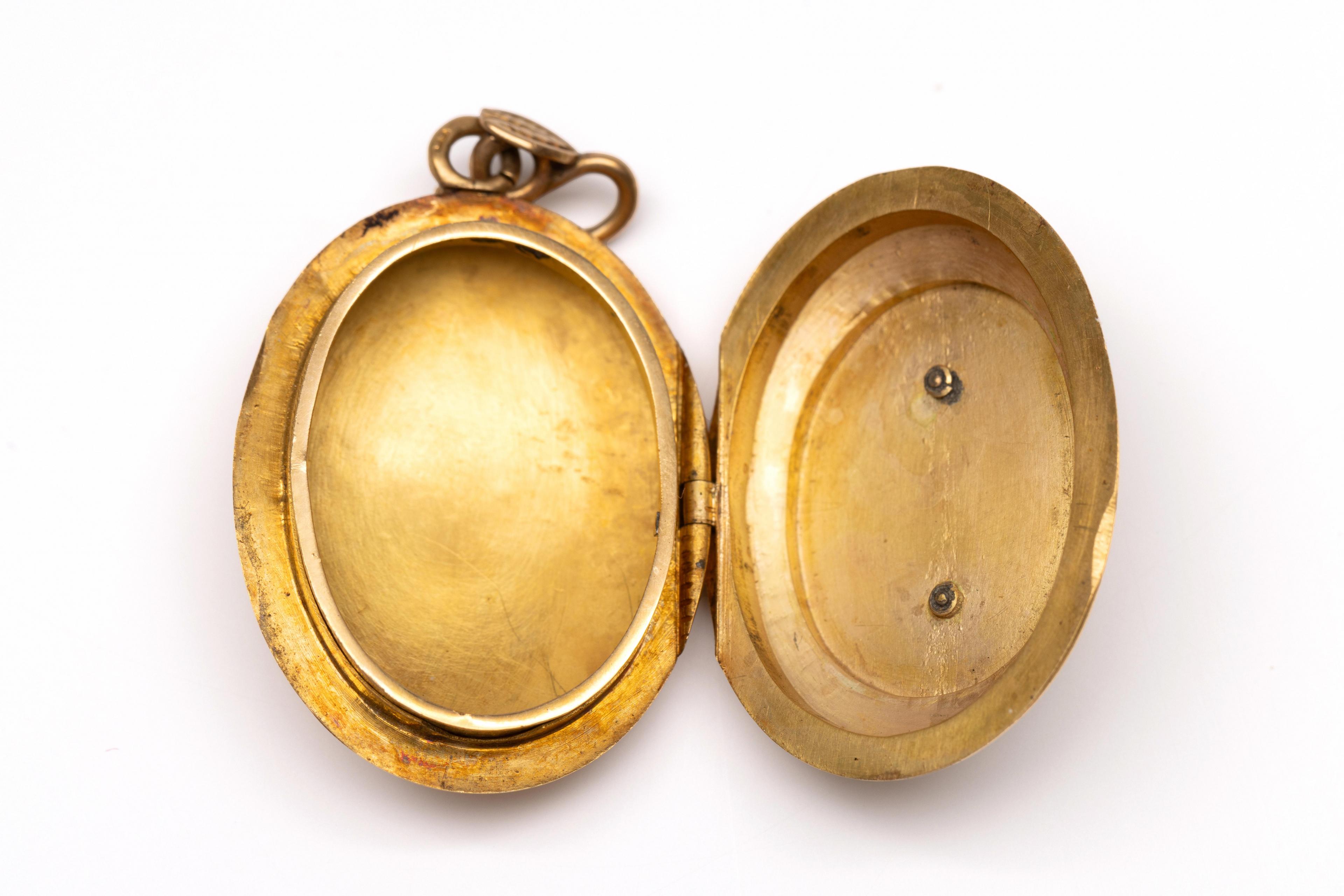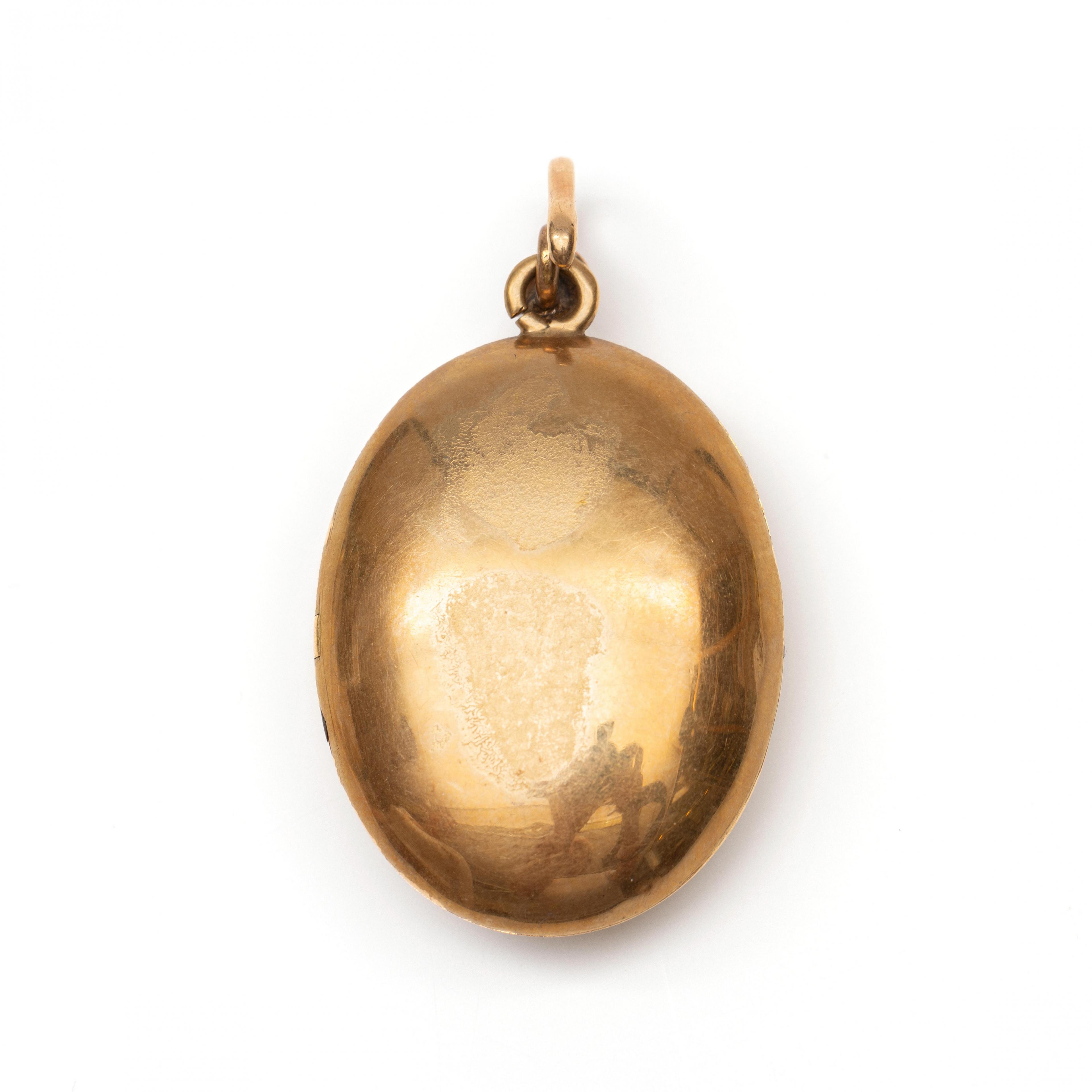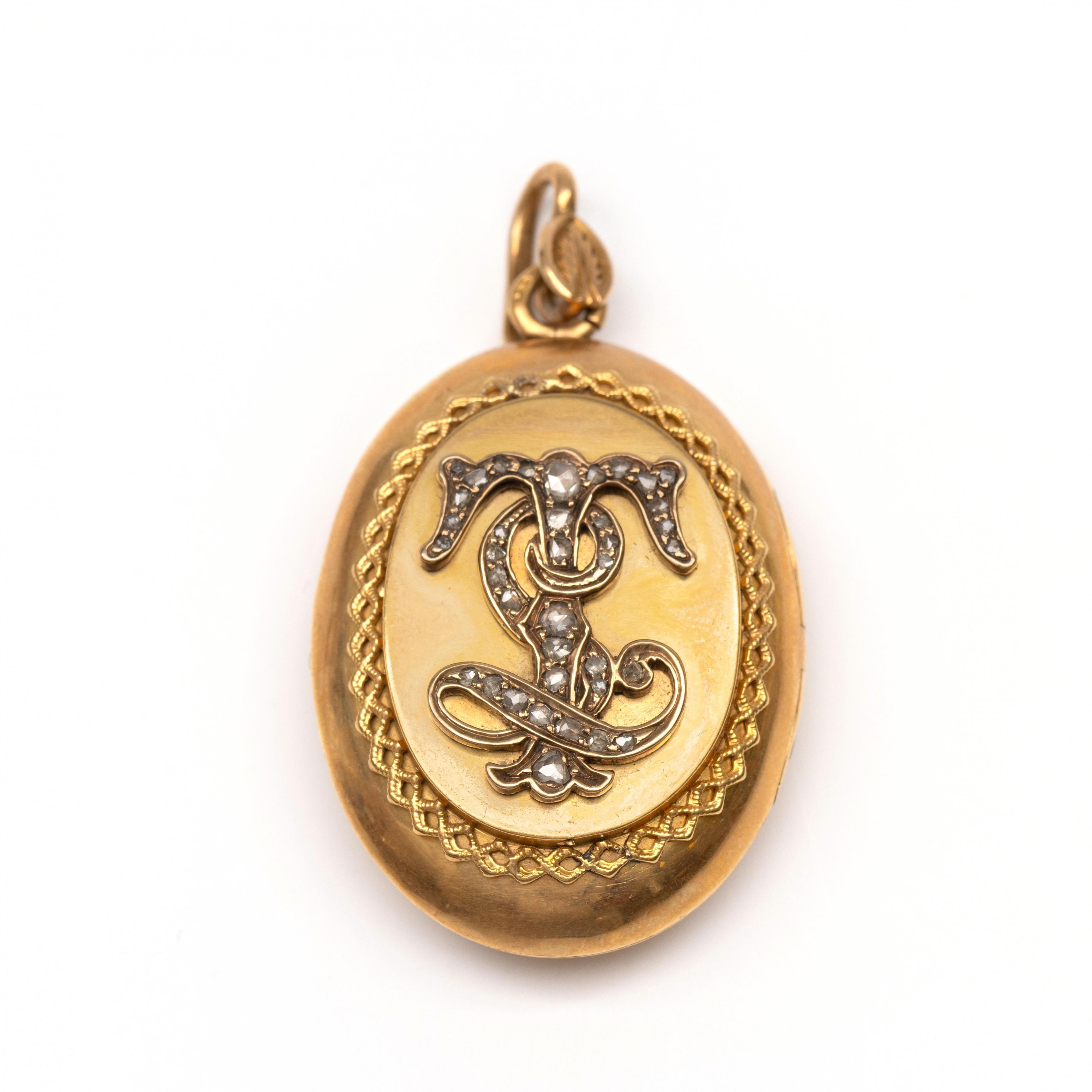 18 k. gold locket, 19th century. The obverse with an oval cartouche bearing the monogram TL, set with rose-cut diamonds. The bail decorated with a palmette.