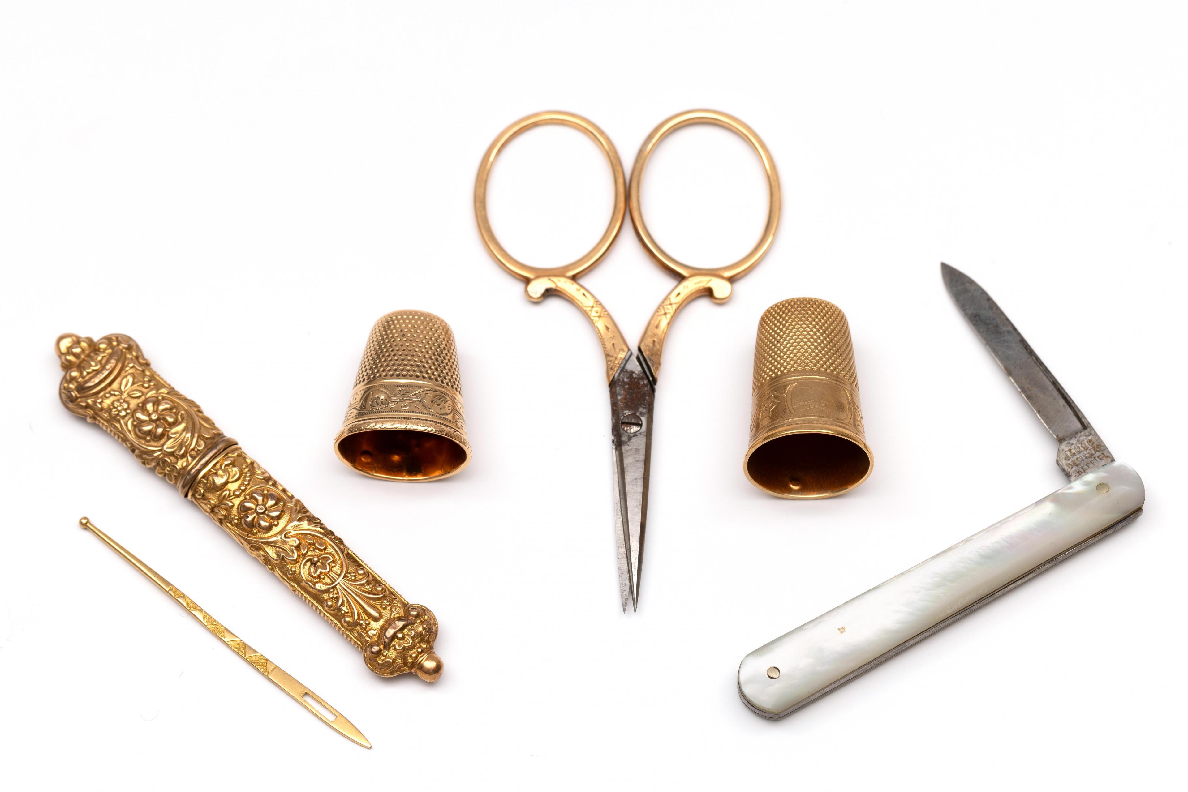 Bestaande uit een 14 kt. en 18 kt. gouden vingerhoed, een gouden schaartje, repoussé naaldenkoker met naald, de naald gekeurd met stadskeur voor Parijs, 1798-1809, en een onedel zakmesje met parelmoeren heft