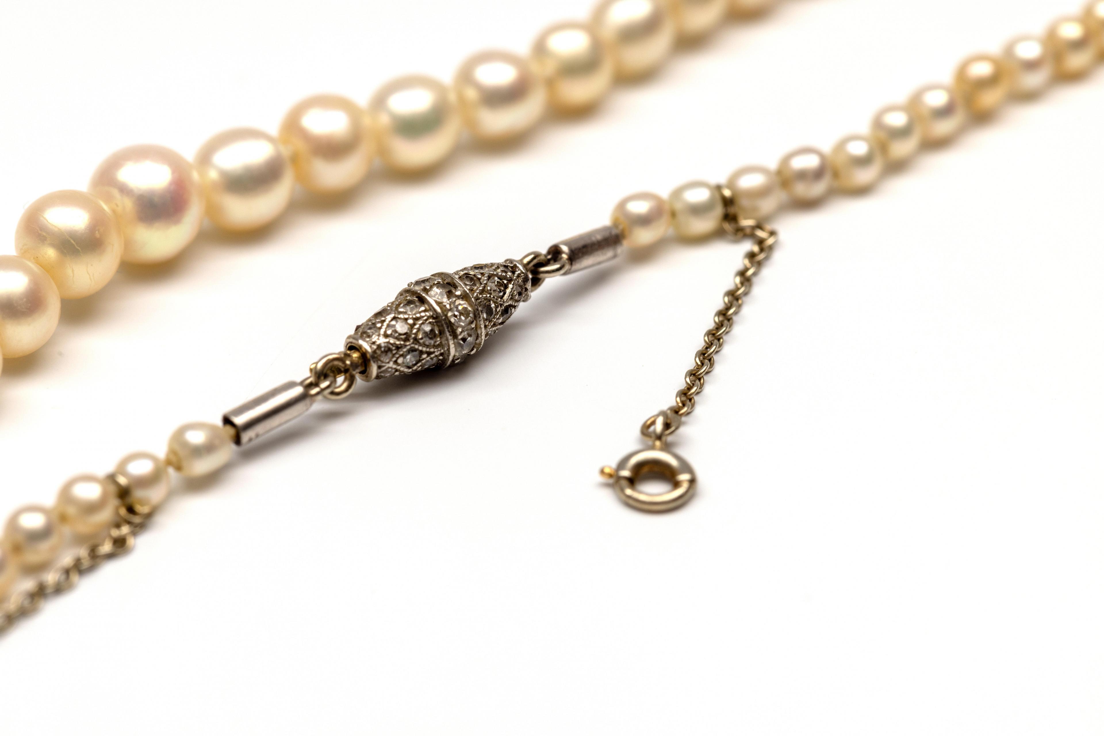 Pearl necklace and chute. Presumably of natural pearls, diameter 2.5-6 mm. Attached to a gold and silver barrel clasp set with single-cut diamonds.