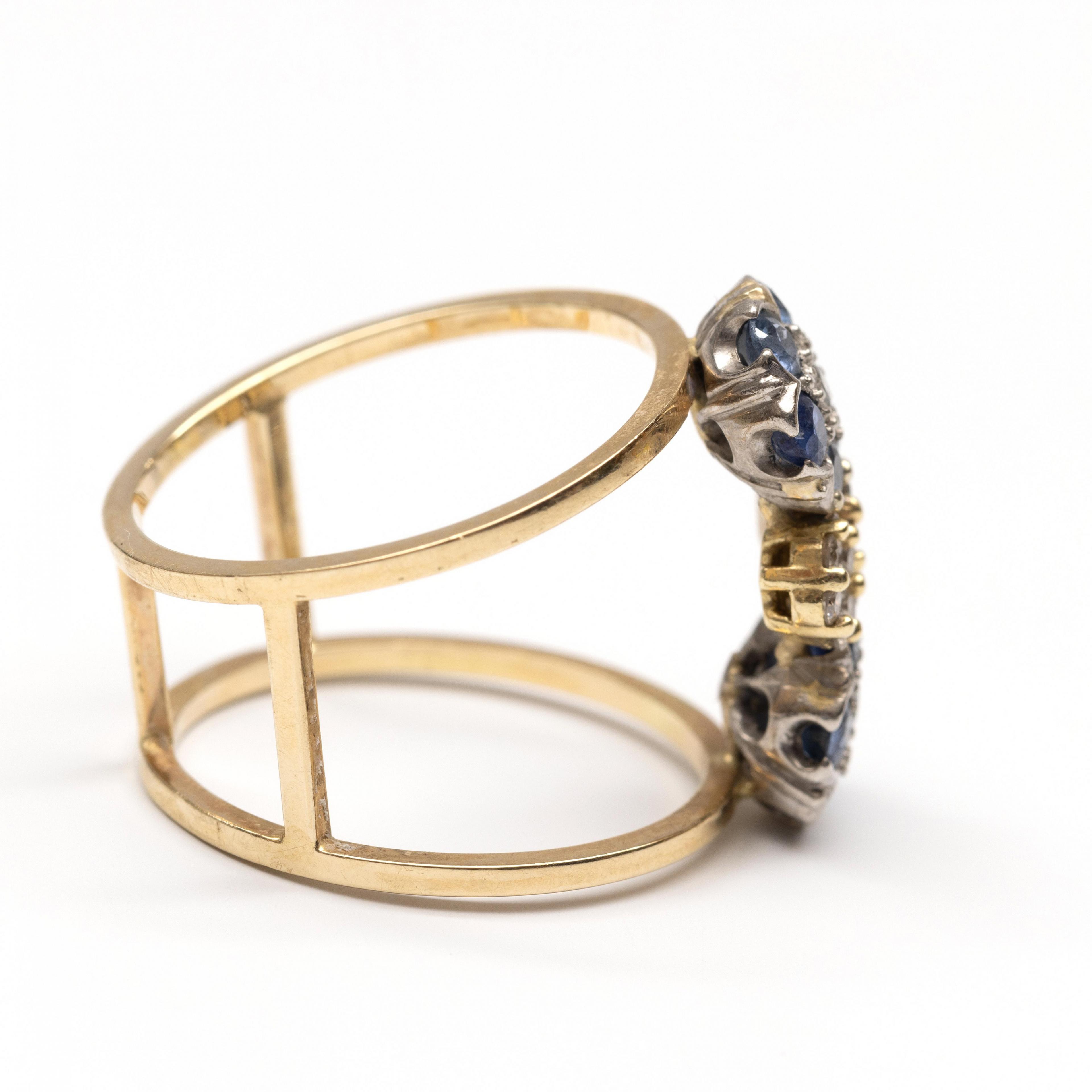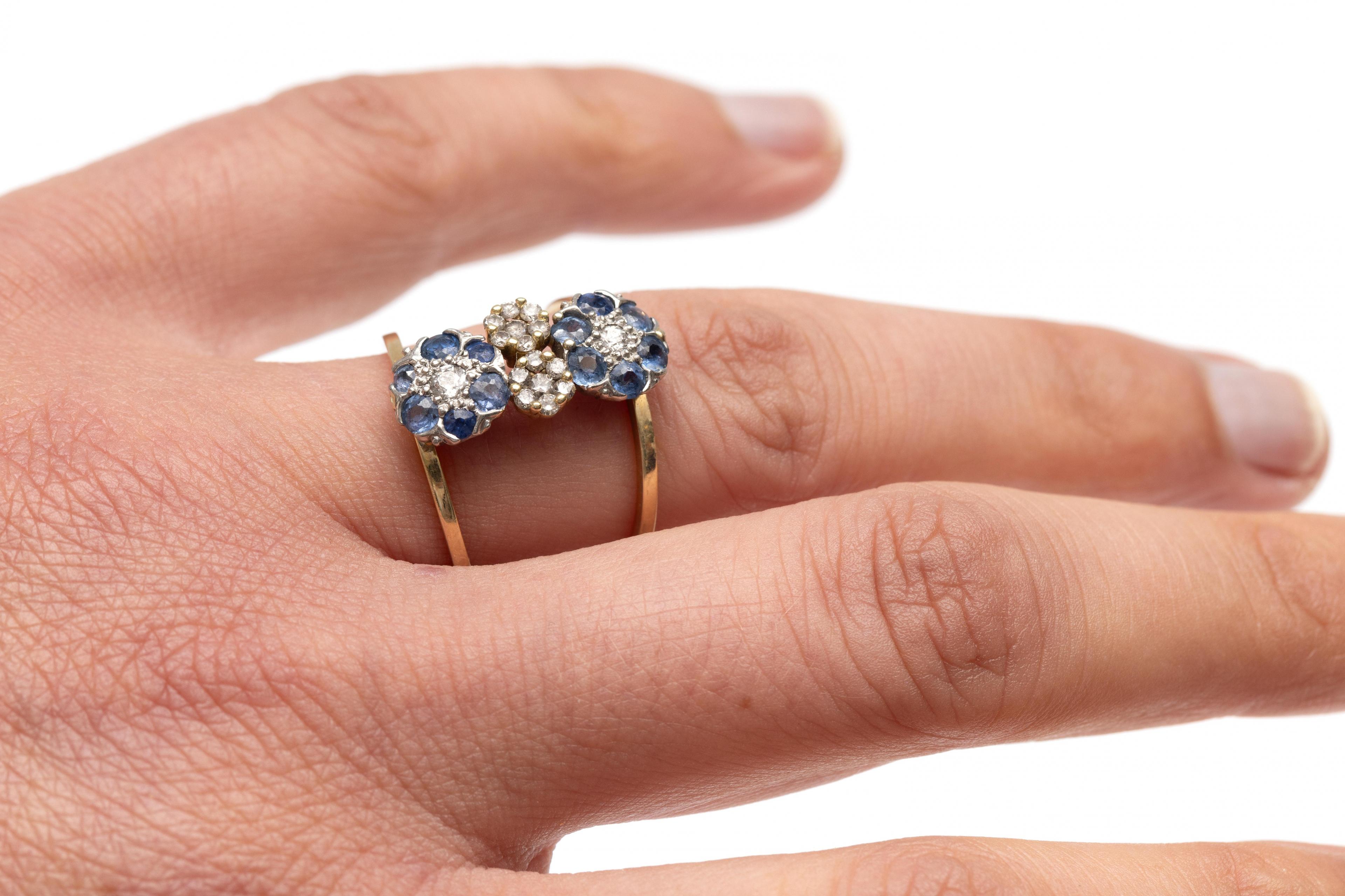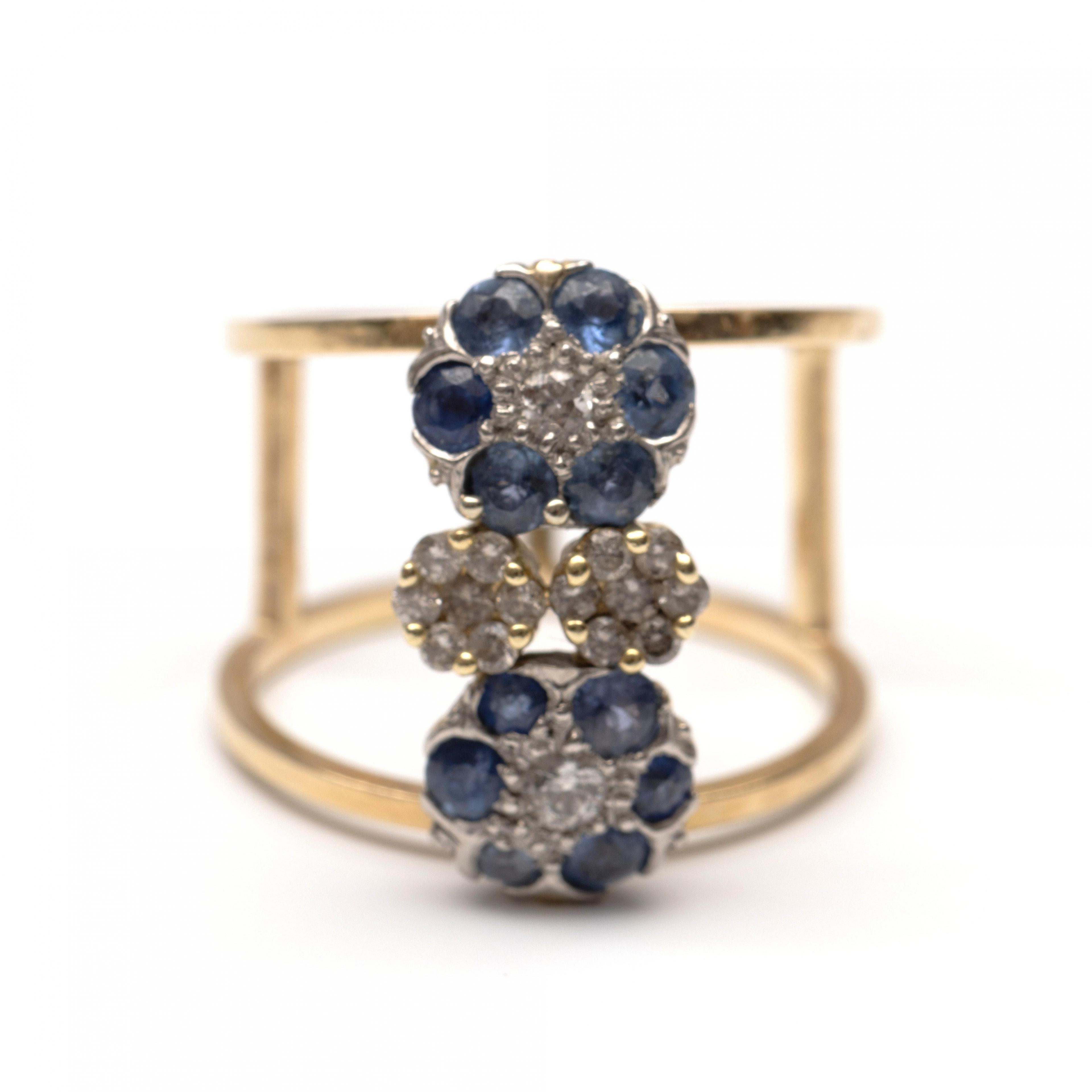 14 k. Gold and platinum ring. The top with four flower shapes, two set with sapphires and small brilliant-cut diamonds, and the other two with small brilliant-cut diamonds, with a total weight of approximately 0.25 ct.