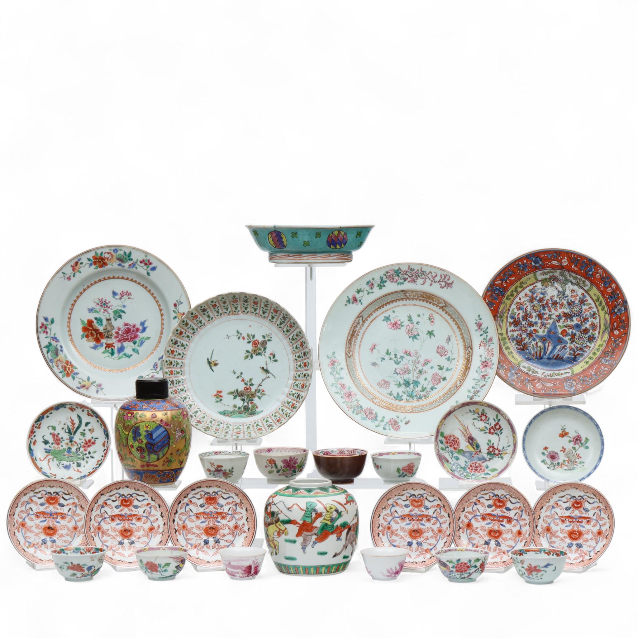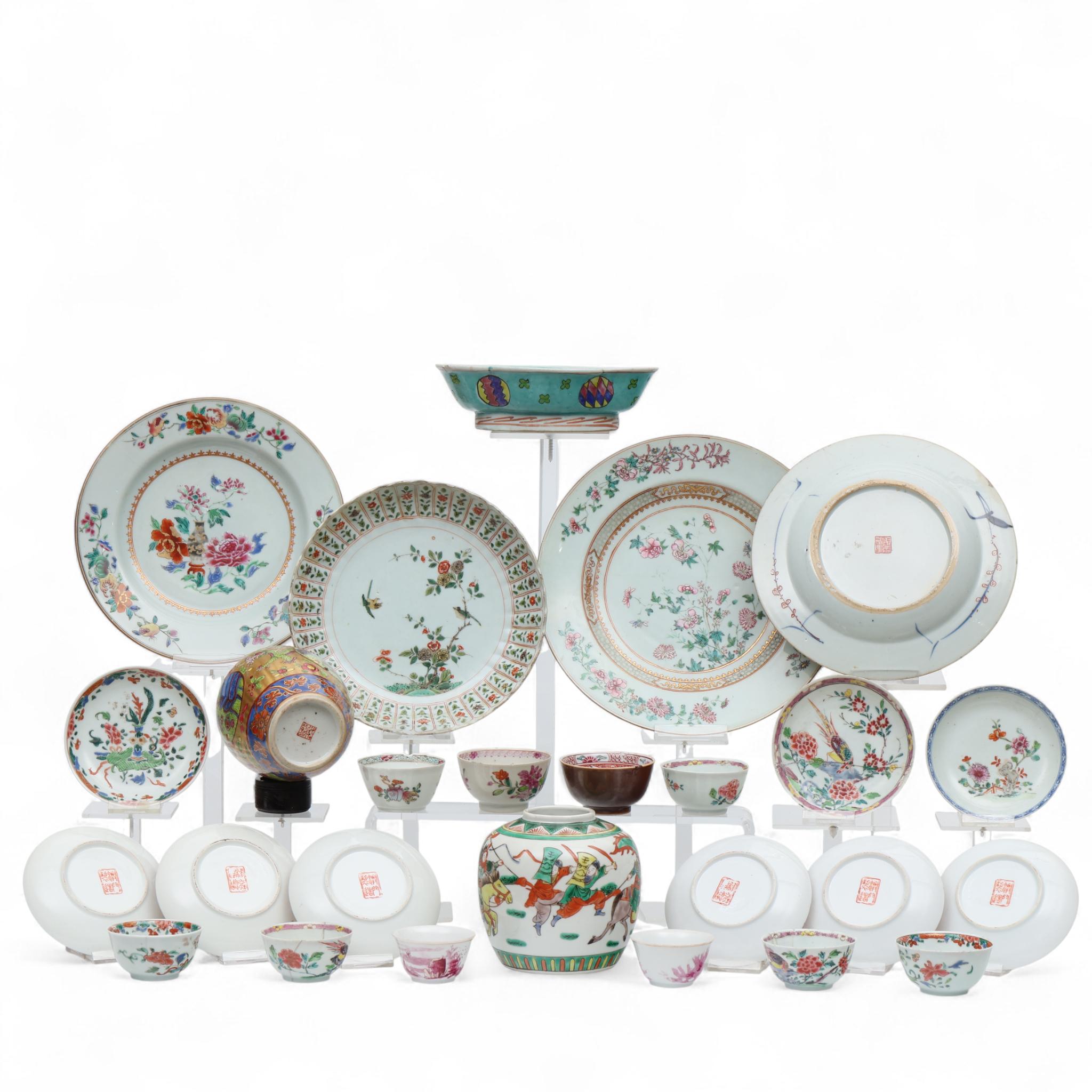 Among them famille verte ginger jar, Imari saucers and famille rose plates. (damages).