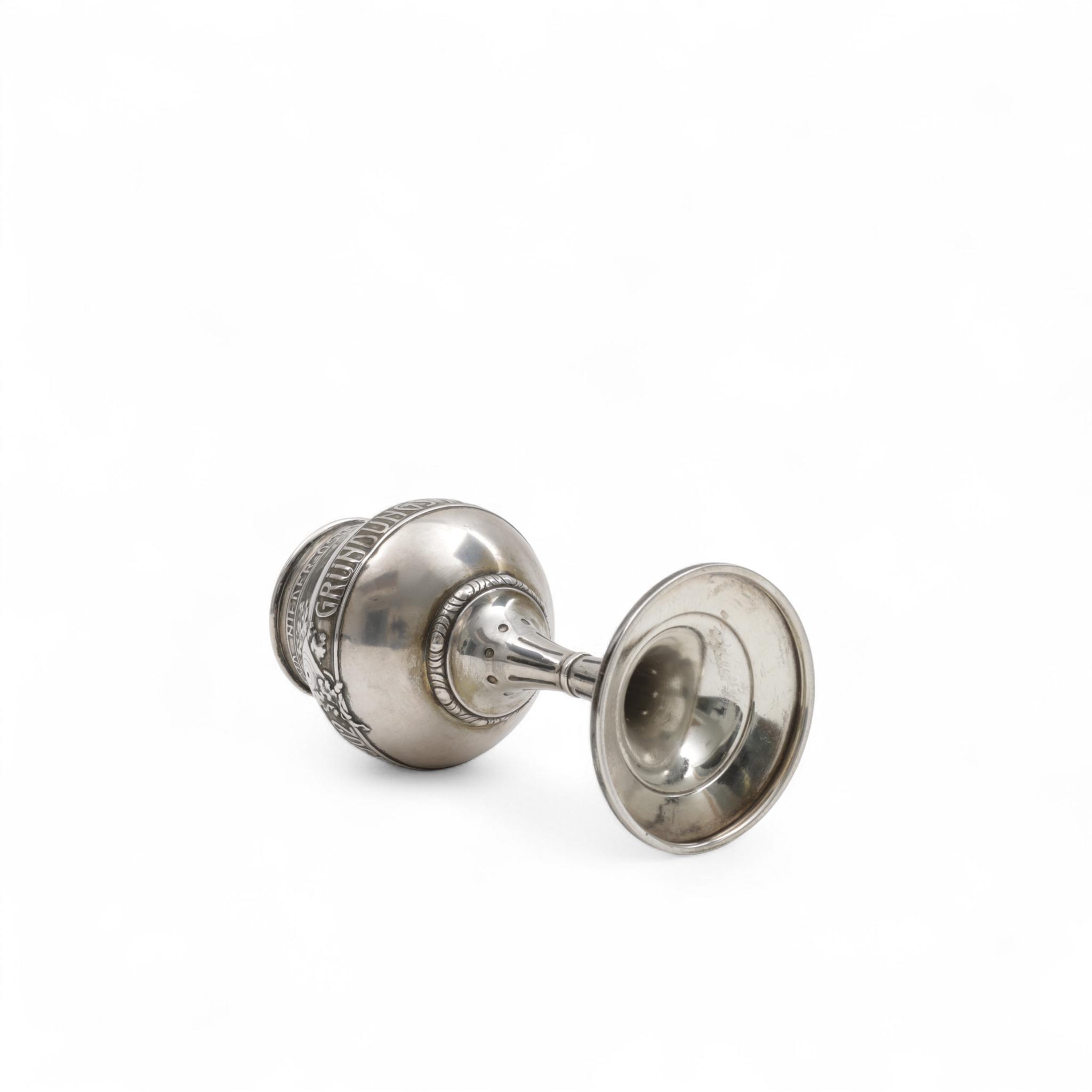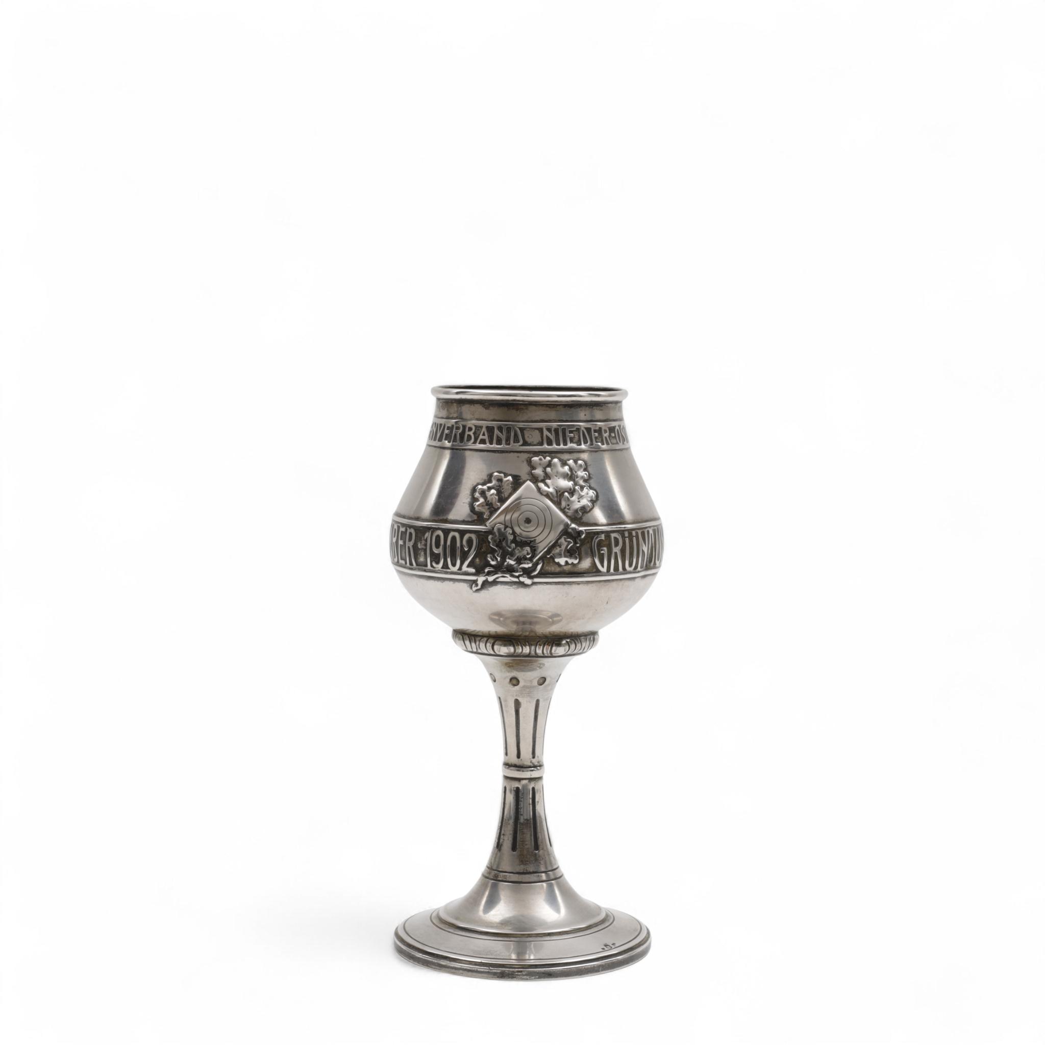 kelkvormig op ronde voet met hoge stam, tekst "Nieder-Osterreichscher landes Schützenverband" en Wien September 1902 Grüdungs-Festschiessen September 1902, mt. onduidelijk, gekeurd V buitenlandse werken en 1872-1922, 2e gehalte,