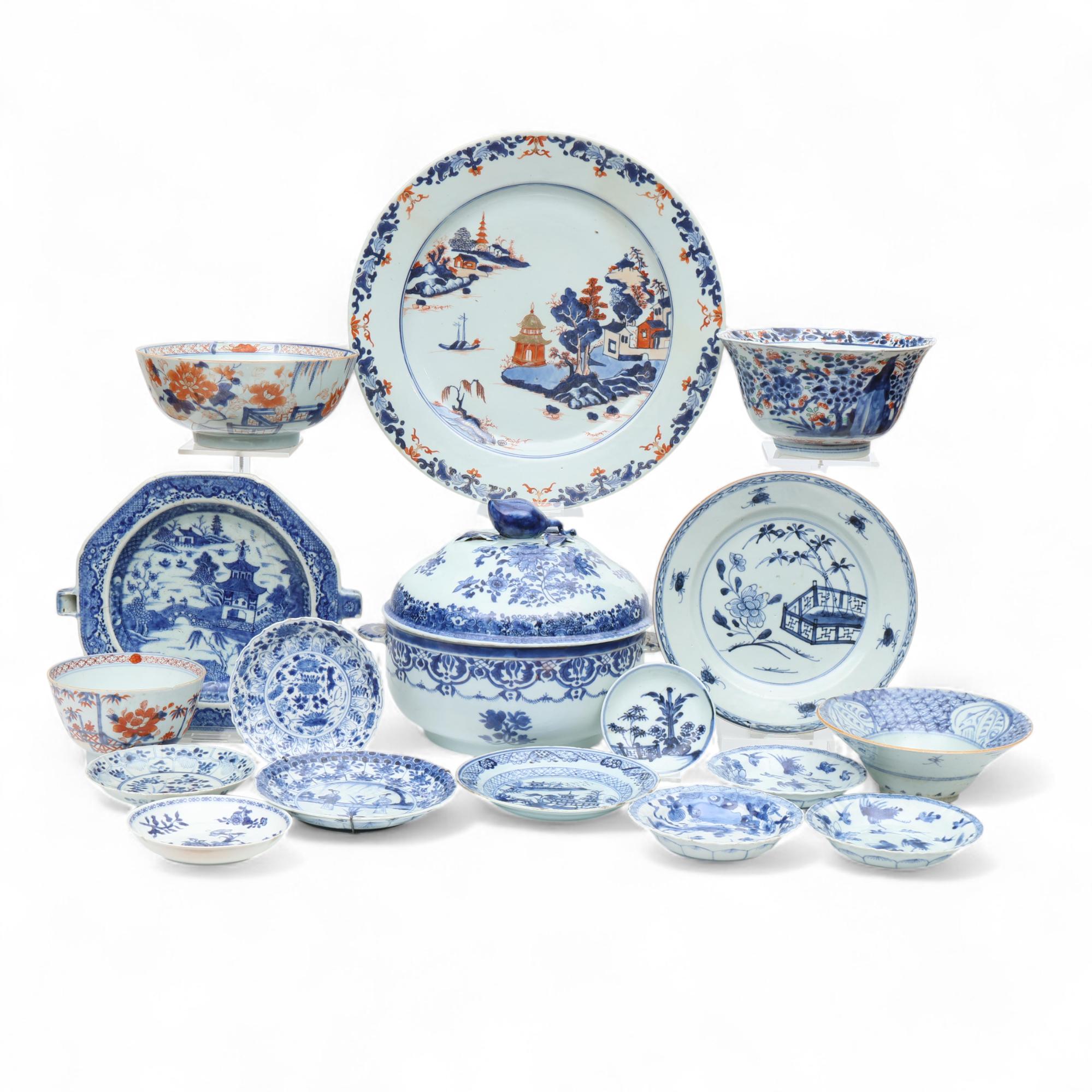 Among them tureen and saucers. Herewith China, Imari bowl and plate. (damages and restorations).
