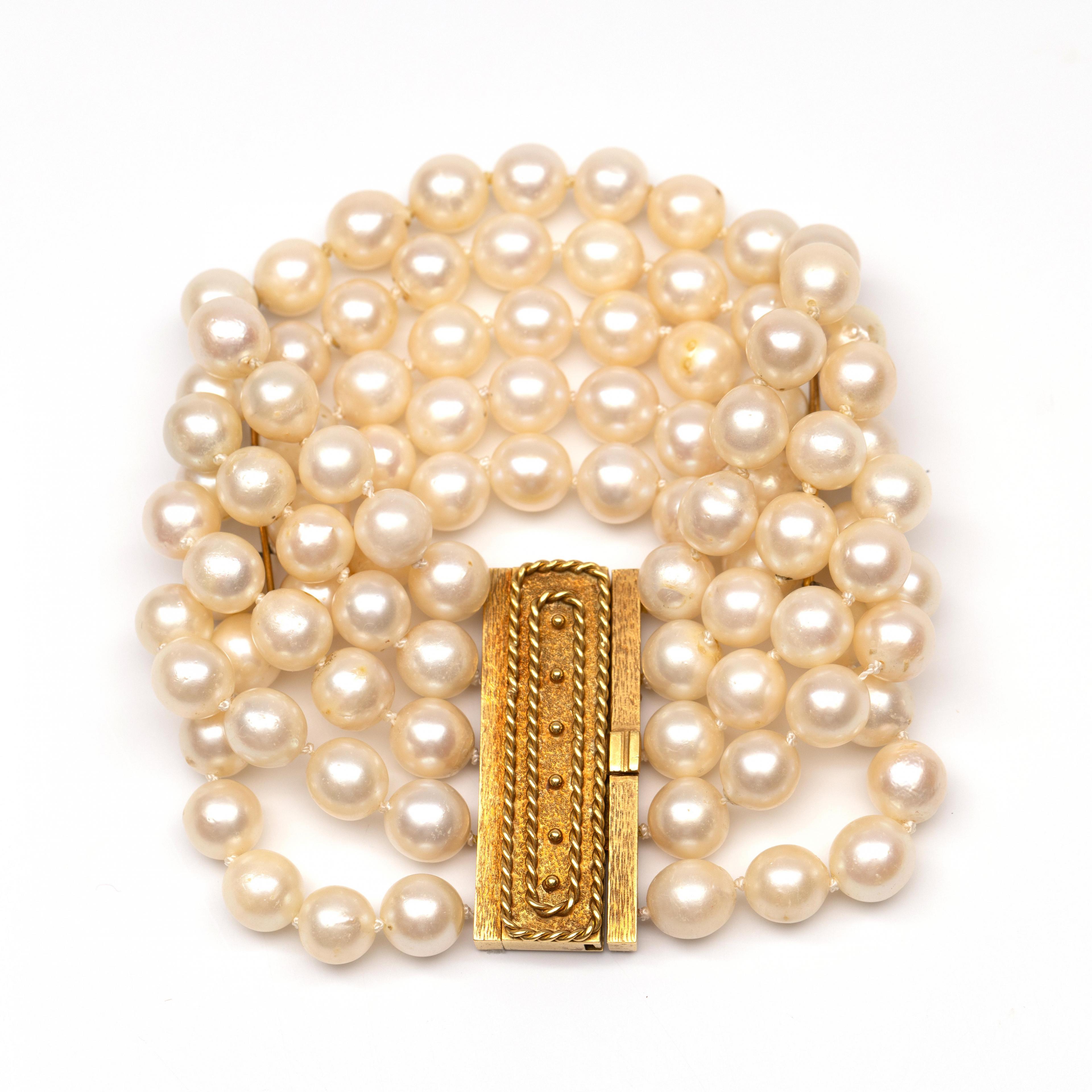 Pearl bracelet with five strands of cultured pearls (approx. 8 mm in diameter), interspersed with two gold bars. On an 18 k. gold box clasp decorated with rope wire.