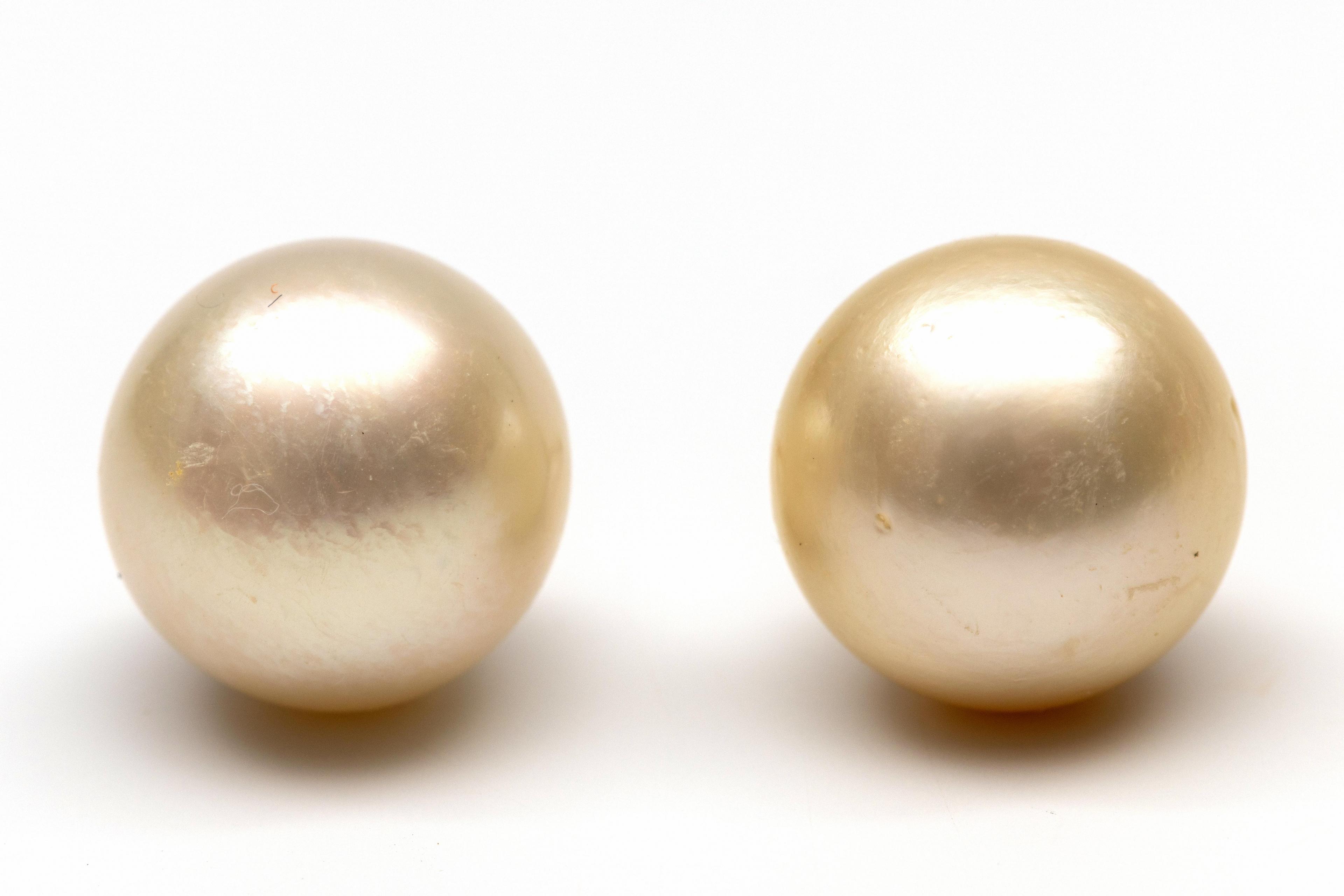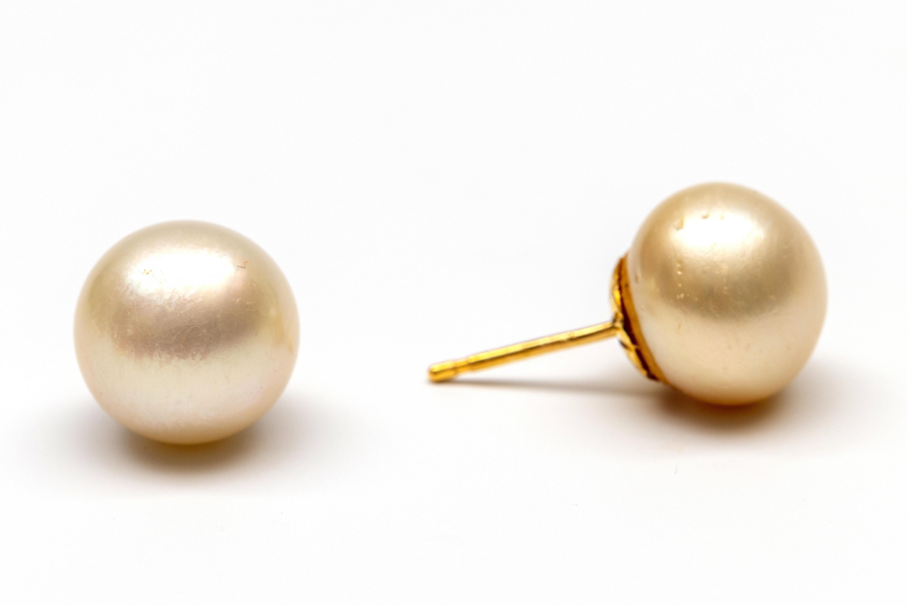 18 k. gold stud earrings. Each set with a white South Sea pearl (approx. 13.5 mm in diameter)