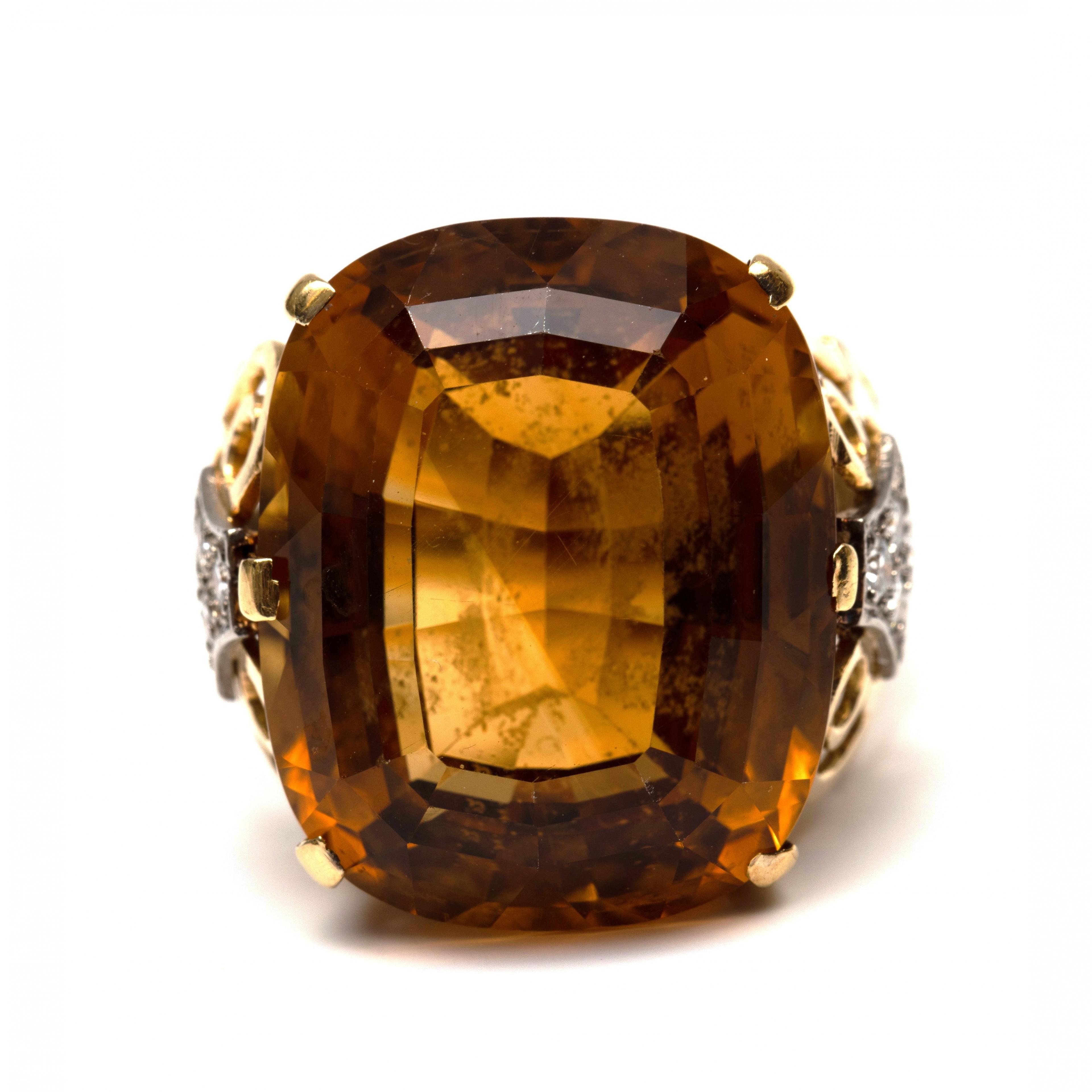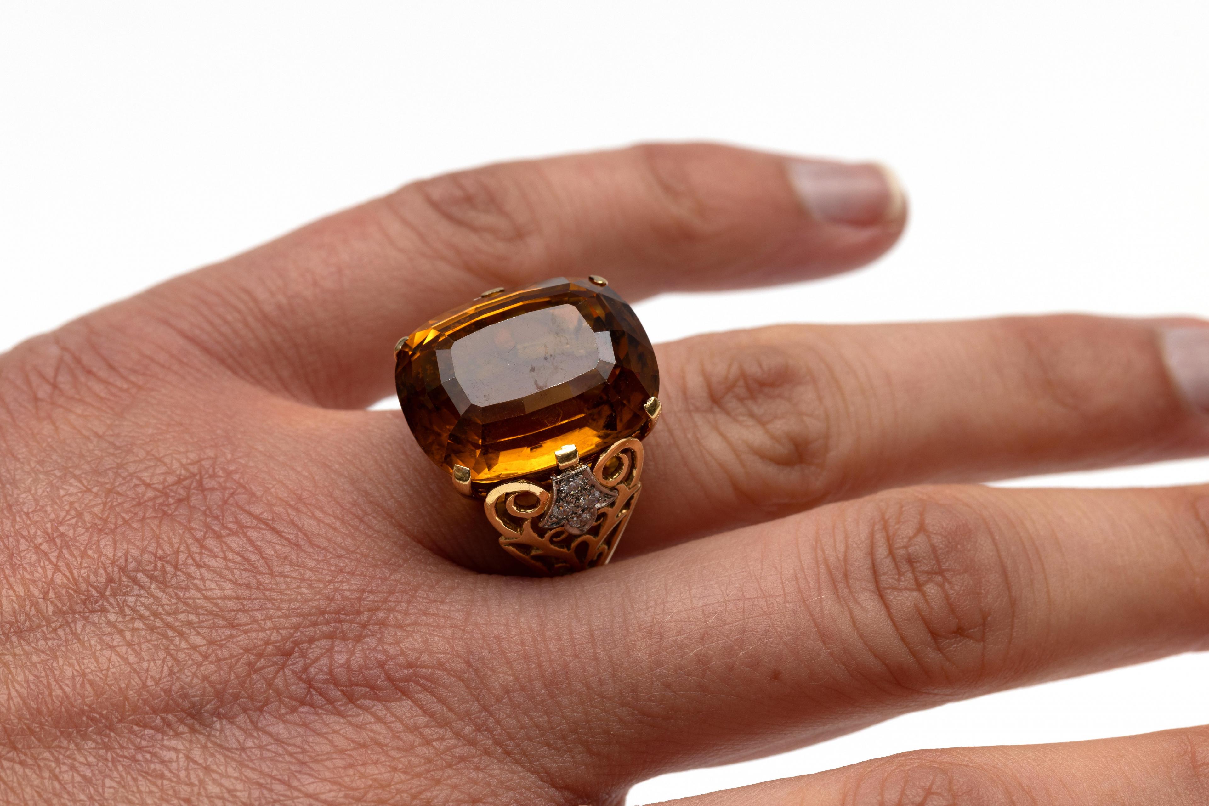 Gold ring set with a cushion-shaped faceted citrine (approx. 21 x 17 mm). The shoulders decorated with scrollwork, on which a white gold leaf-shaped appliqué set with brilliant-cut diamonds weighing approximately 0.20 ct.