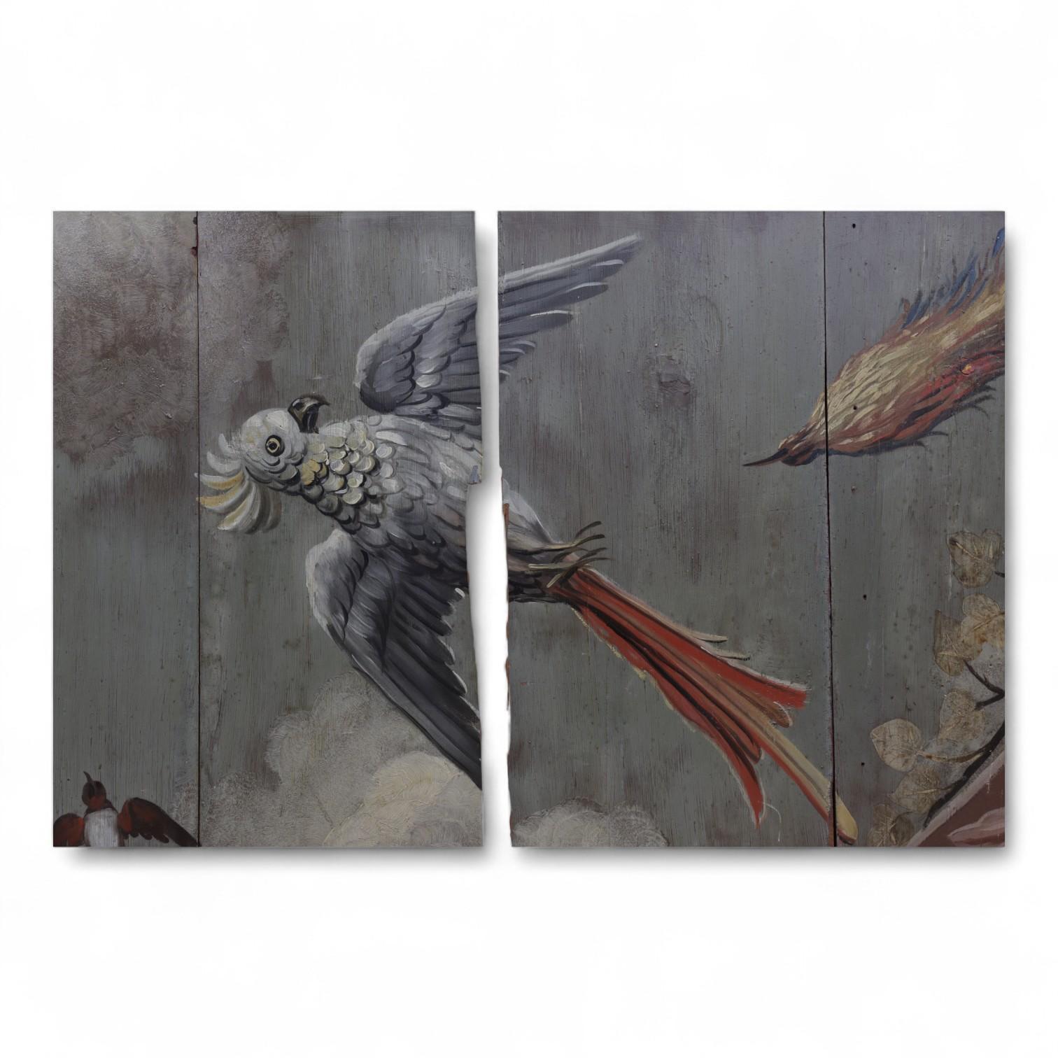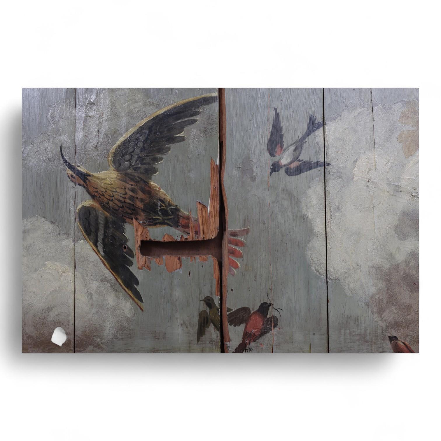 Uitgevoerd met vogels tegen wolkenpartij. Oorspronkelijk uit pand Oudezijds Voorburgwal 187 te Amsterdam.