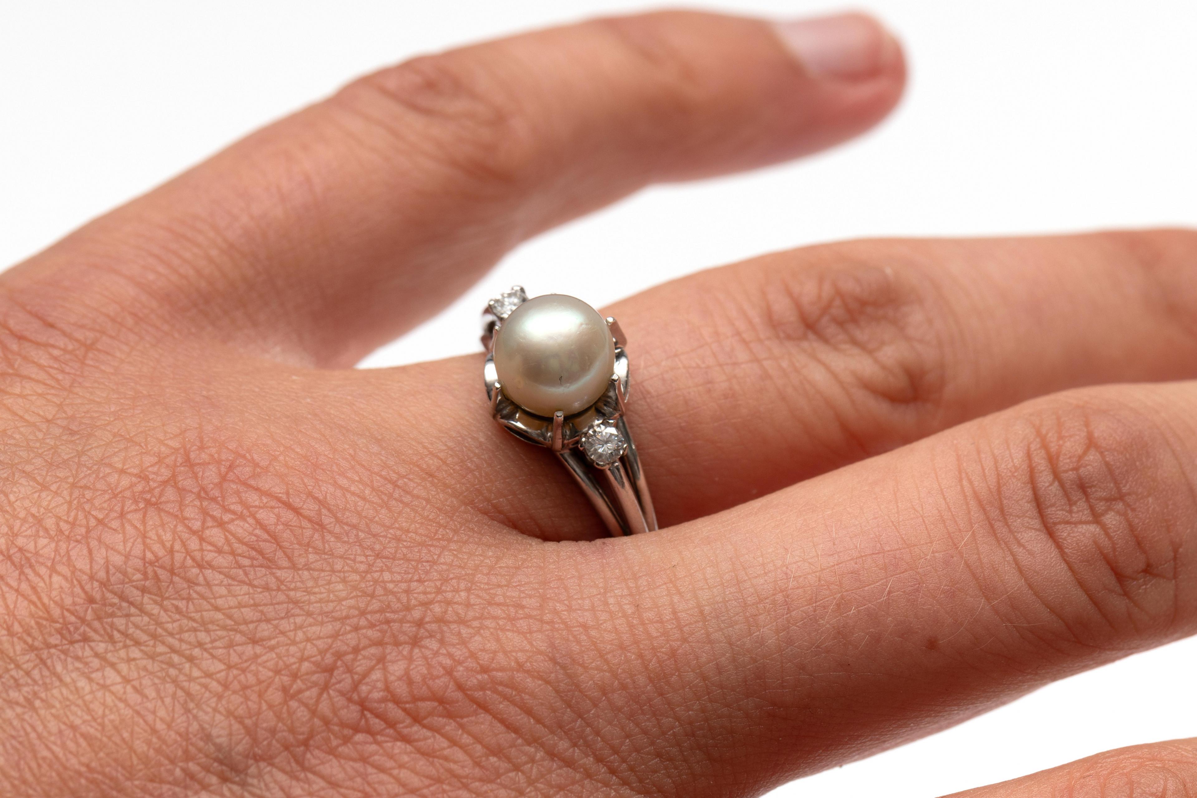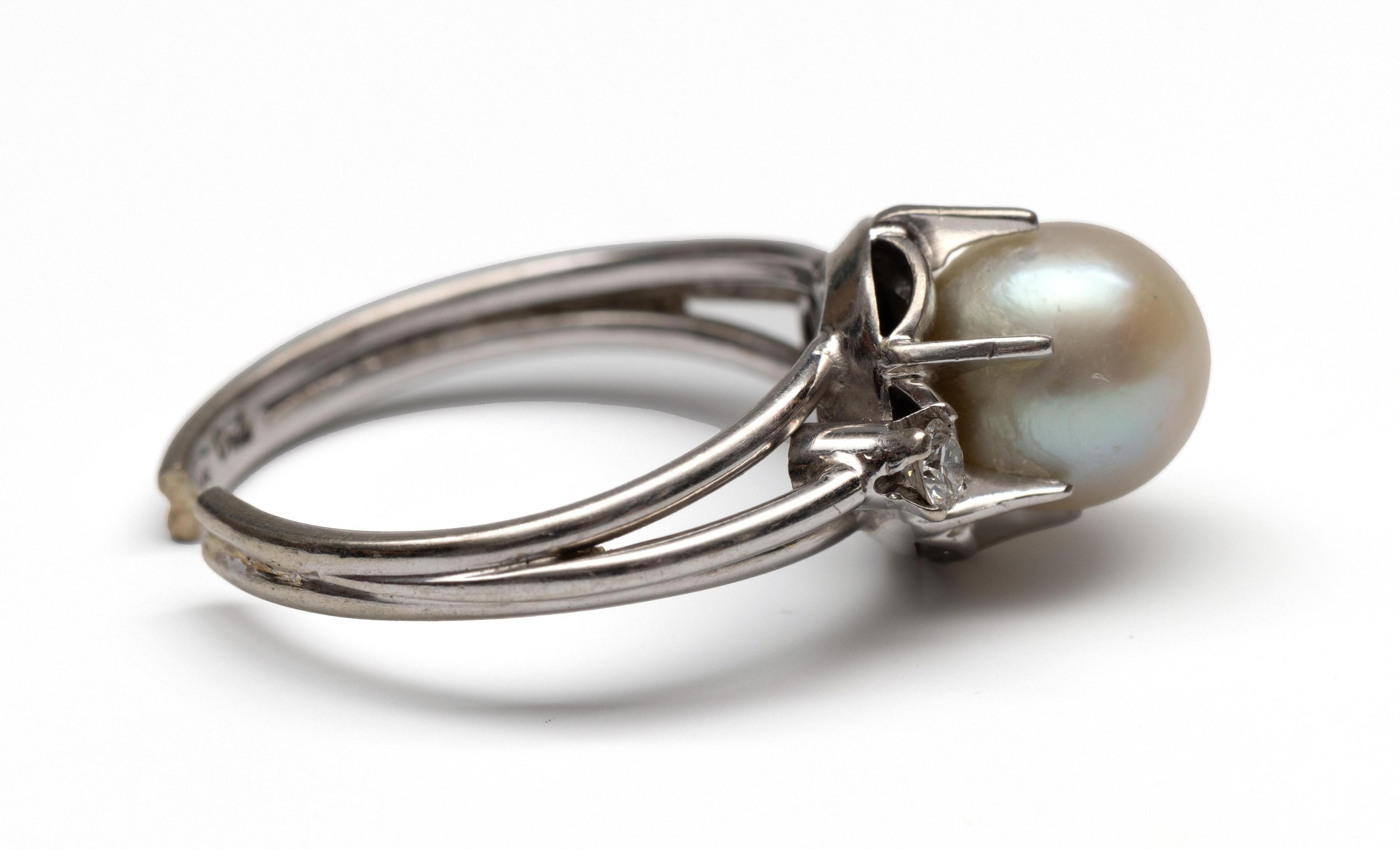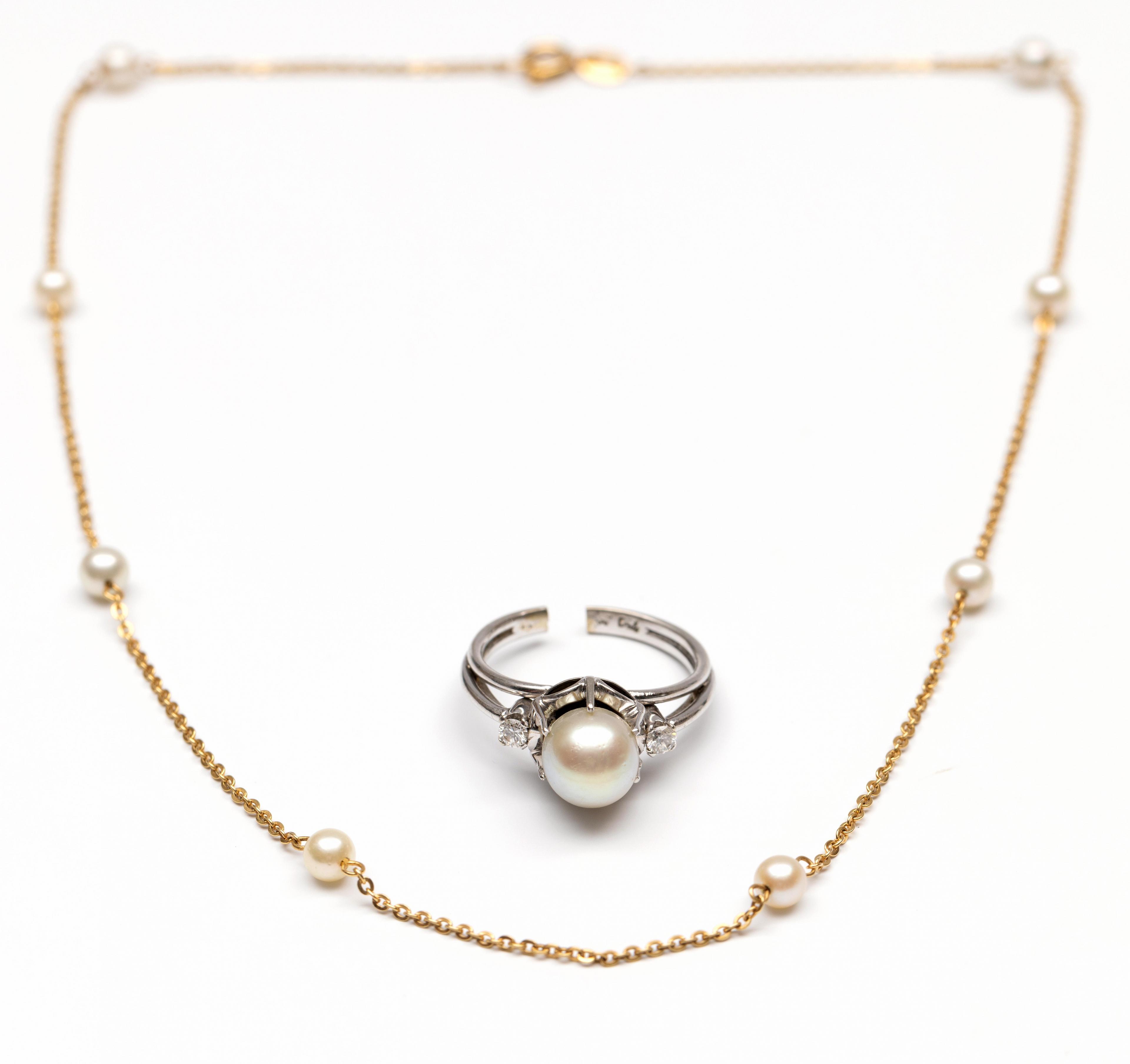 White gold ring, centrally set with a cultured pearl (approx. 8 mm in diameter) flanked by a brilliant-cut diamond weighing approximately 0.10 ct. Herewith a delicate gold cable-link necklace with cultured pearls.