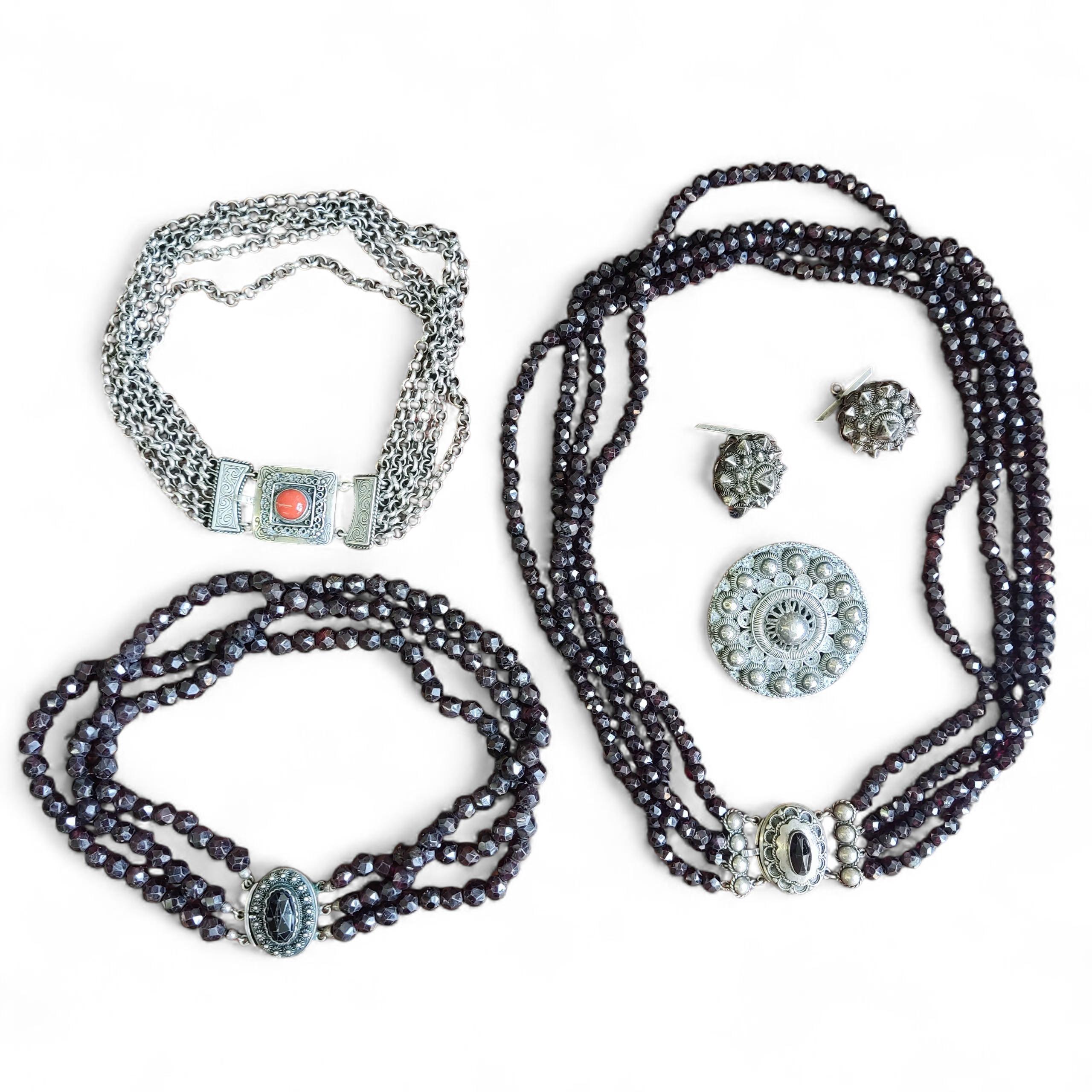 Various silver Dutch regional jewelry: two necklaces with faceted garnet beads on a box clasp set with garnet, a necklace of four turns of belcher links on a box clasp set with coral, a pair of cufflinks, and a brooch with a Zeeland knot.