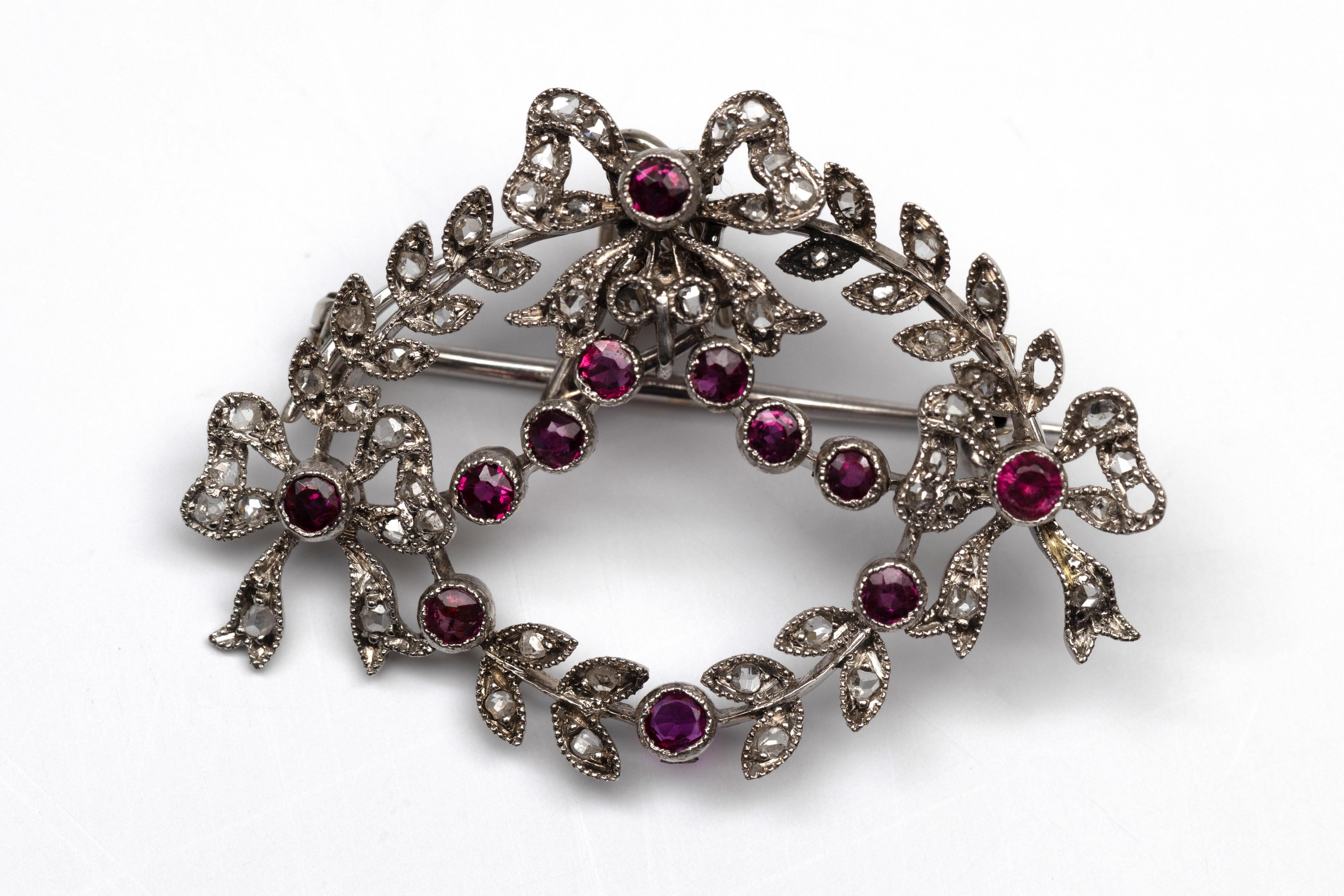 In de vorm van een guirlande afgewerkt met strikken. Bezet met kleine gefacetteerde robijn en roosgeslepen diamant. De brochering demontabel
