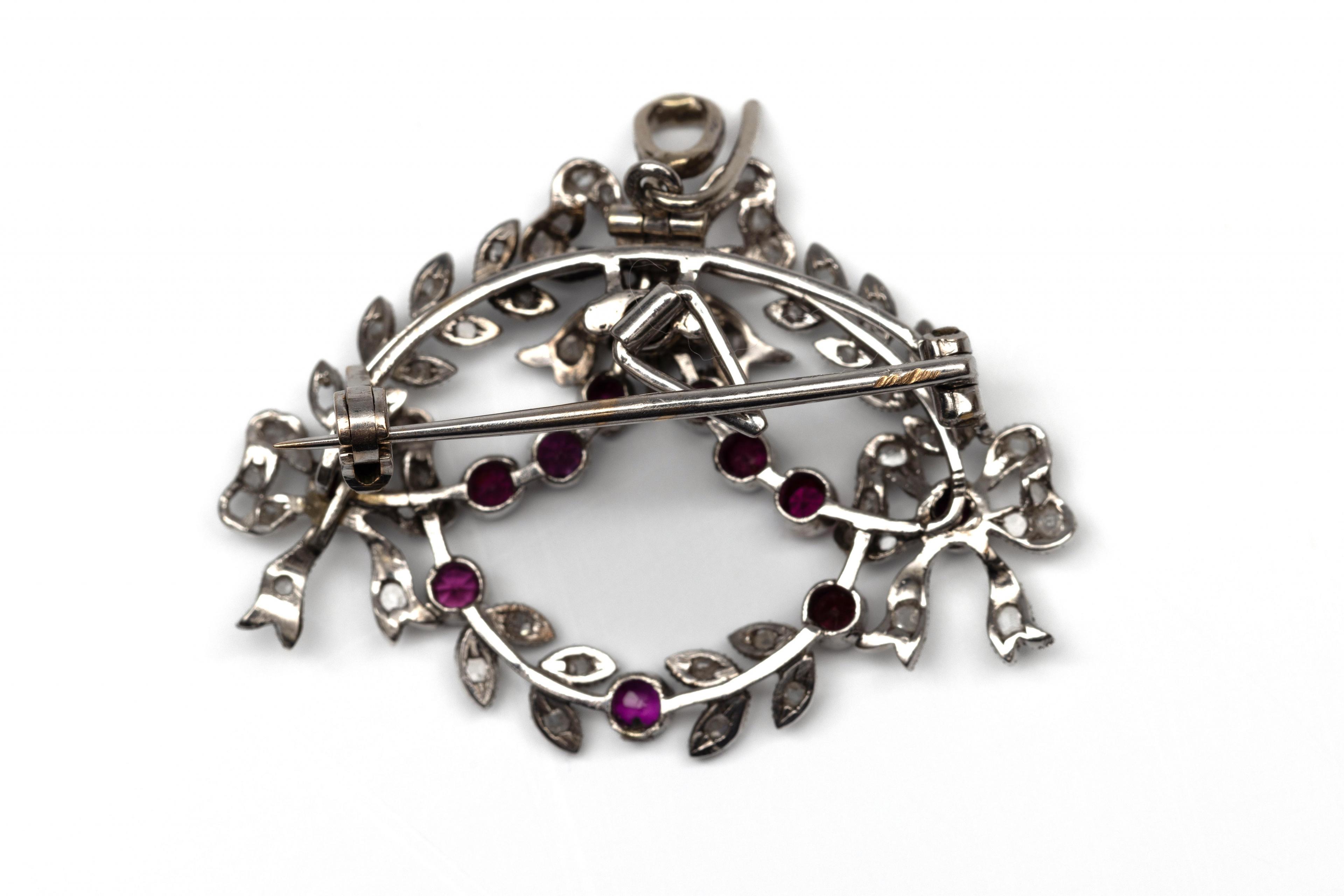 Platinum brooch / pendant, Belle Epoque. In the shape of a garland, decorated with bows. Set with small faceted ruby and rose-cut diamond. The brooching detachable.
