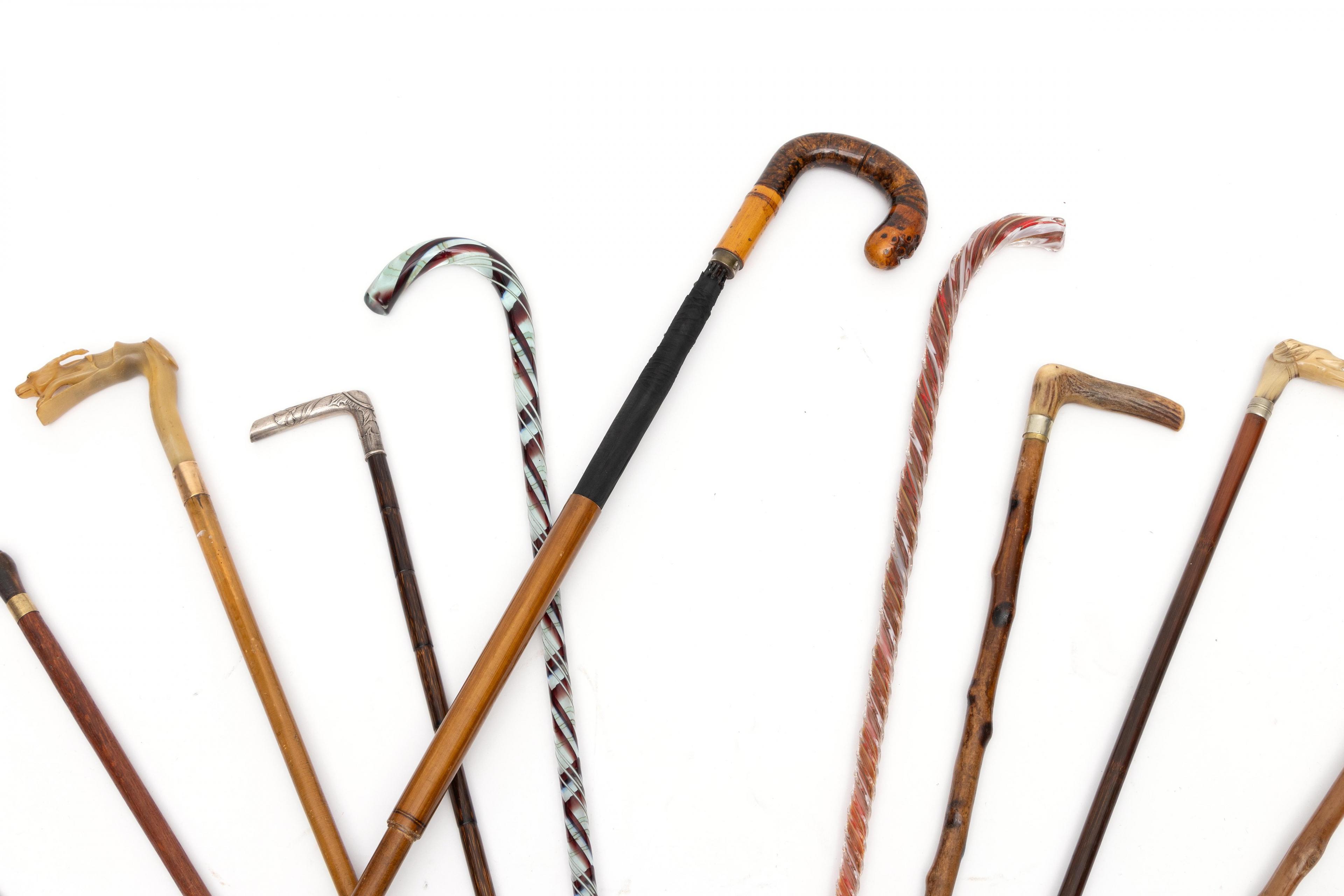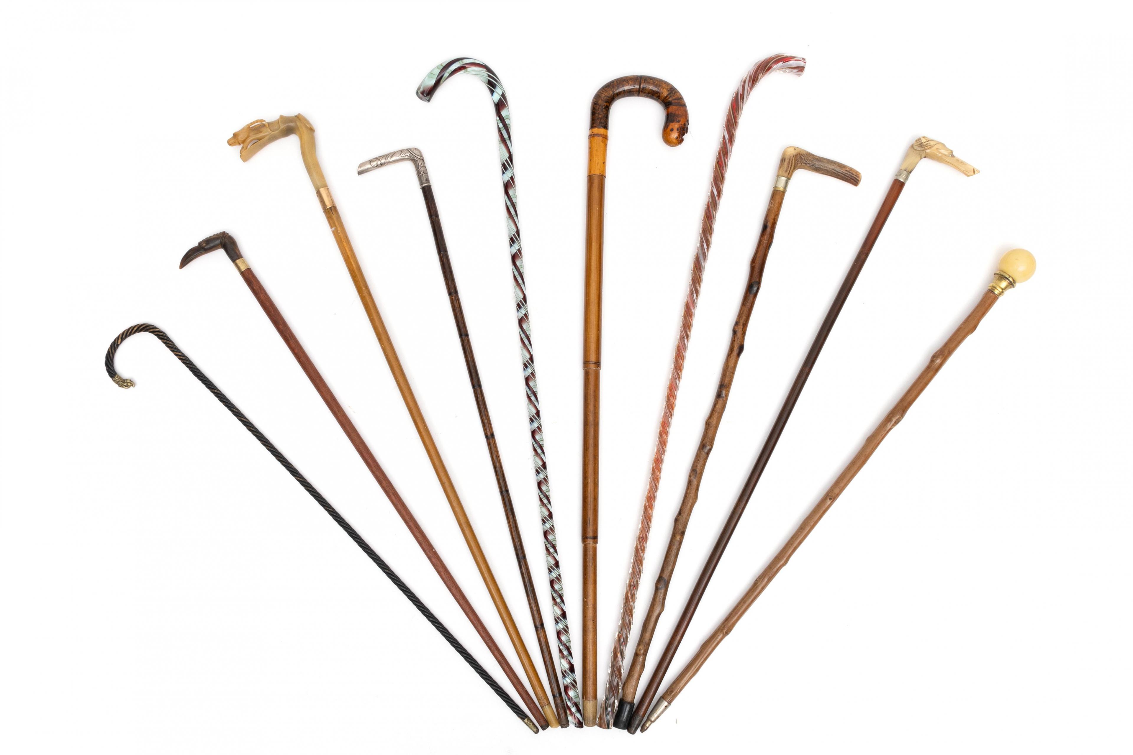 w.o. wandelstok met paraplu, met zilveren Jugendstil greep, twee wandelstokken van glas en wandelstokken met hoornen grepen.