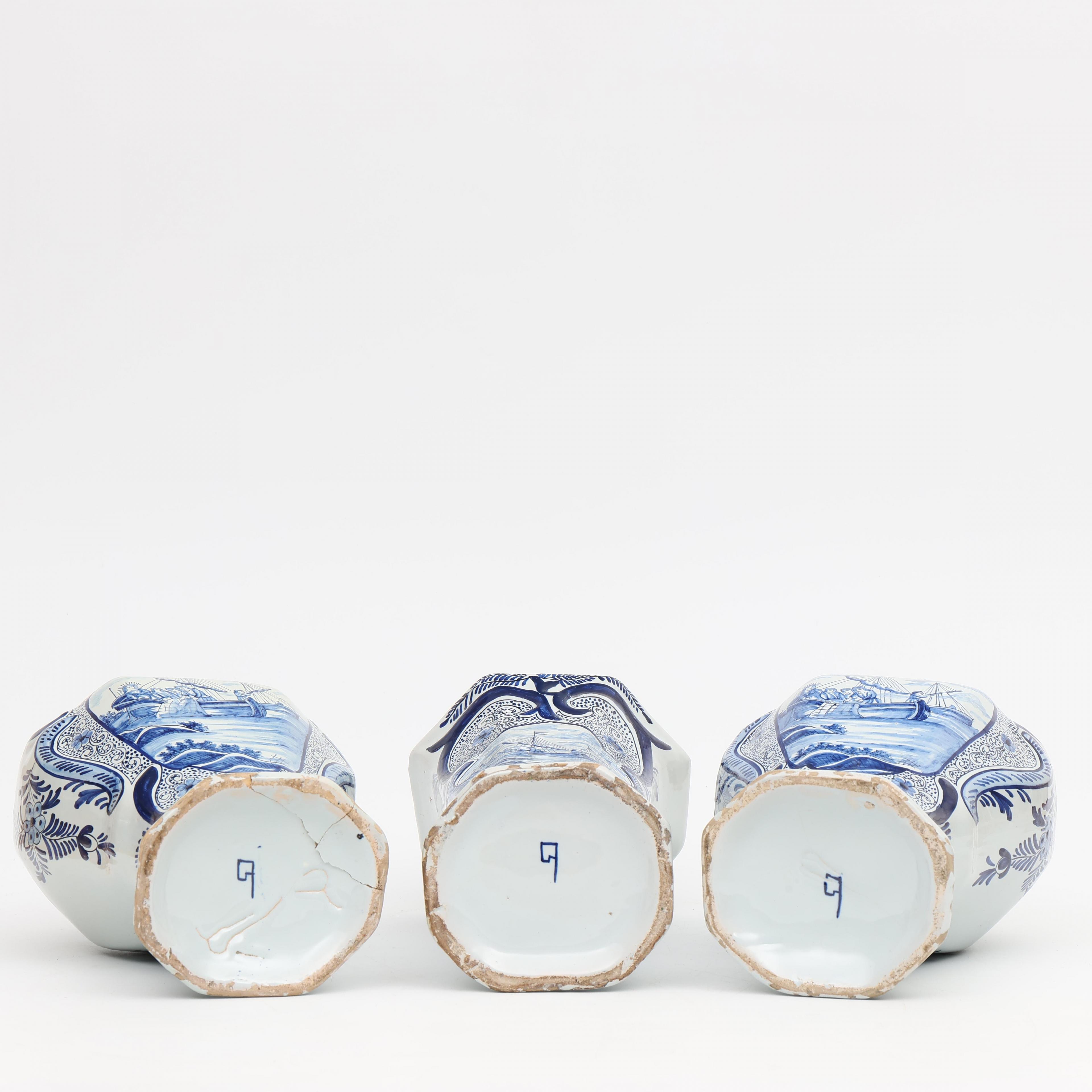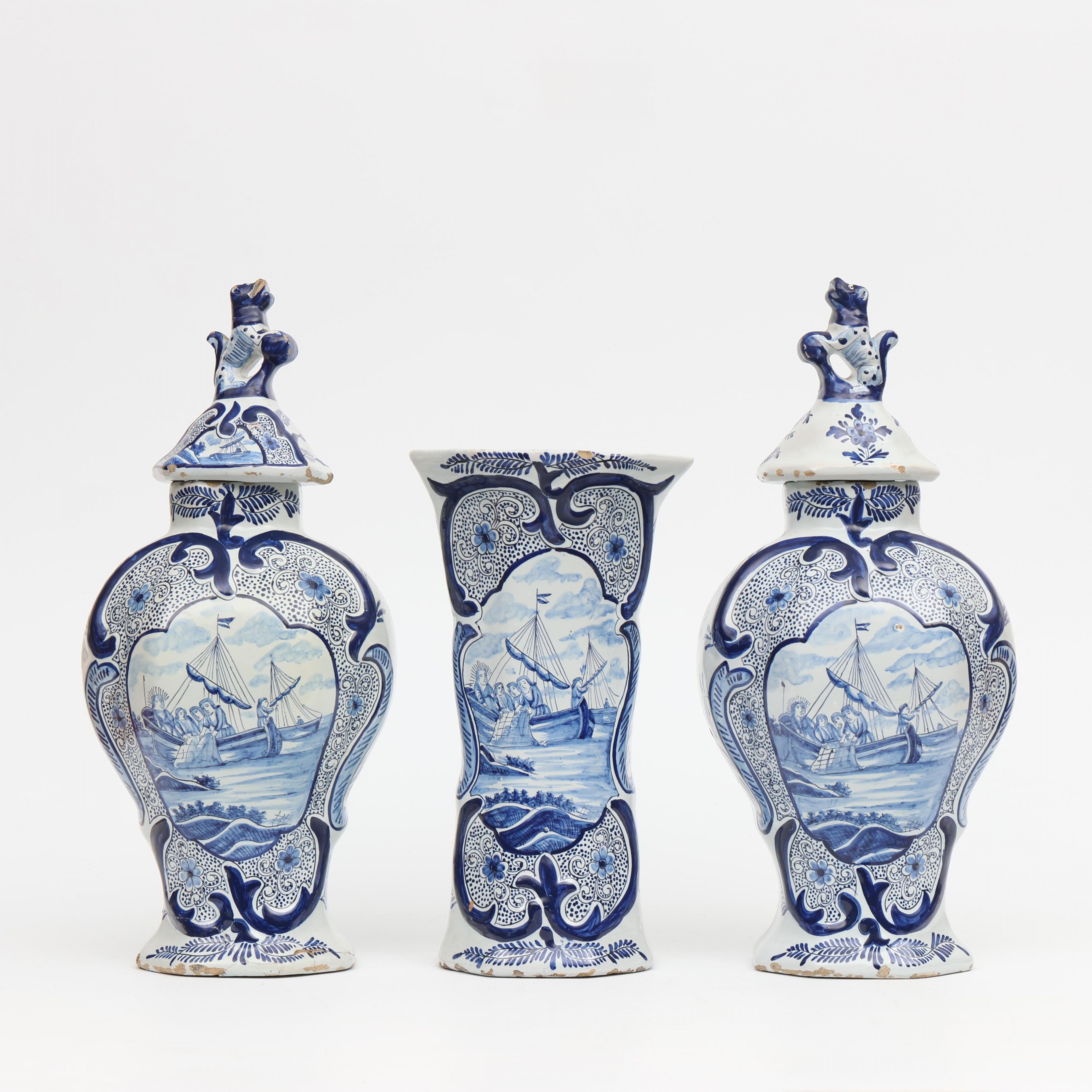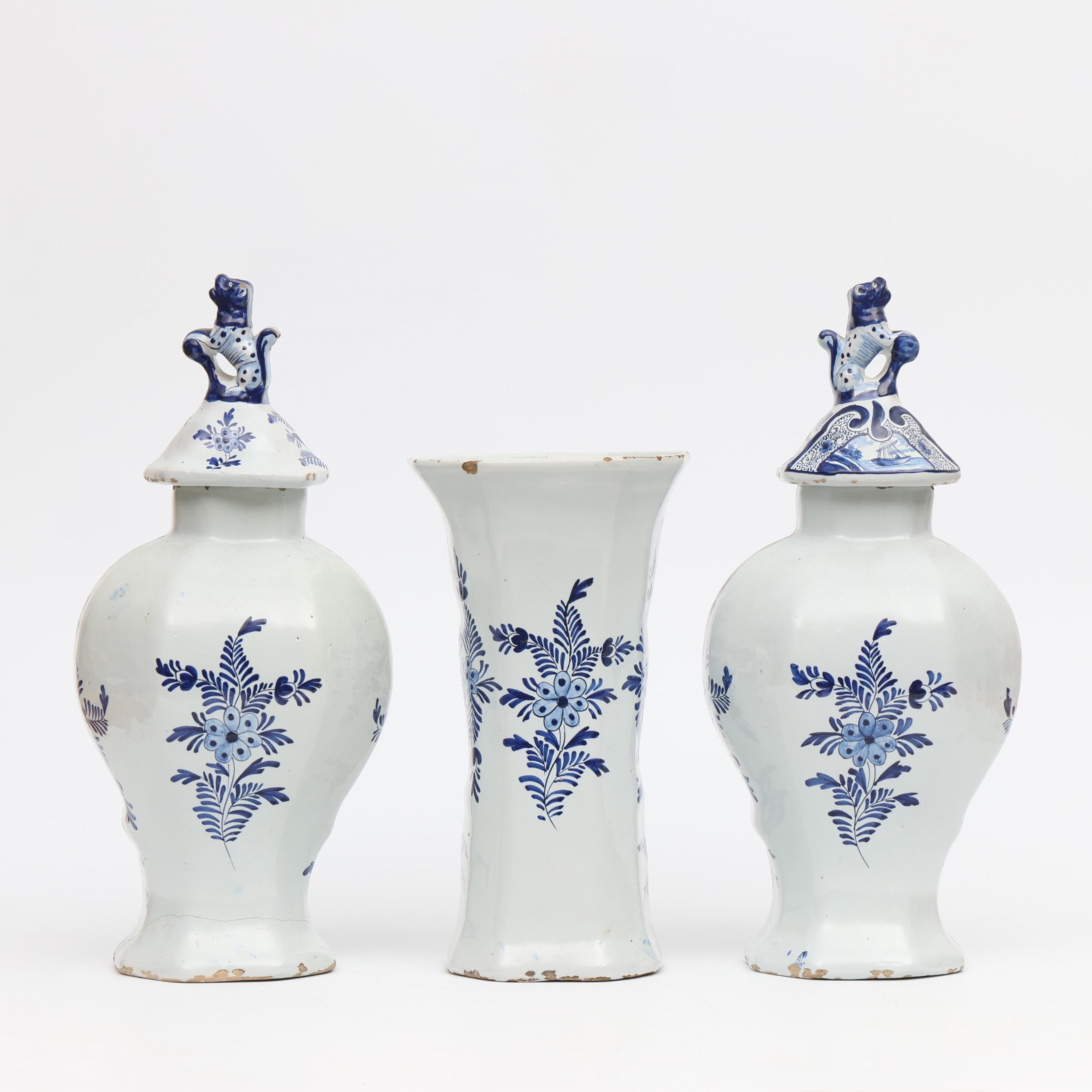 Delft, driedelig blauw wit aardewerk kaststel, laat 19e eeuw;