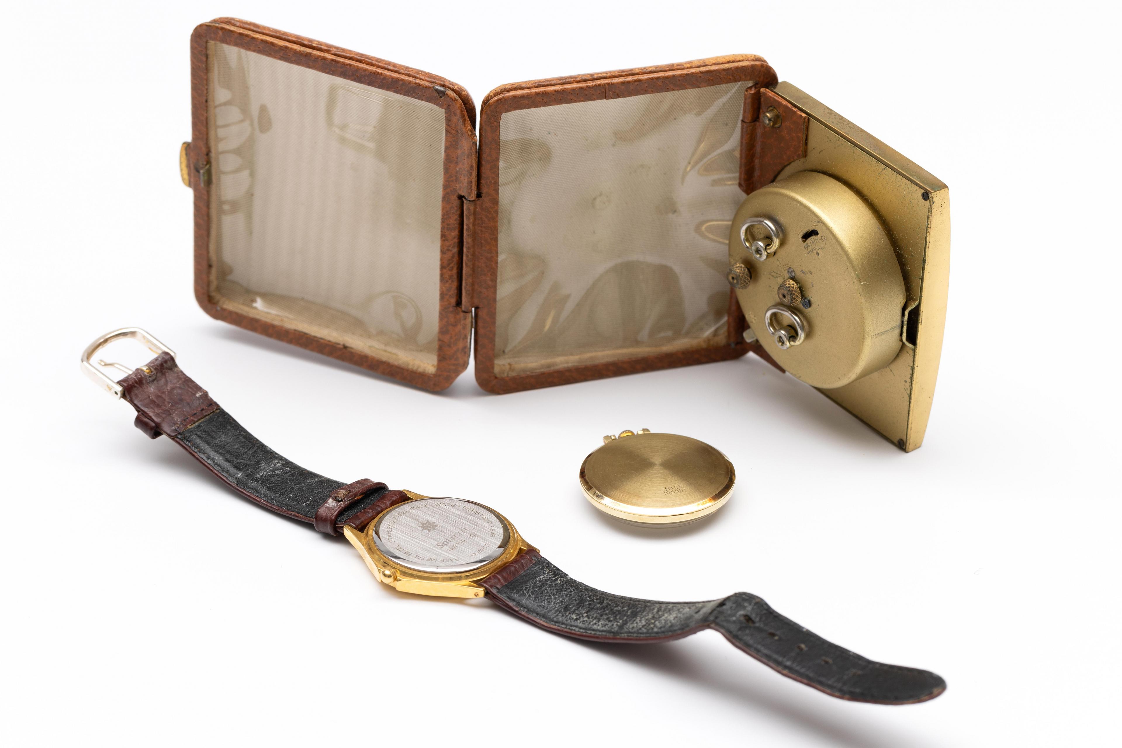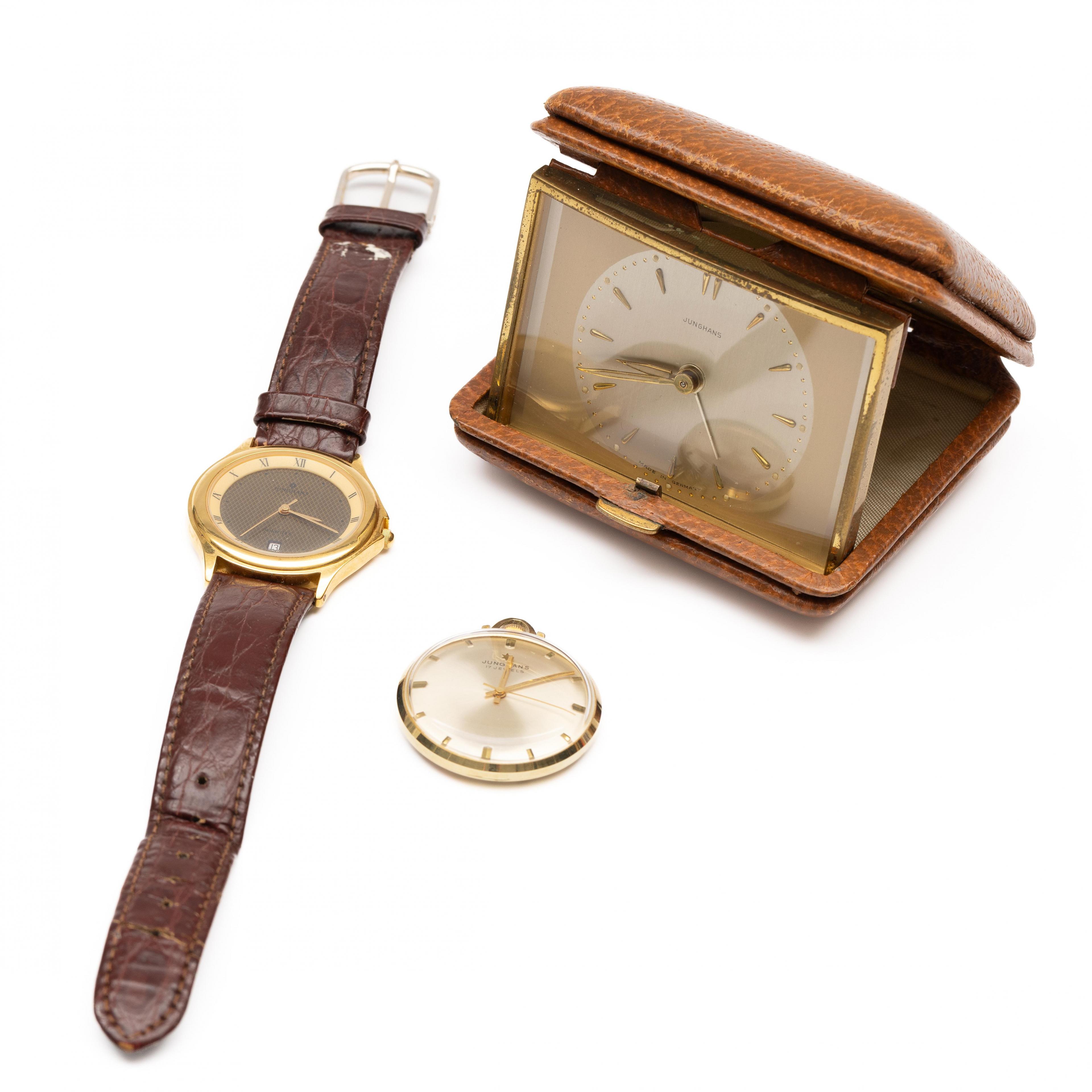 Junghans, 14 k. gold pocket watch. With a gold-tone dial and batons at the hours. Herewith a gold-plated wristwatch and a travel alarm clock, both Junghans.