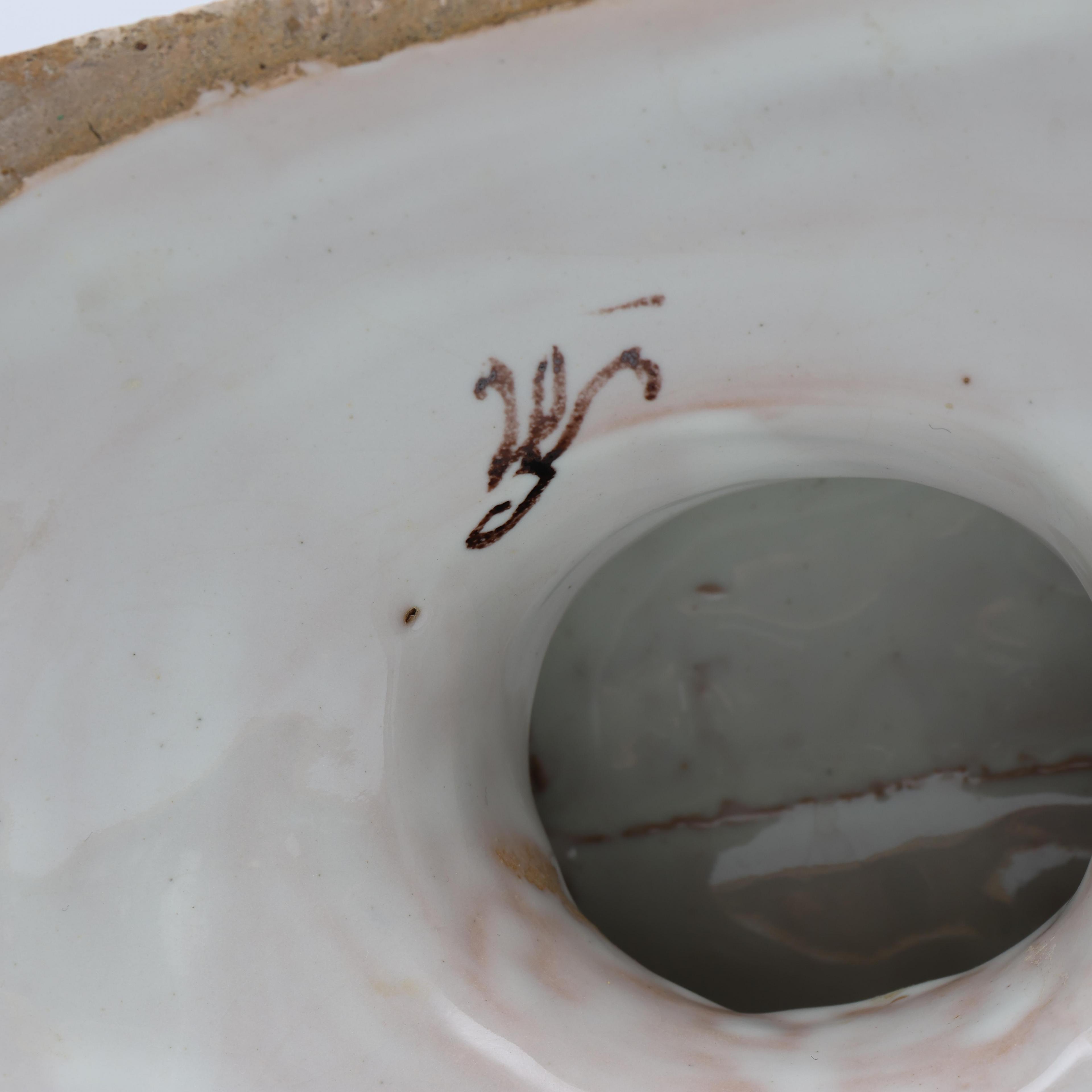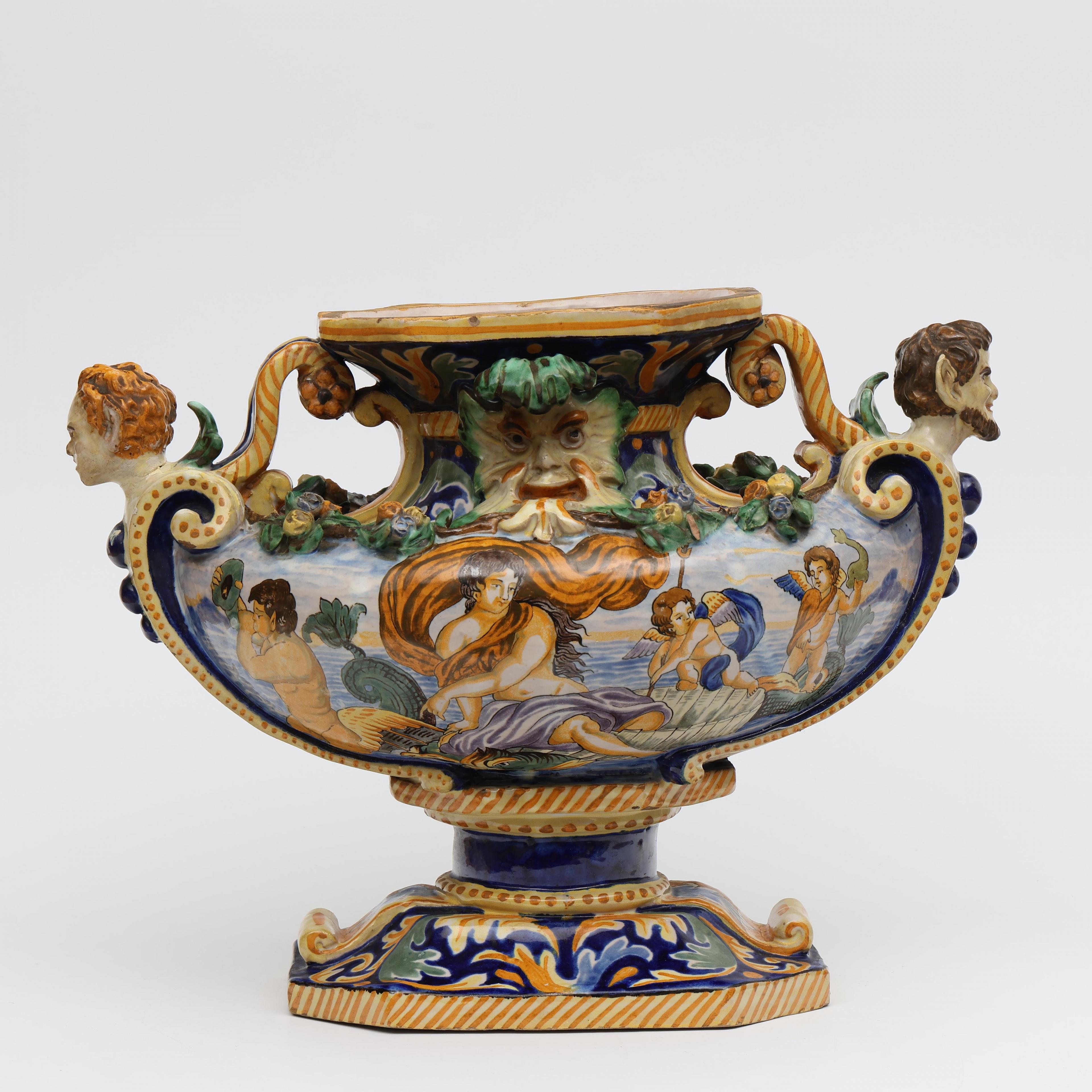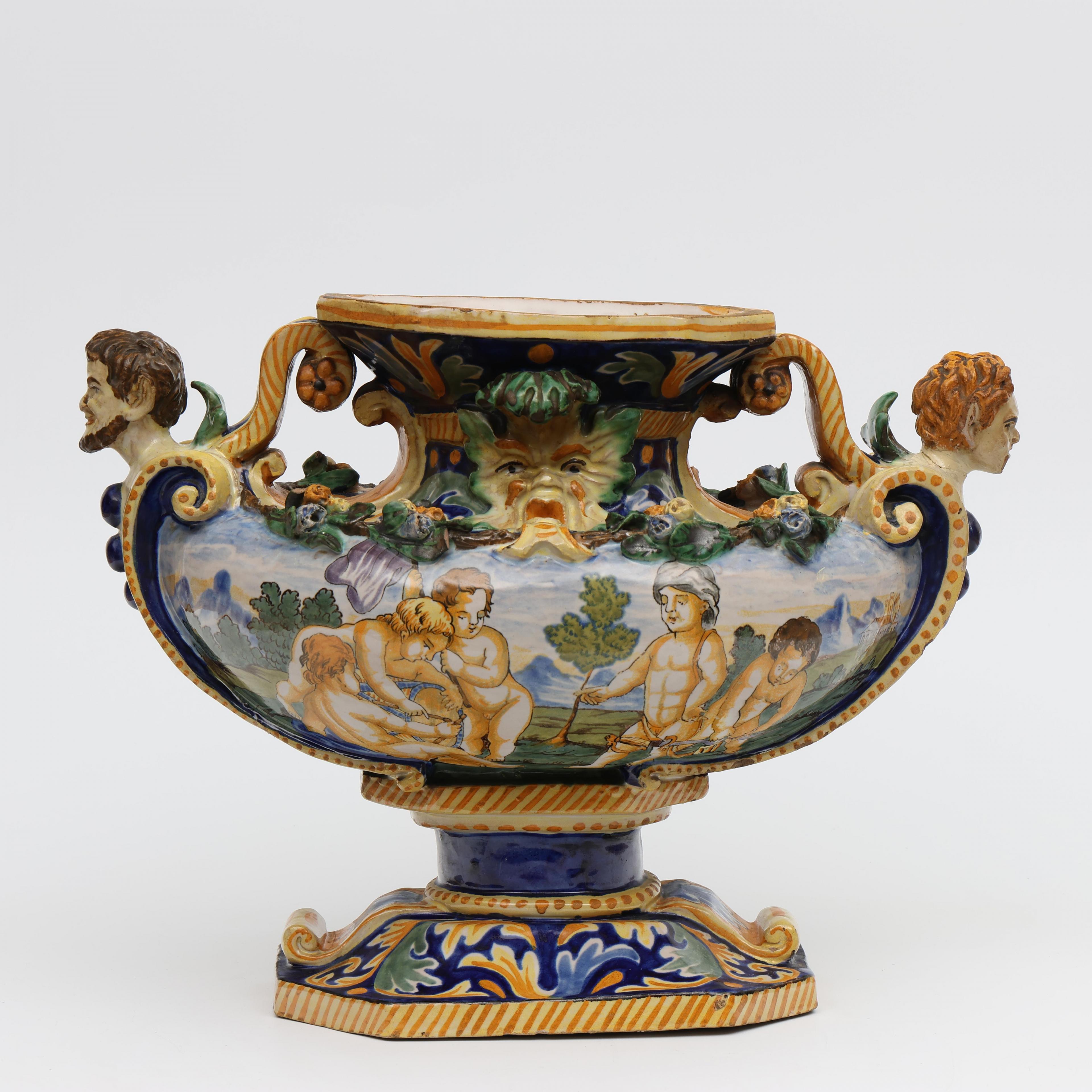 Uitgevoerd met gemodelleerde oren, schilderingen van putti en venus in landschappen. Onderzijde gemerkt. (een van de oren gelijmd).