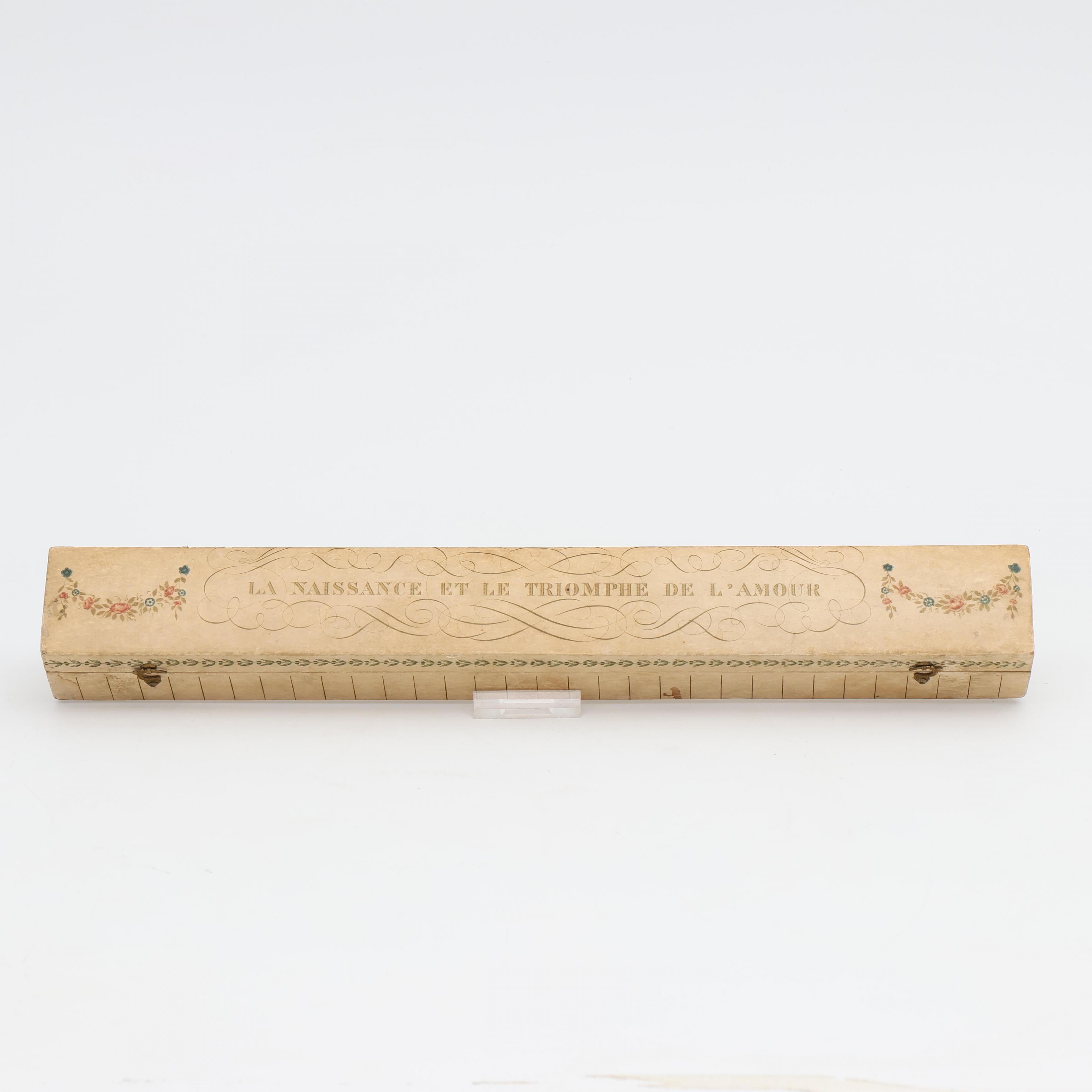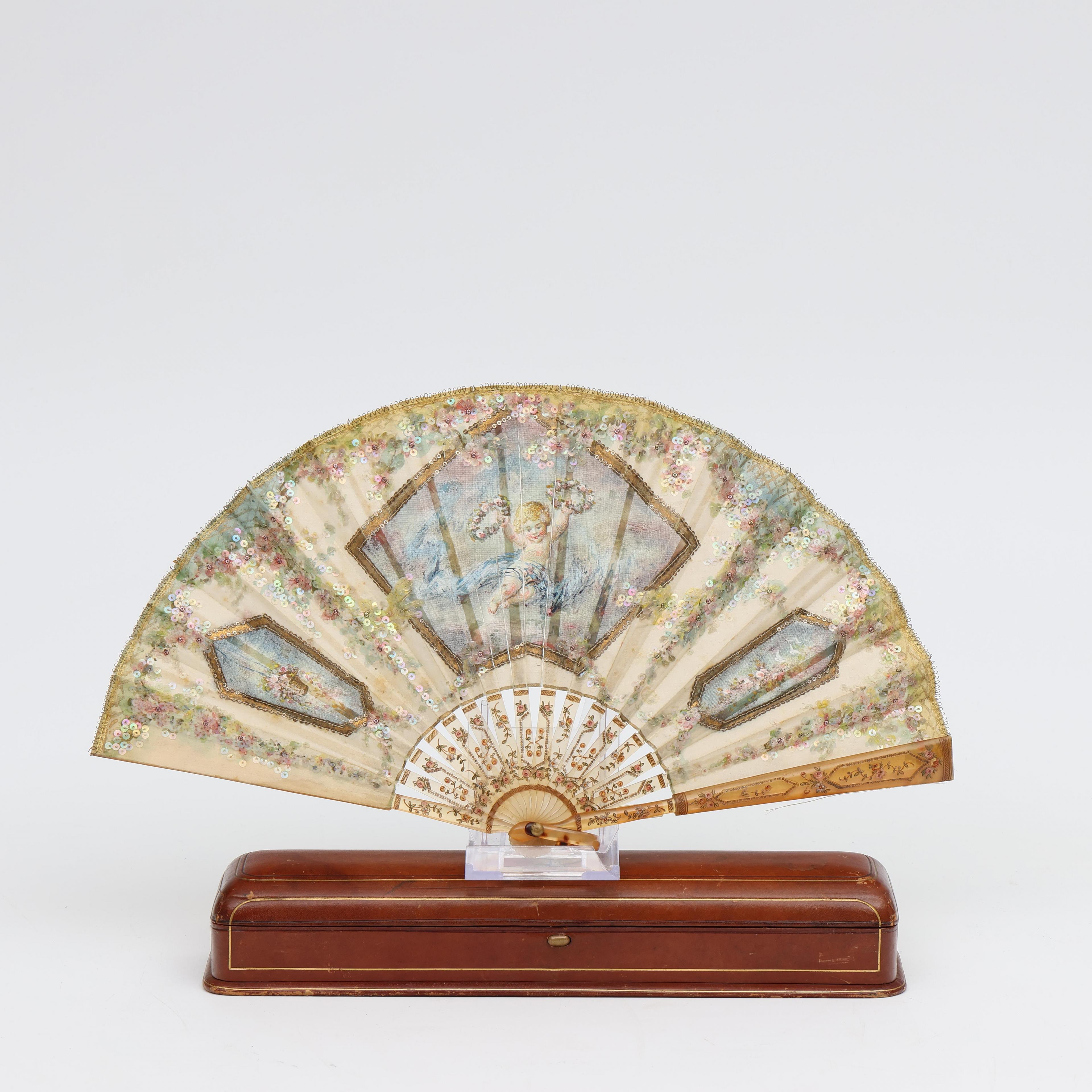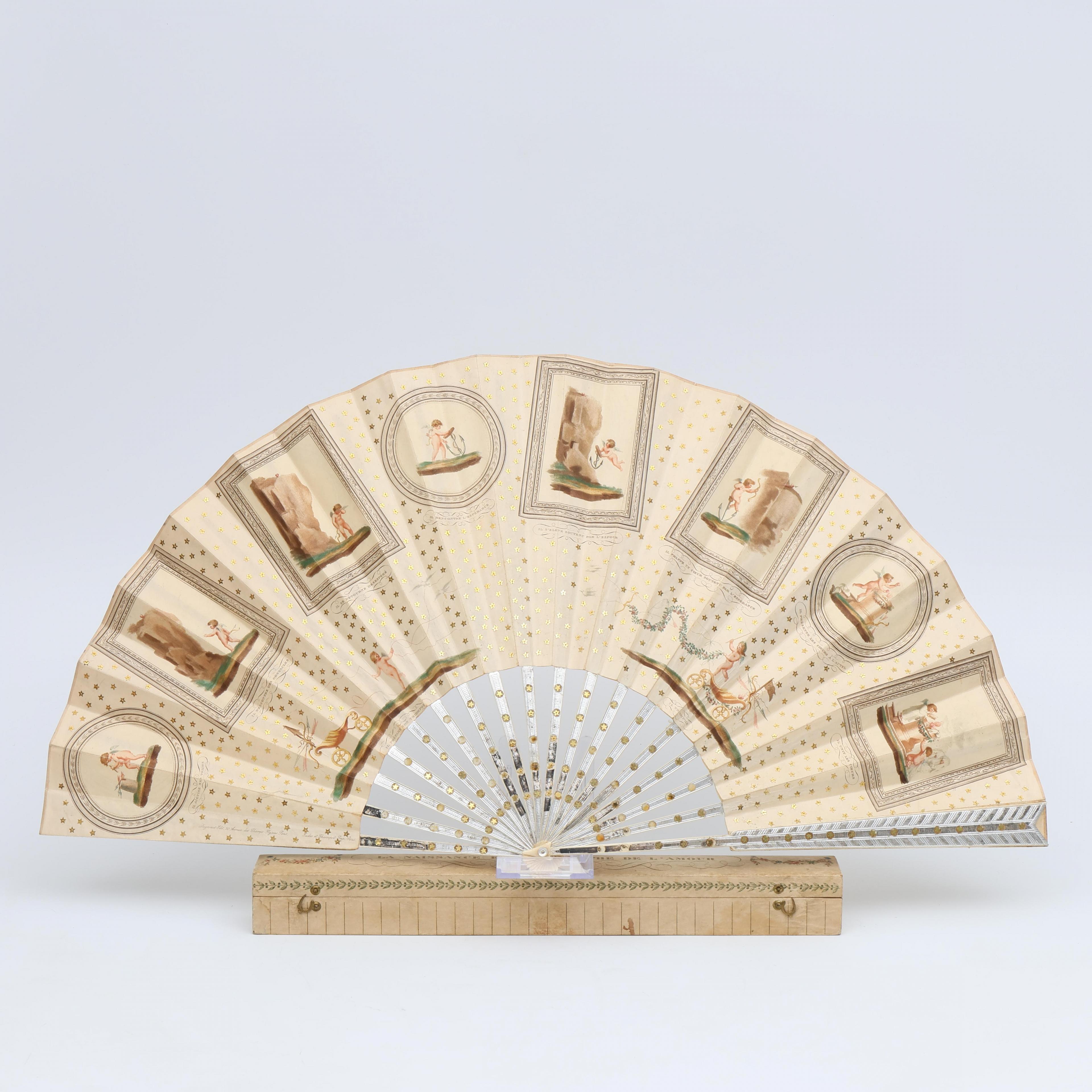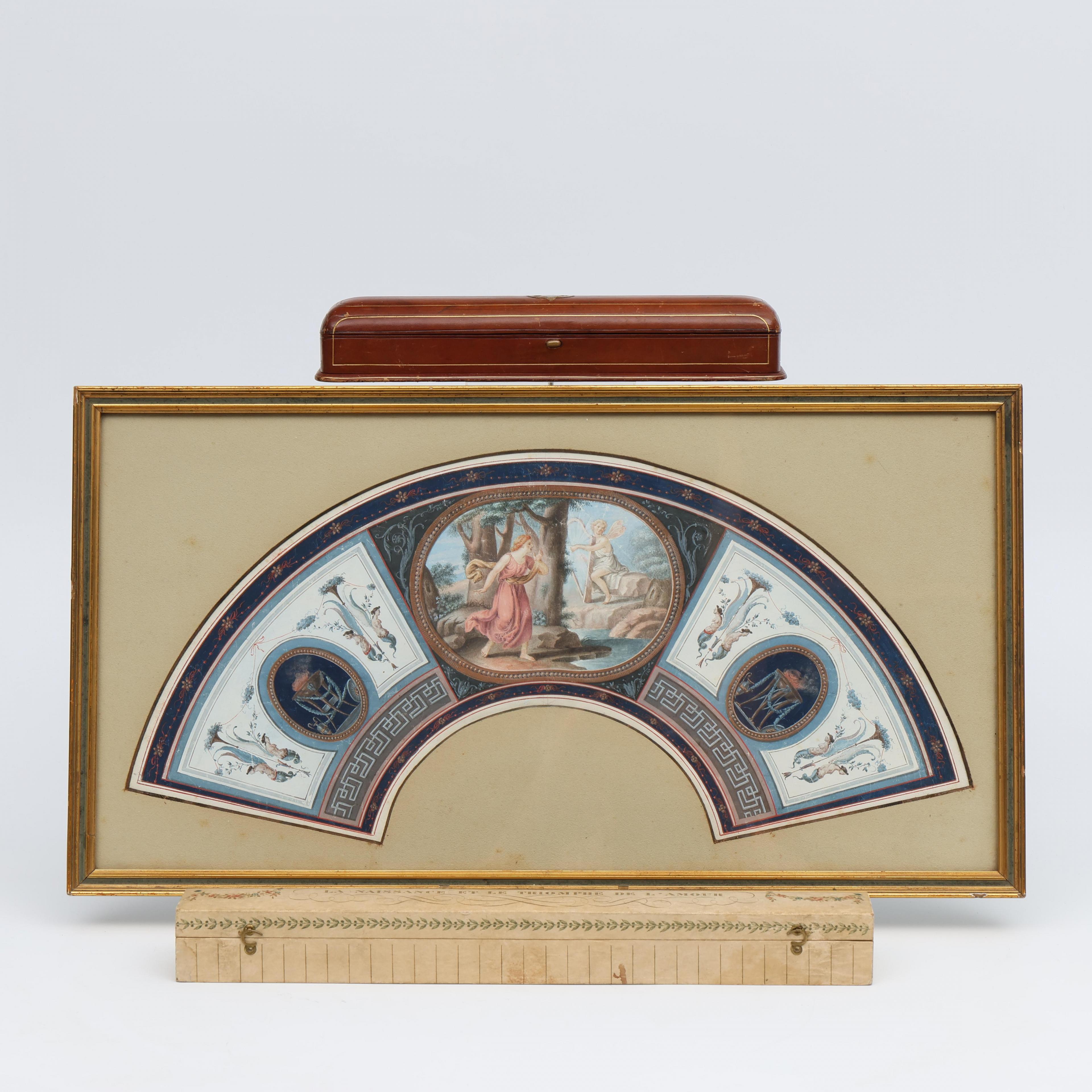 Ontwerp met voorstelling van klassiek figuur met putto, geflankeerd door parfumbranders, ingelijst. De waaiers beide in doosje, 'La Naissance et le Triomphe de L'Amour.