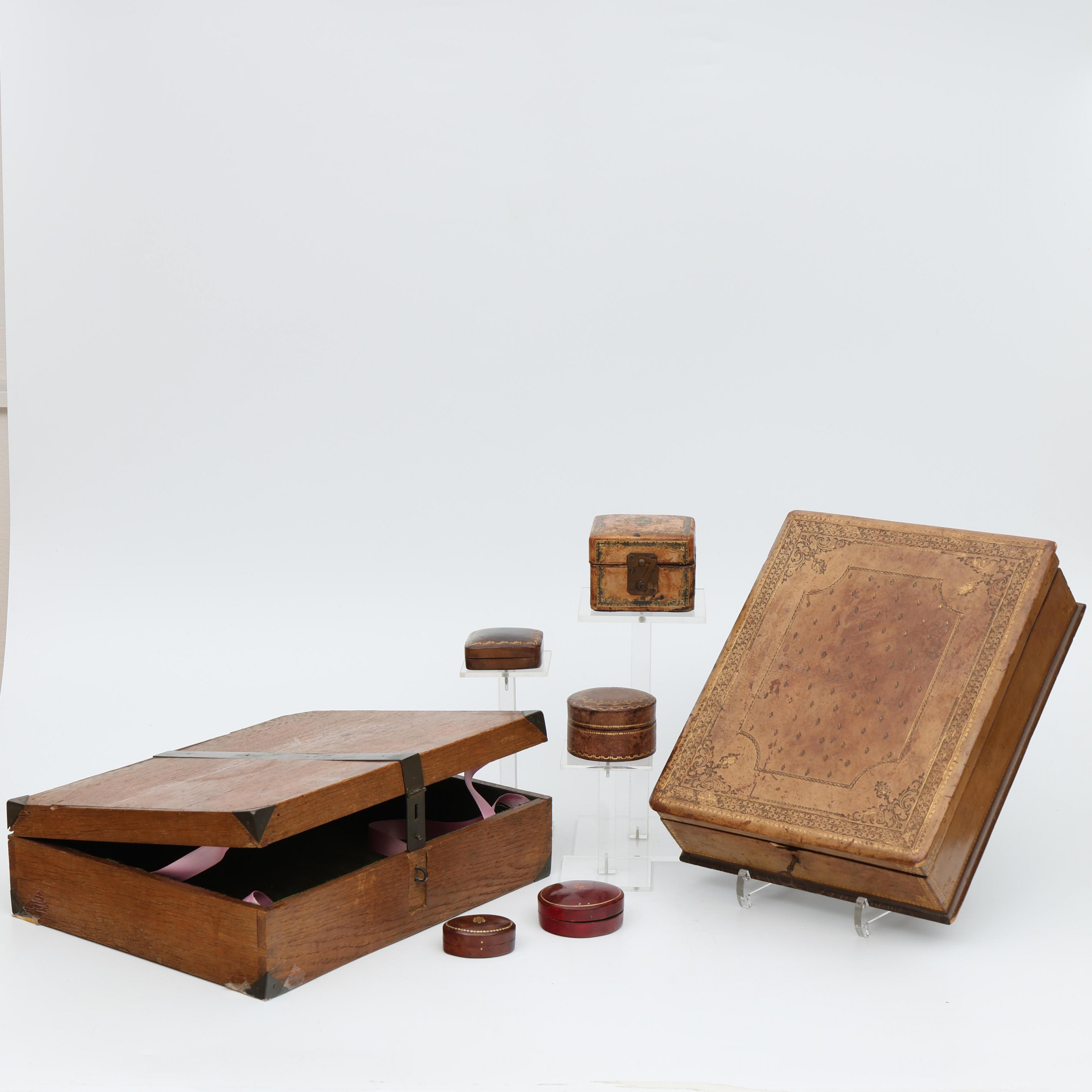 een overtrokken met leer. Hierbij diverse leren sieraden doosjes.