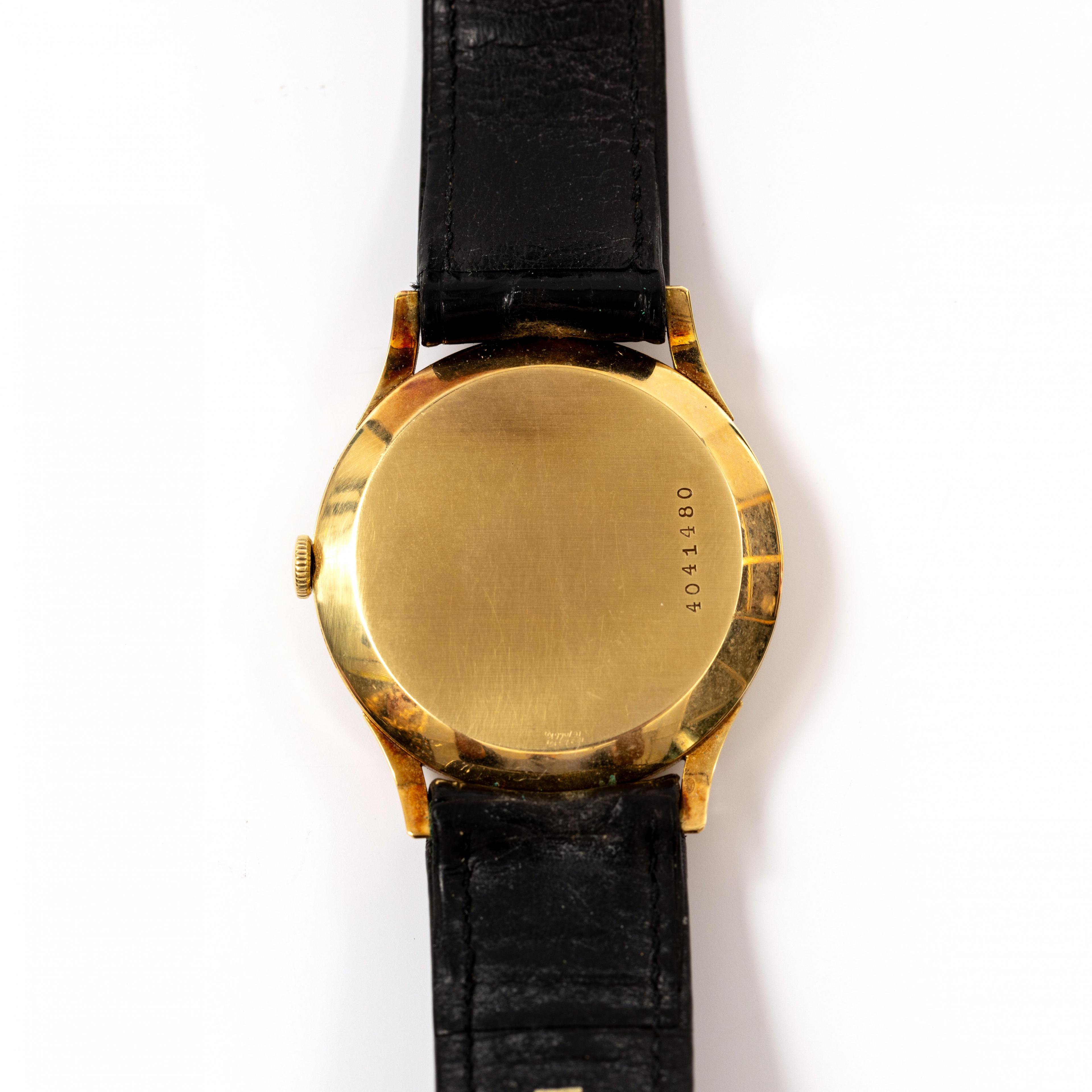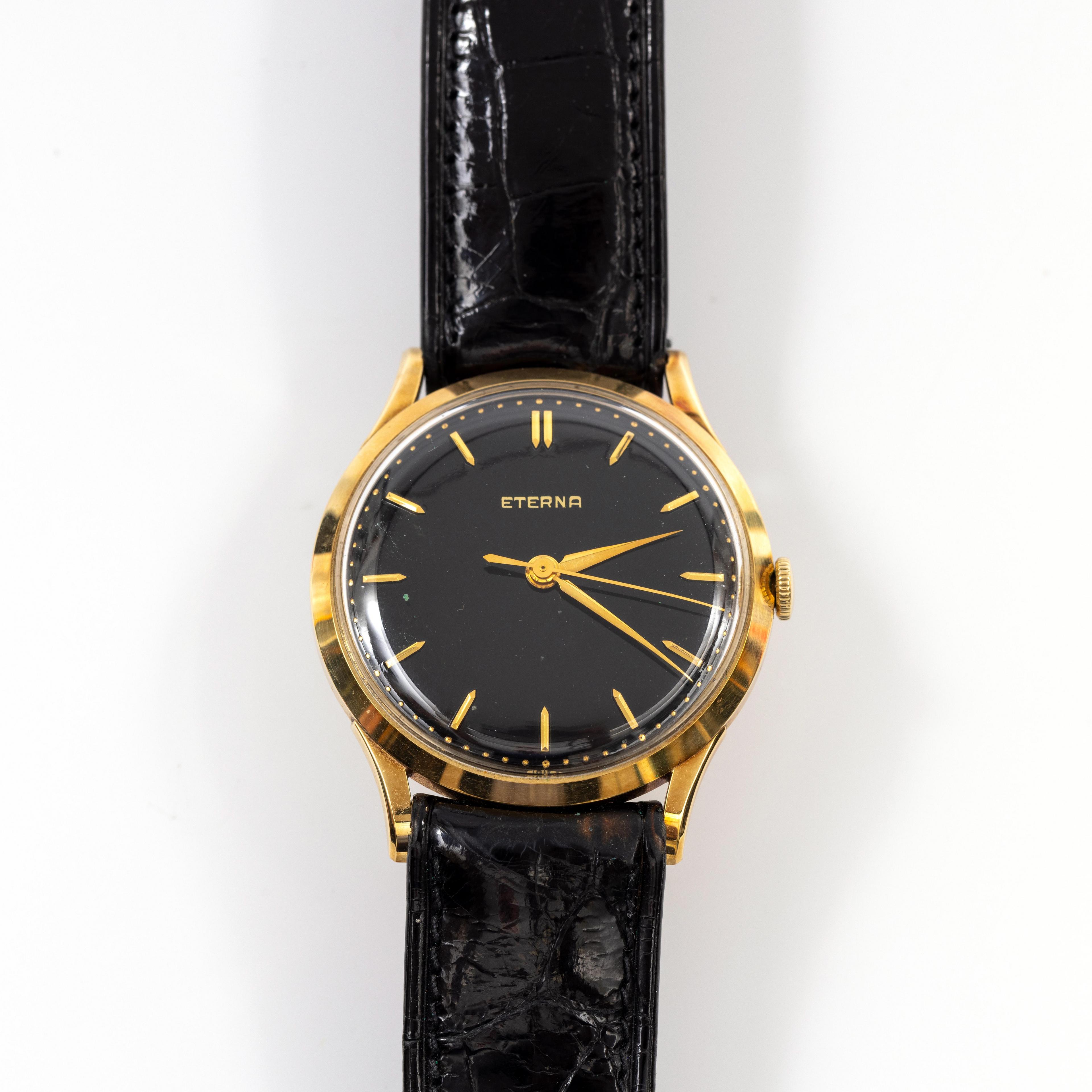 Eterna, 14 k. gold wristwatch. Automatic. With a black dial with batons at the hours. In a black leather strap with a gold-plated Omega buckle.