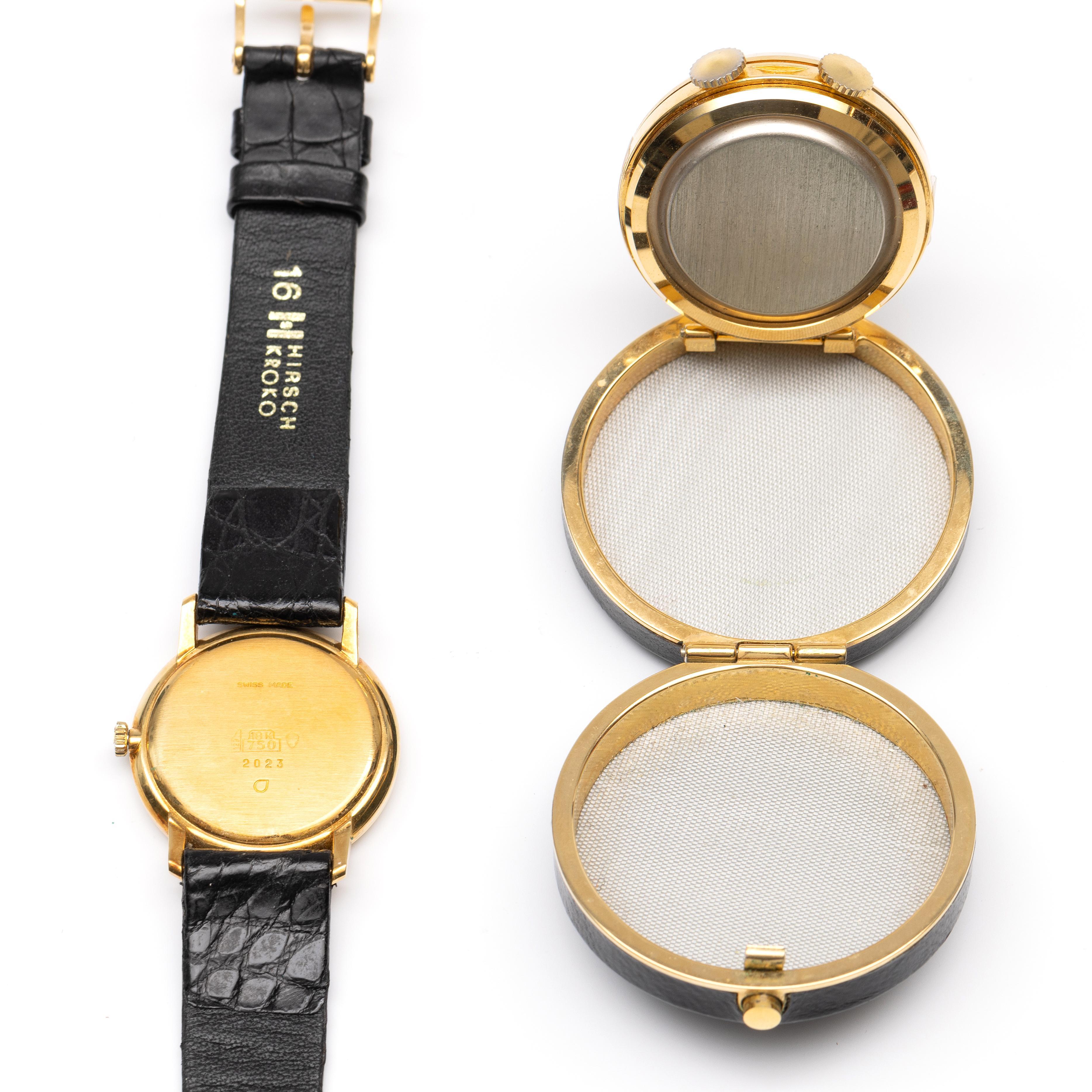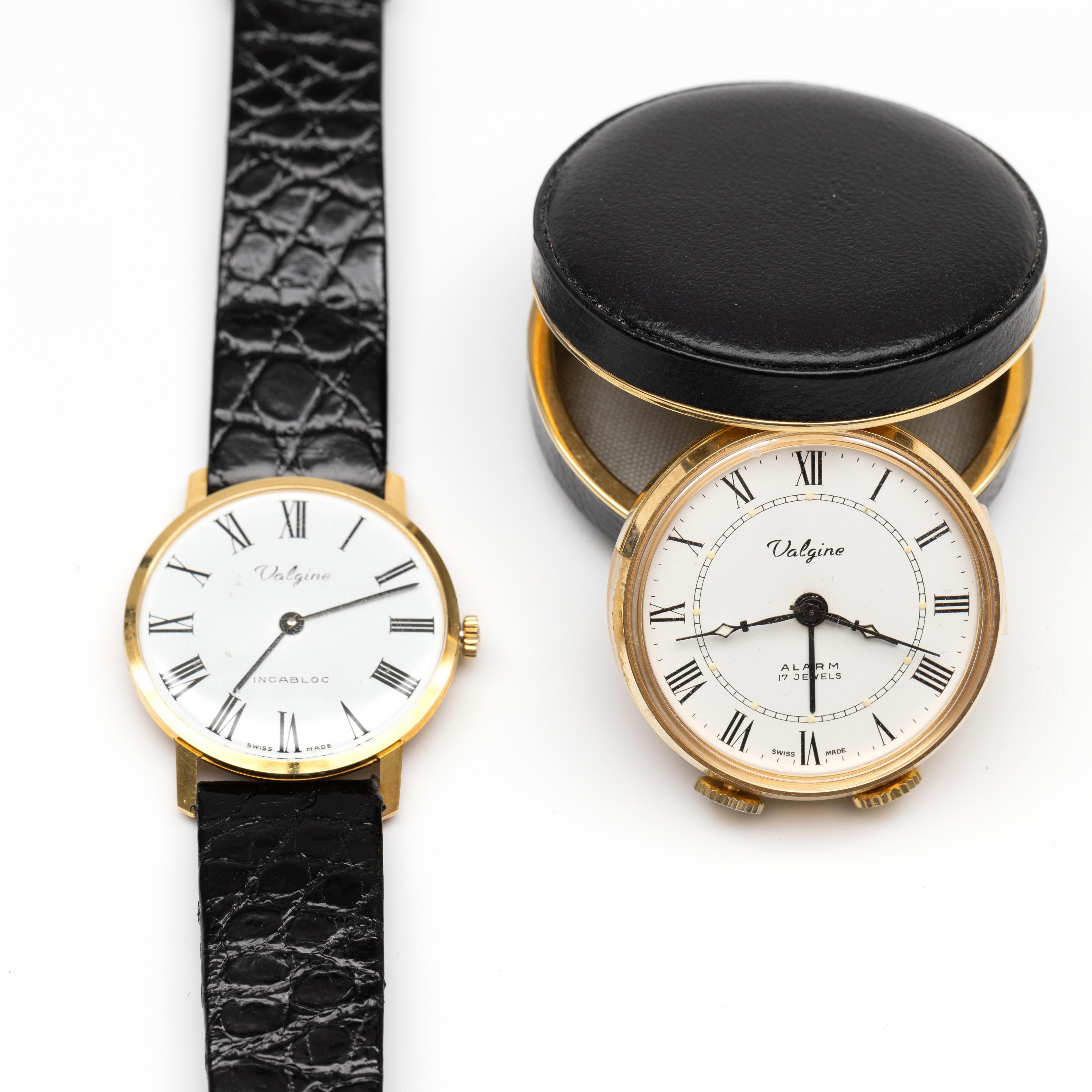 Valgine, 18 k. gold wristwatch. Manual wind. With a white dial and Roman numerals. On a black crocodile leather strap. Herewith, Valgine, gold-plated travel alarm clock.