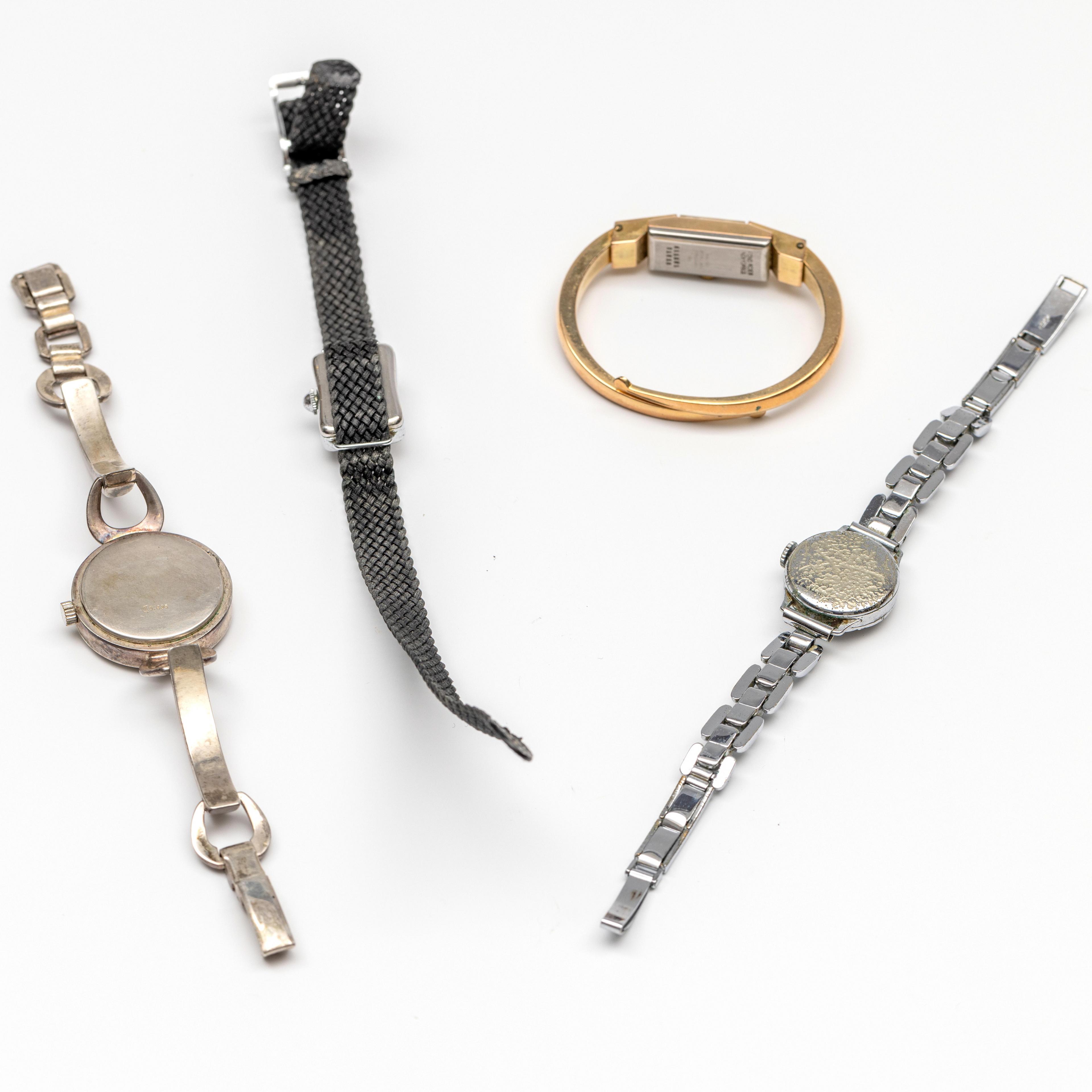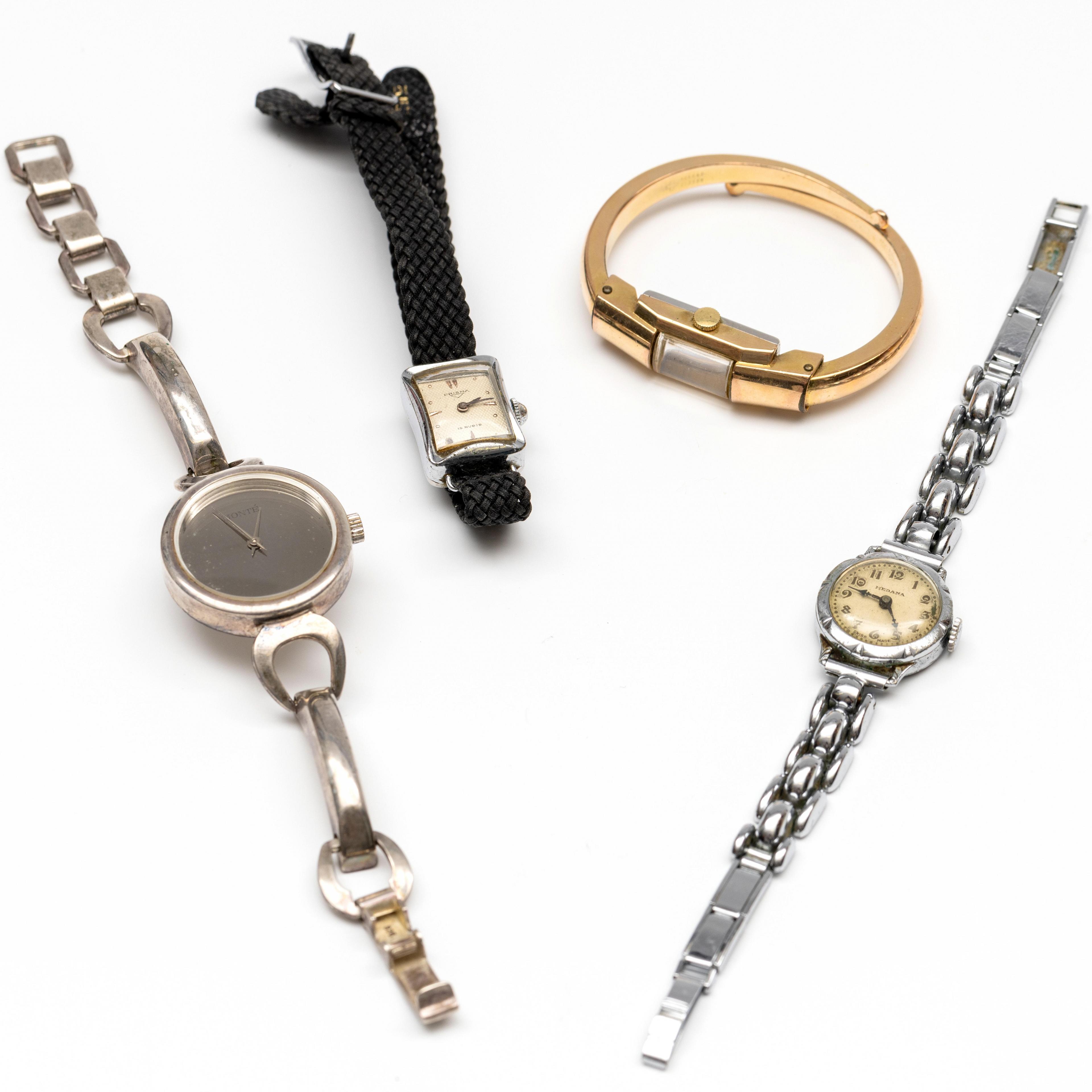 Four wristwatches. Including Baume & Mercier, a gold-plated watch, and Monté, a wristwatch with a mirrored dial.