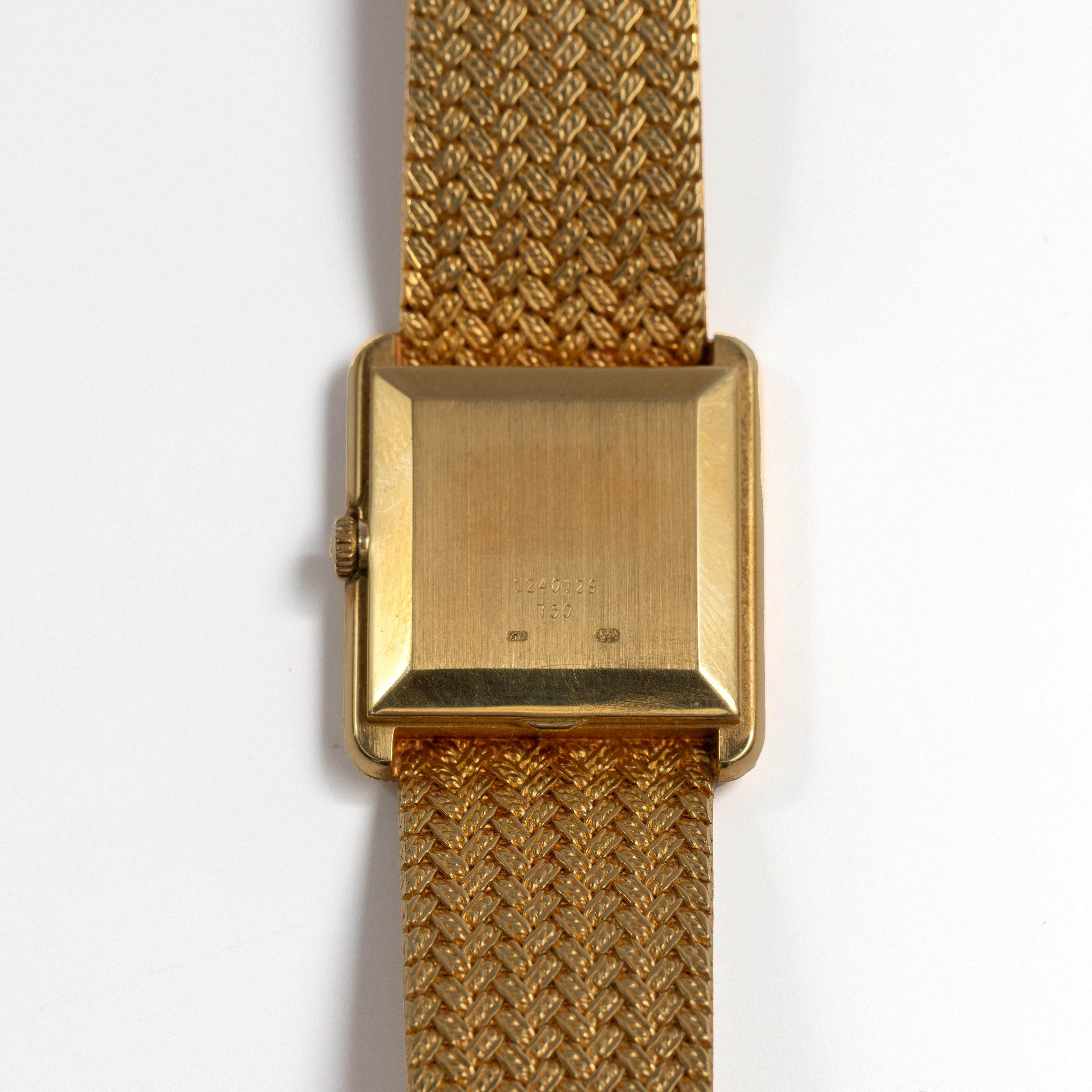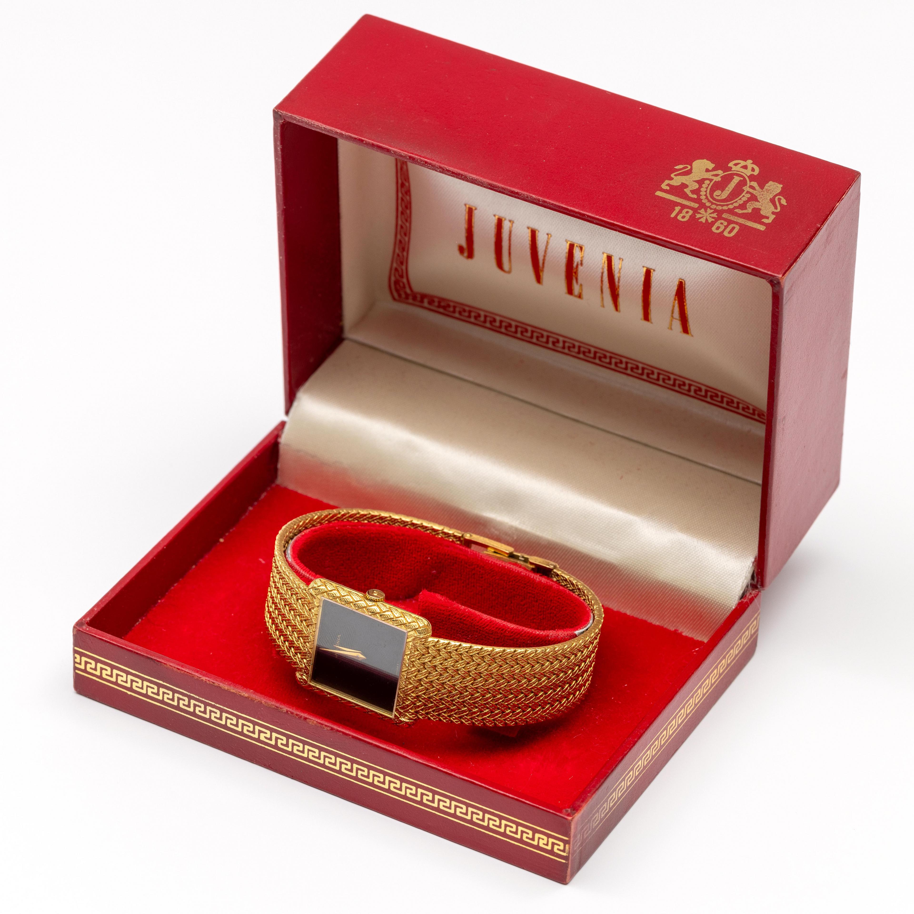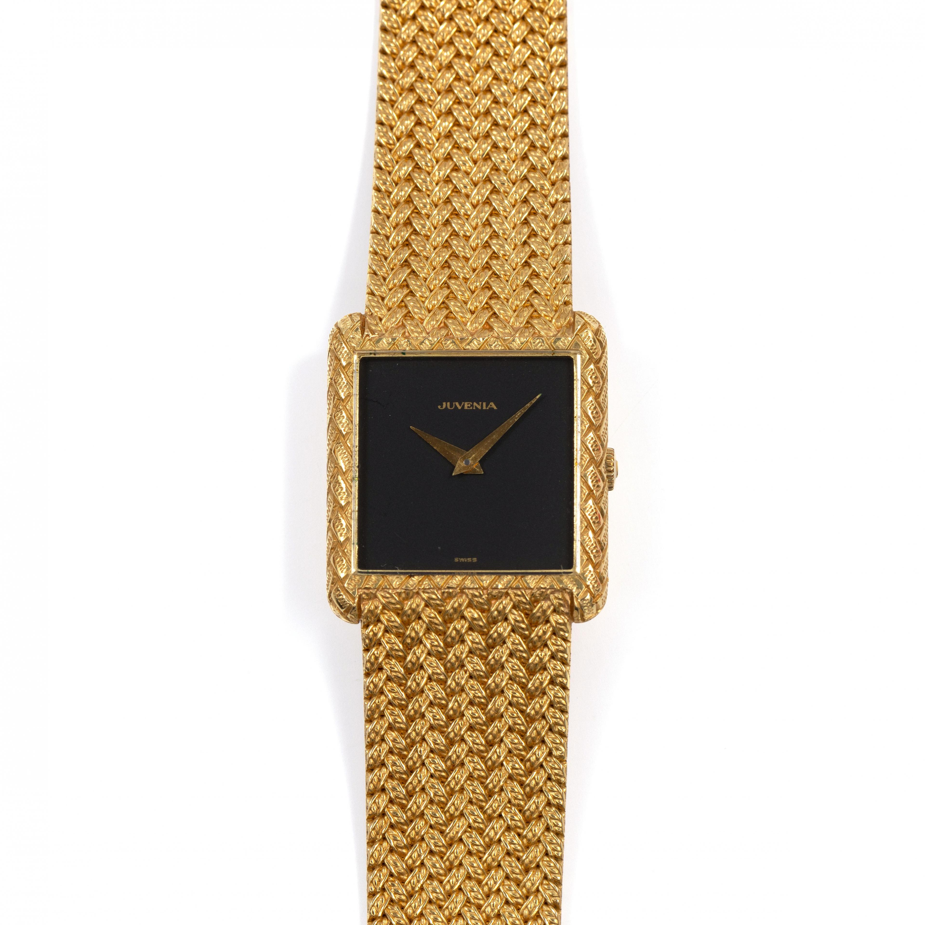 Juvenia, 18 k. gold wristwatch. Manual winding. Black square dial without hour markers. The strap features a braided pattern that extends into the bezel.