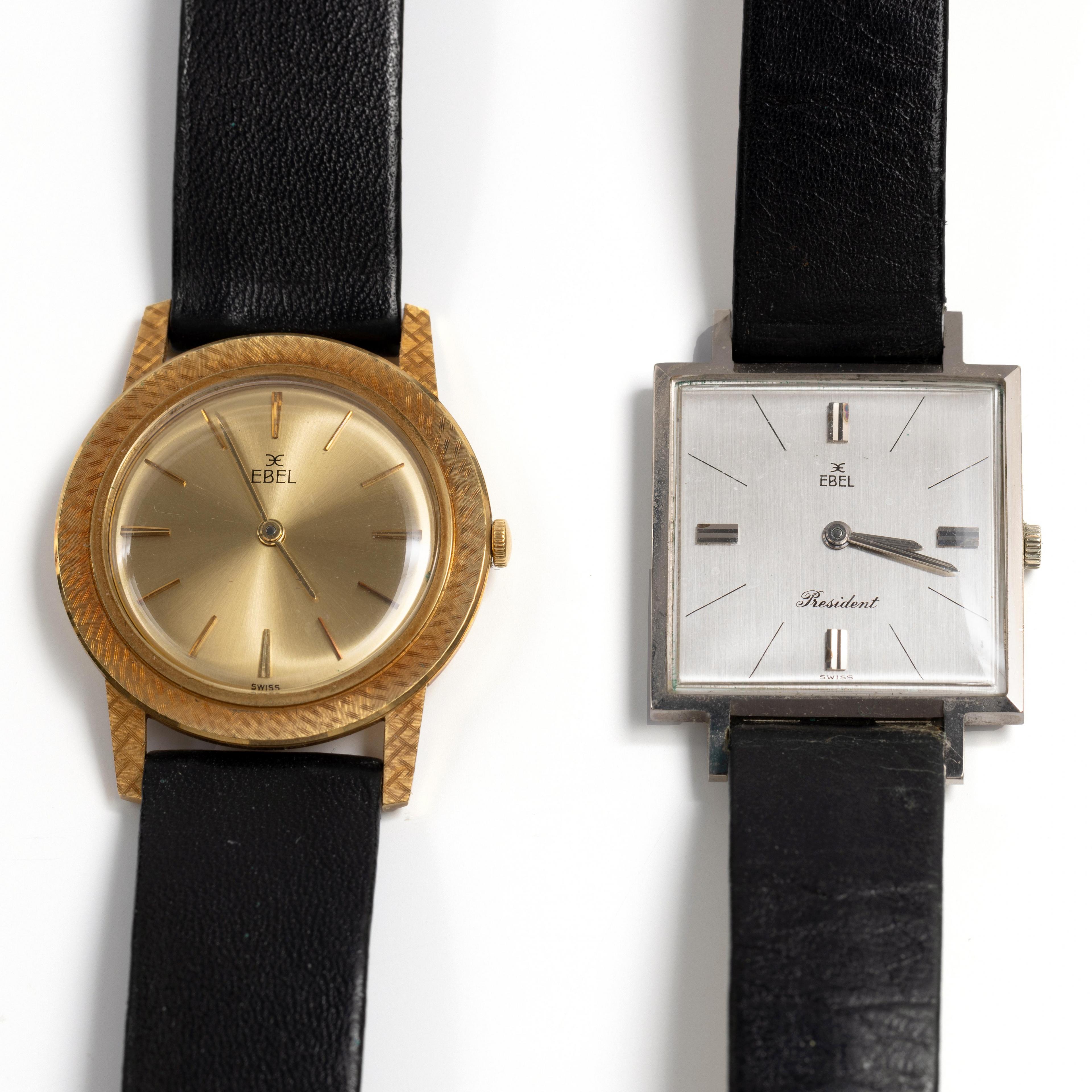Ebel, two 18 k. gold wristwatches. Manual winding. One in yellow gold with a round gold-coloured dial, batons at the hours, on an original black leather strap with a gold-plated clasp. The other in white gold with a square silver-coloured dial, batons at the hours, and an original black leather strap with a steel clasp. Includes one box.
