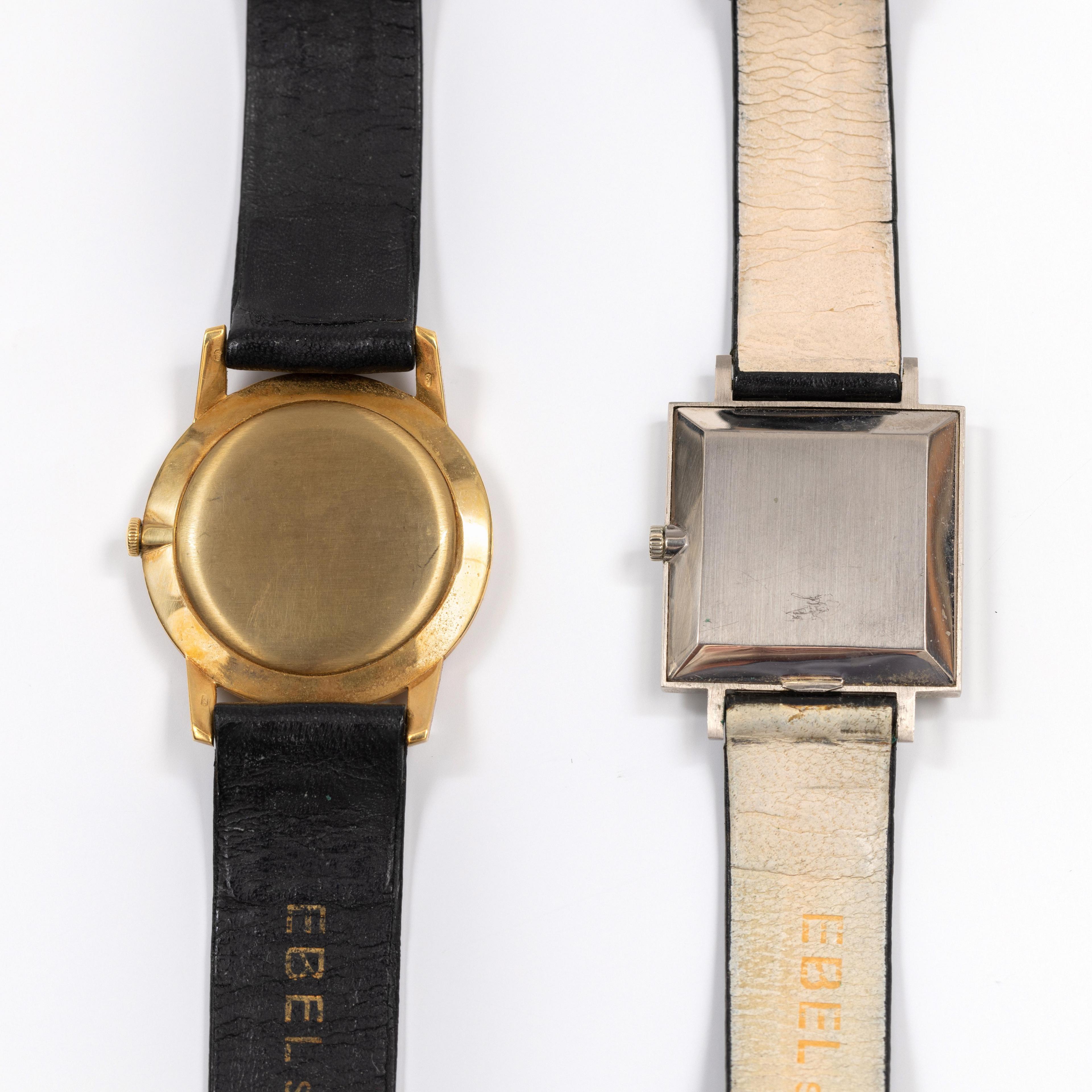 Handopwind. Eén in geelgoud met ronde goudkleurige wijzerplaat, met batons op de uren, aan een zwart lederen originele band met doublé sluiting. De ander in witgoud met vierkante zilverkleurige wijzerplaat, batons op de uren en zwart lederen originele band aan stalen sluiting. Met één doos