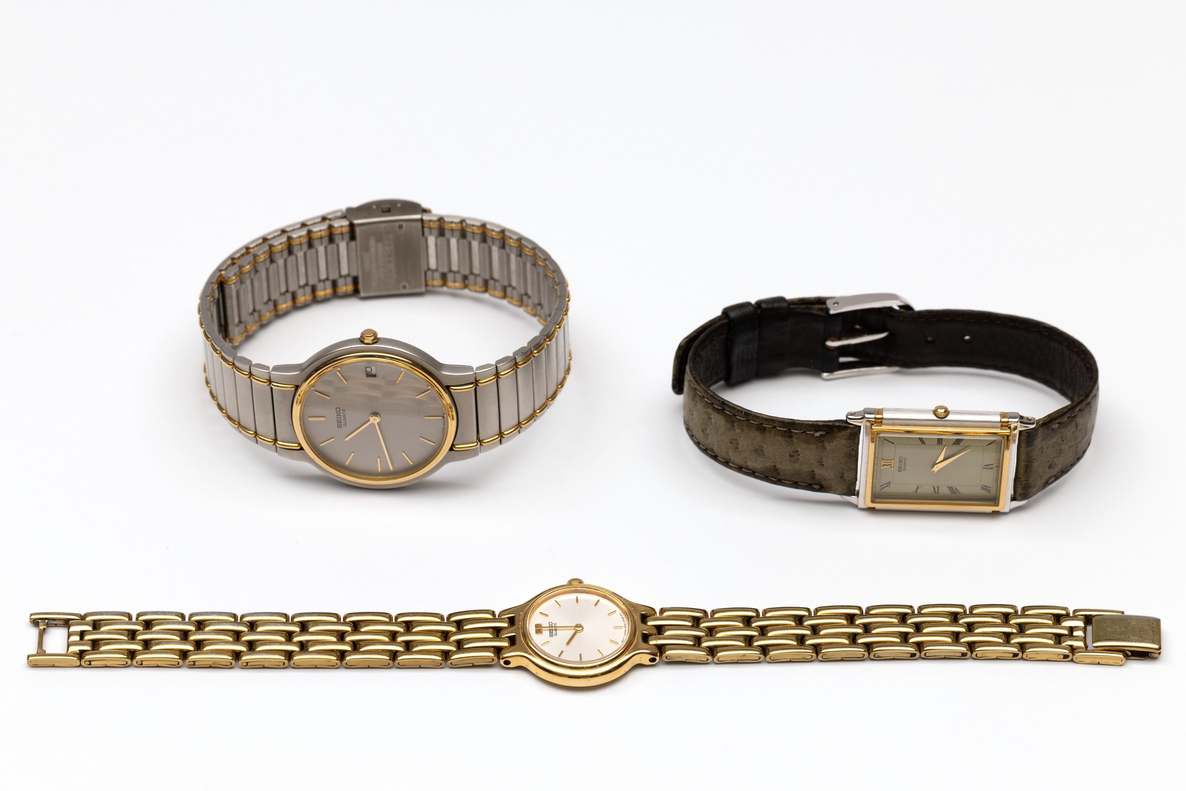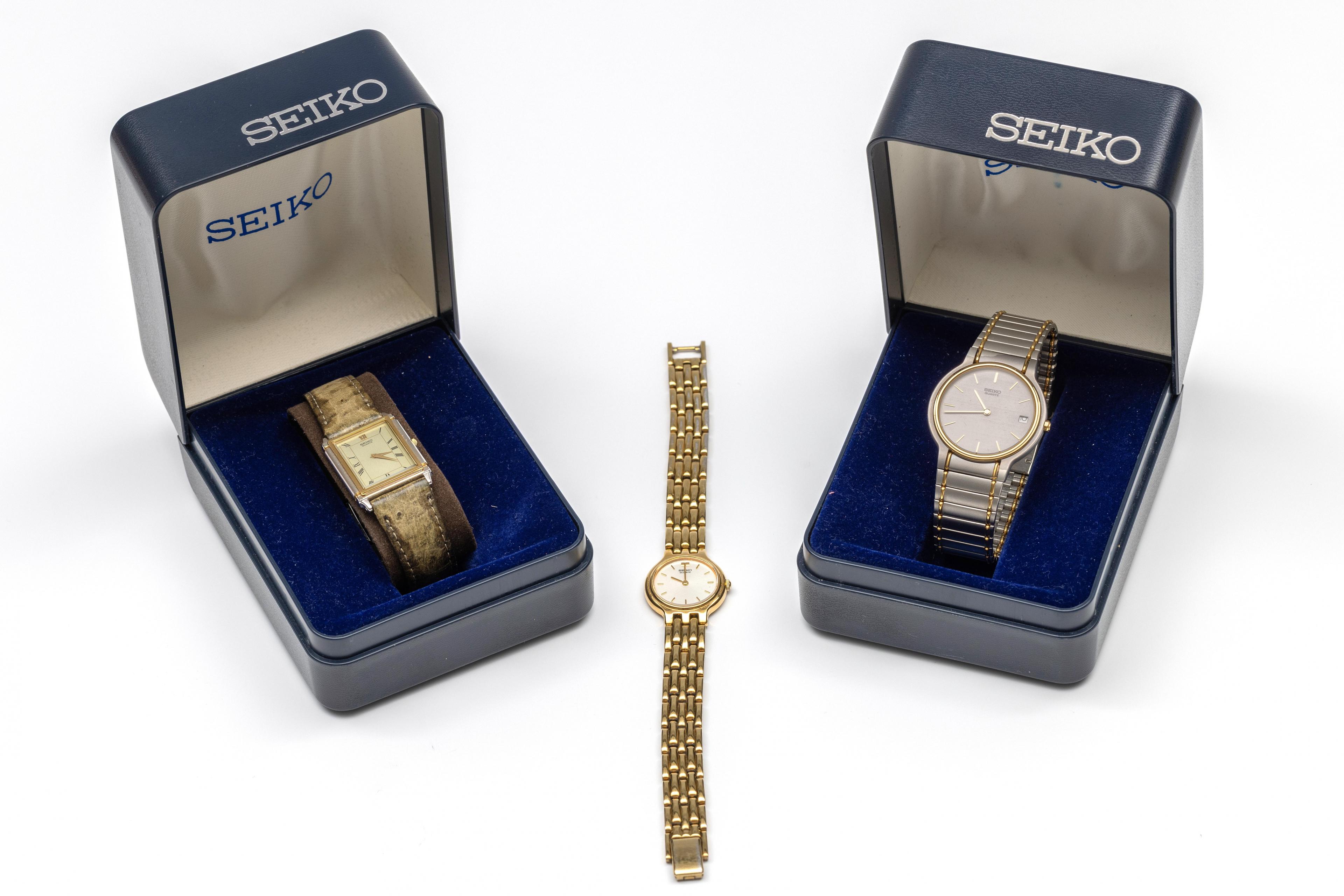 Seiko, three wristwatches. Quartz. On steel and leather straps. Two in a box.