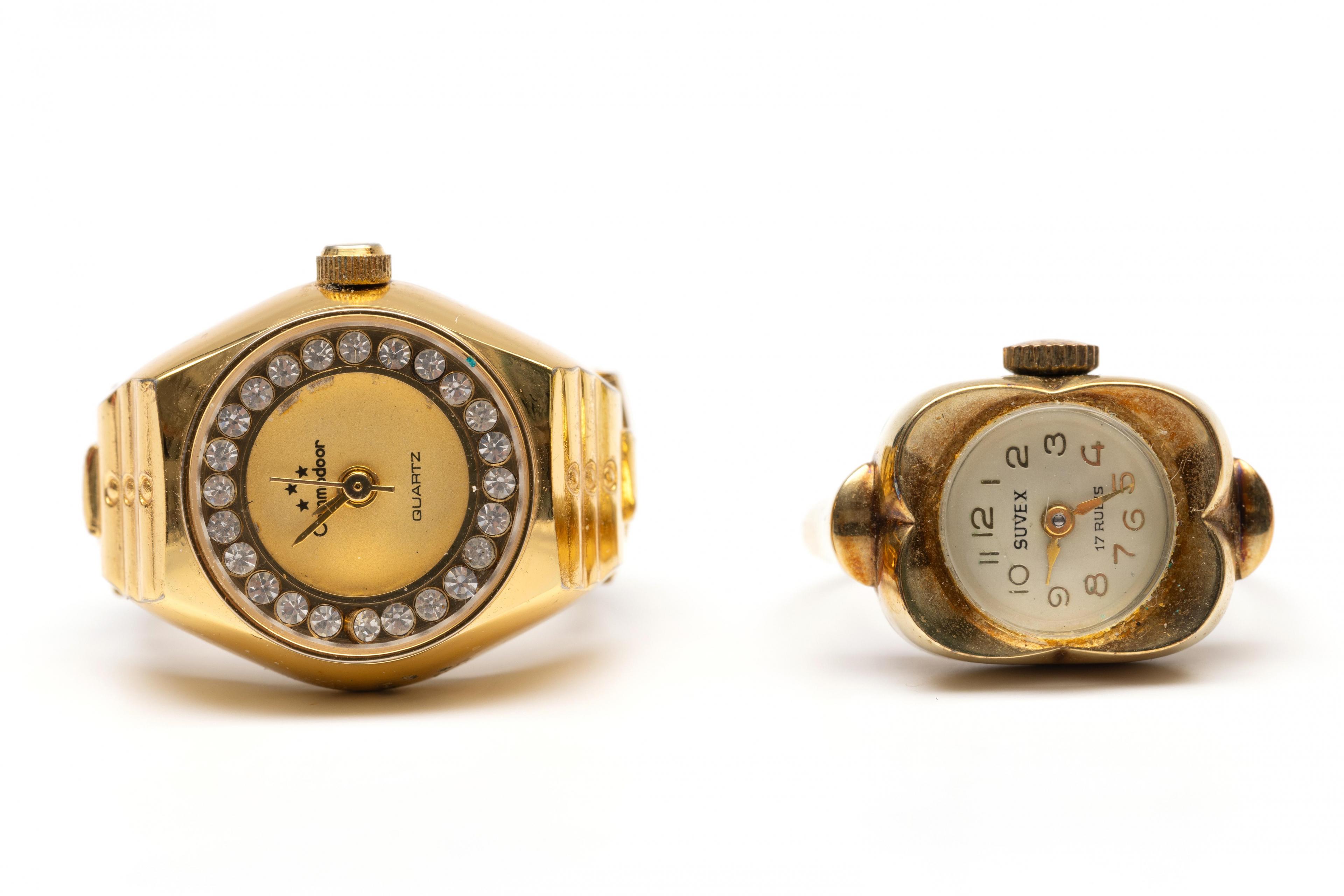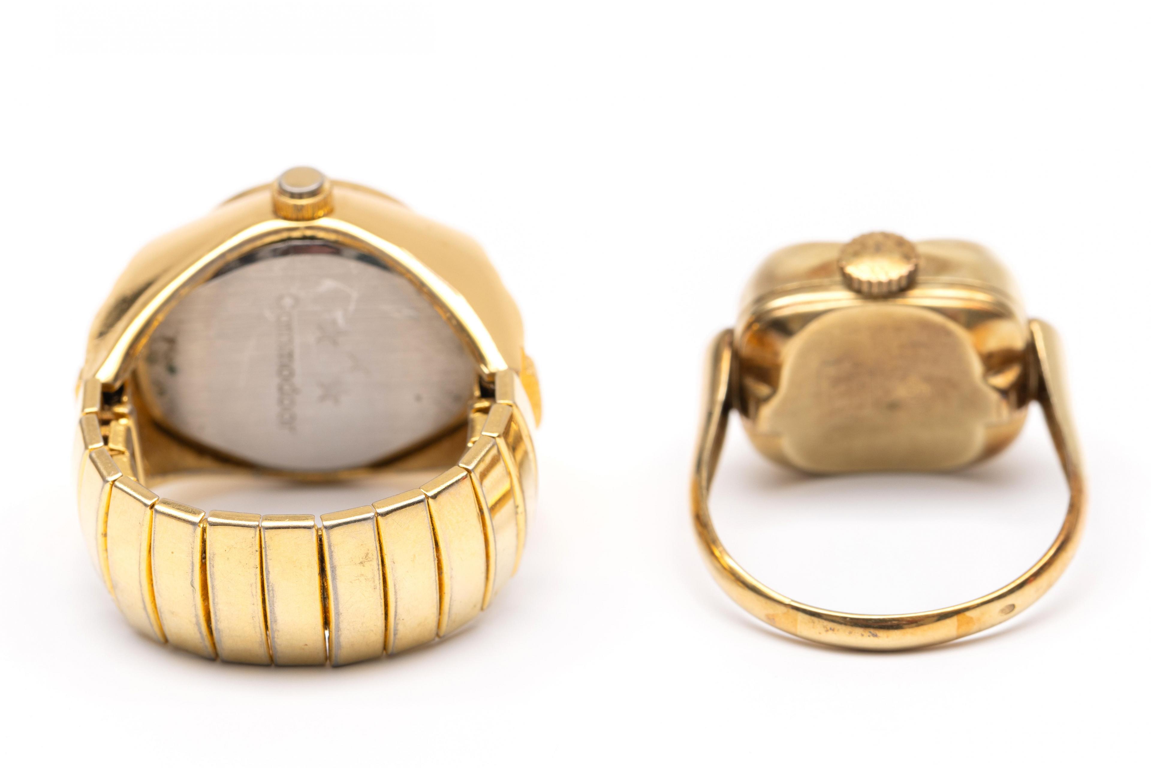 Two ring watches. One Suvex, in 14 k. gold with a cream-coloured dial and Arabic numerals at the hours, and one gold-plated Commodoor with a gold-coloured dial surrounded by imitation diamonds, on a gold-coloured stretch bracelet.