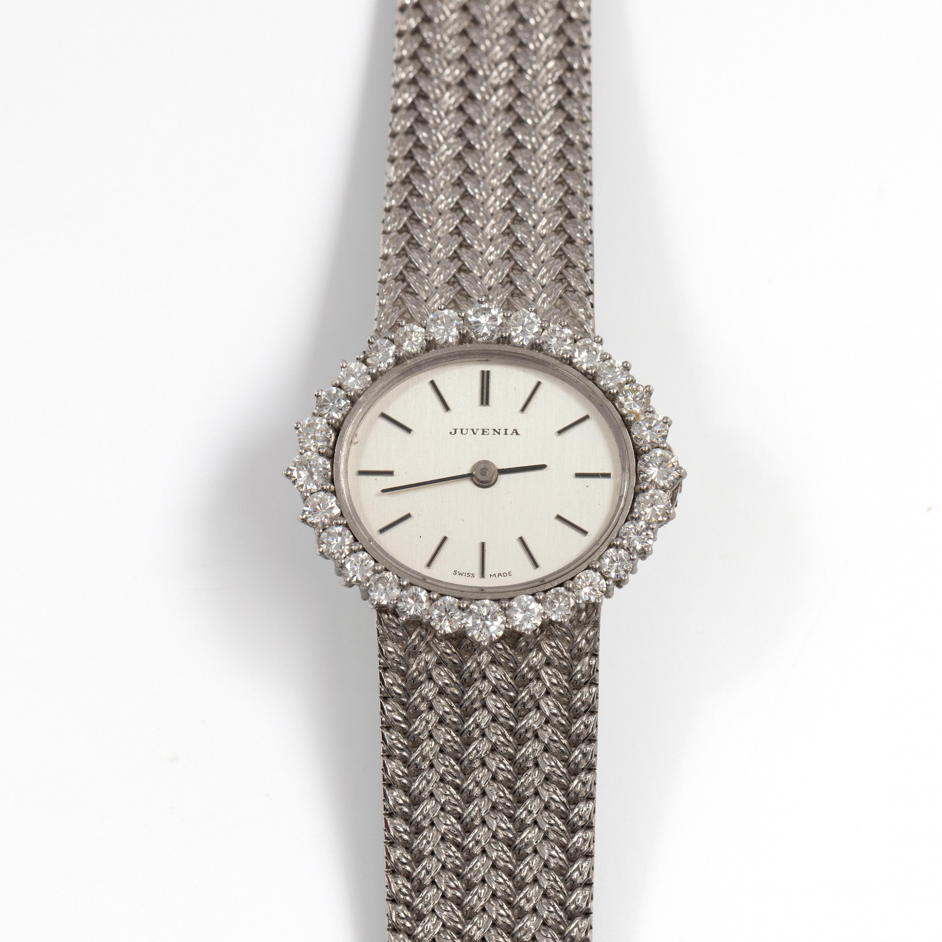 Juvenia, 18 k. white gold wristwatch. Hand-wound, with an oval silver-coloured dial with batons at the hours, the bezel set with brilliant-cut diamonds, onn a braided strap. Numbered 1165415 on the back.