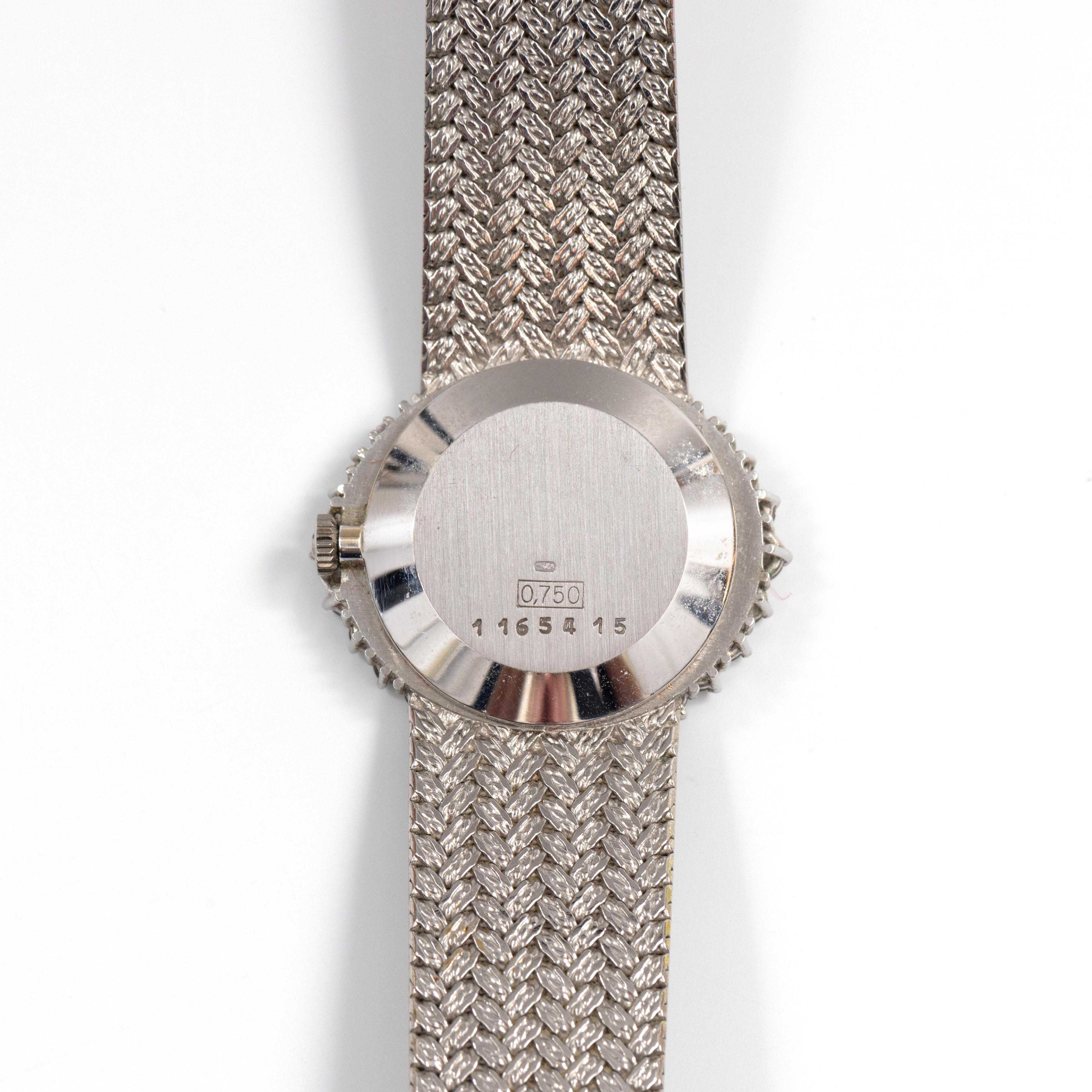 Handopwind, met ovale zilverkeurige wijzerplaat met batons op de uren, de lunette bezet met briljant geslepen diamant, aan een gevlochten band. de achterzijde genummerd 1165415