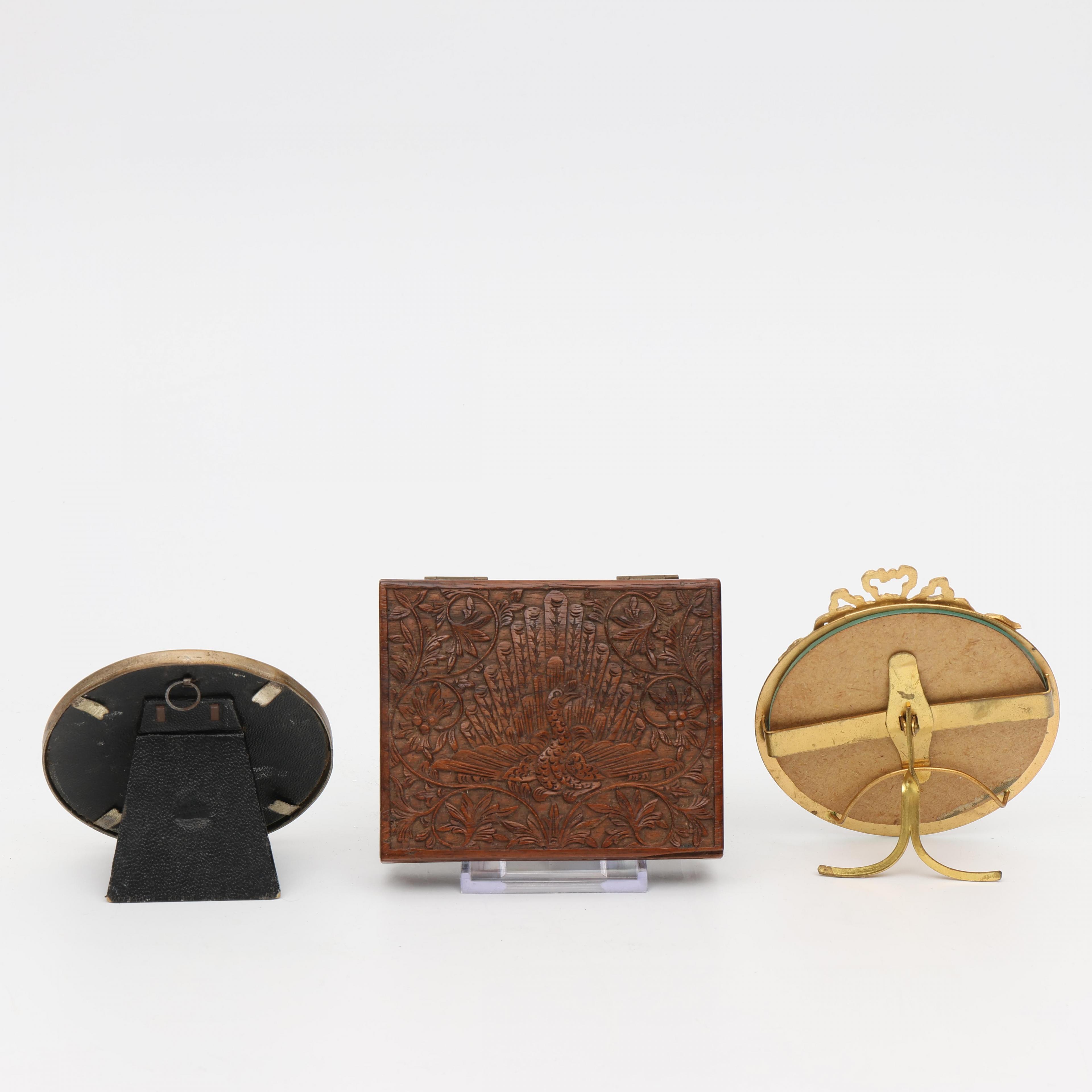 Twee ronde fotolijsten, Balinees gestoken kistje en diverse goudgewichten;