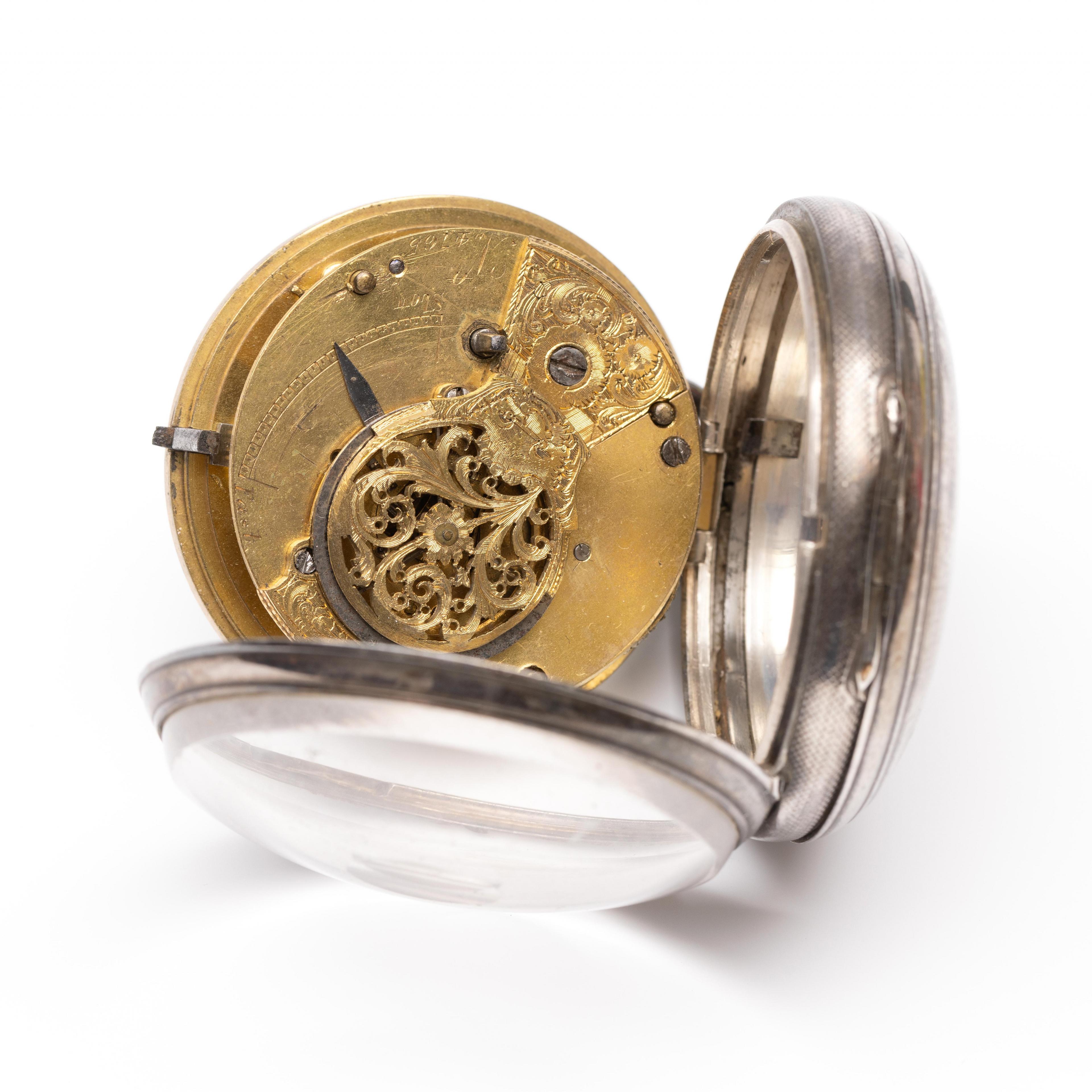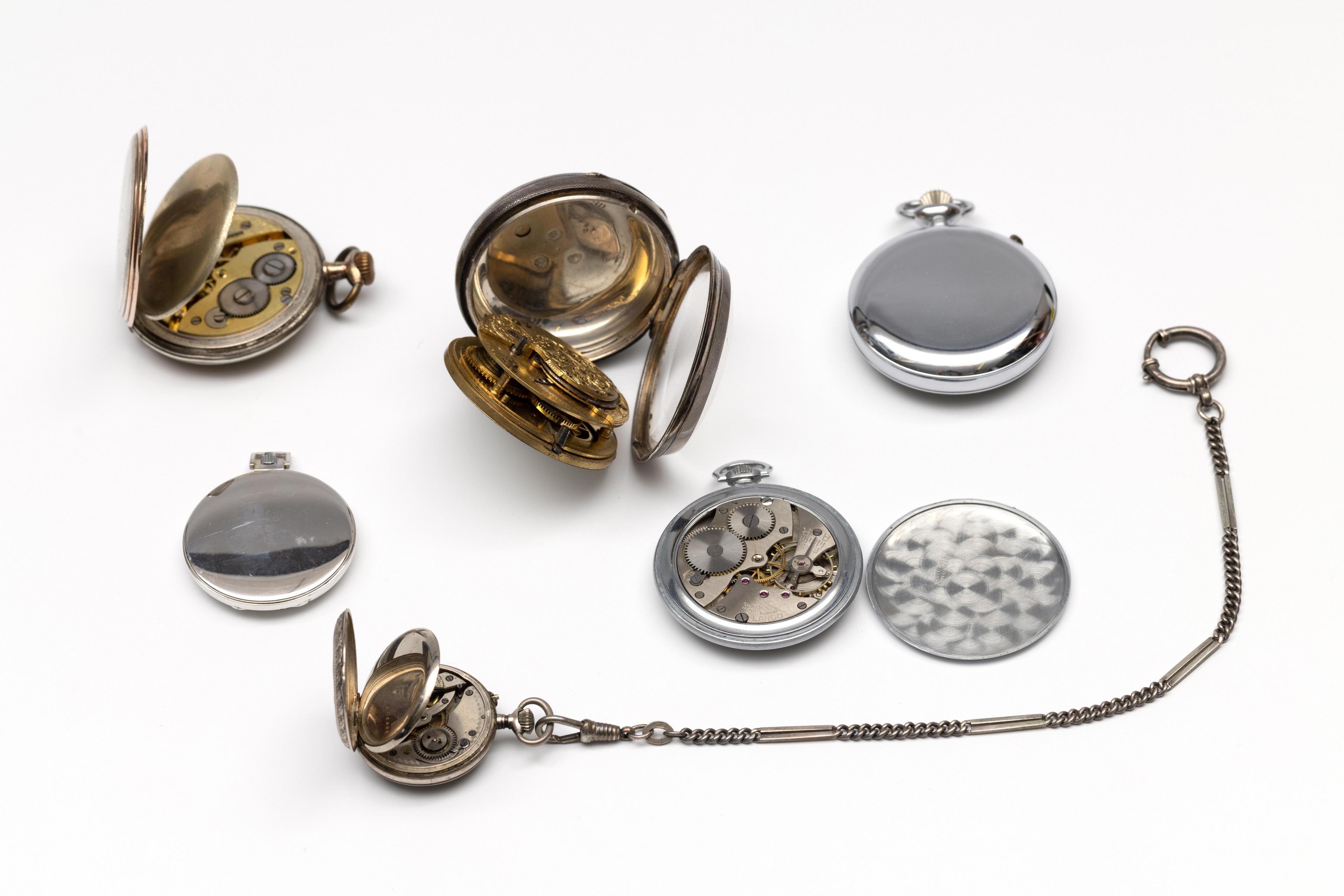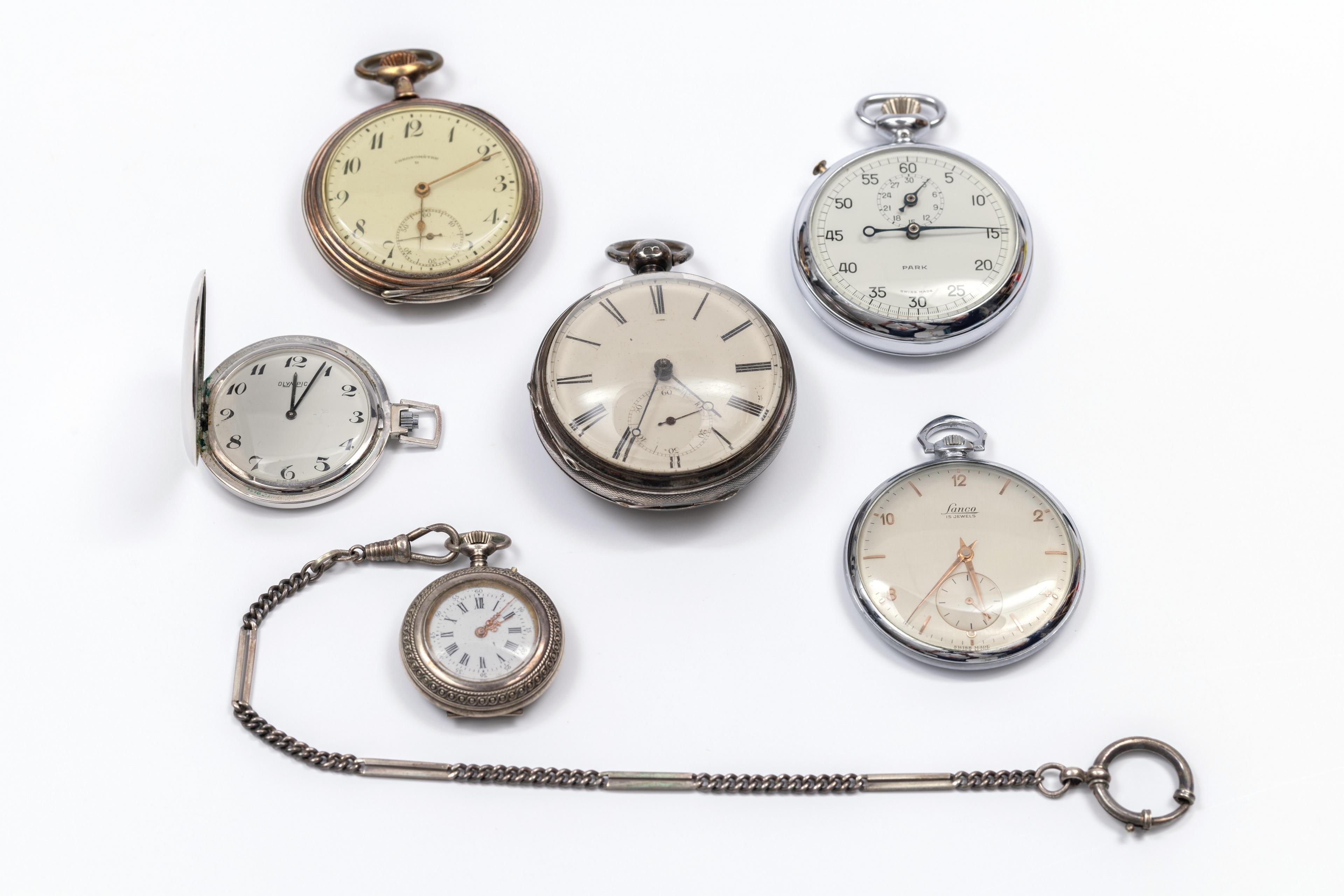 London, silver pocket watch, 19th century. White dial with Roman numerals and seconds indication at the six, with a fusee movement. Movement and case numbered 4765. Date letter E for 1840, maker's mark for the case GH for George Hammon. Herewith five pocket watches in silver and base metal.