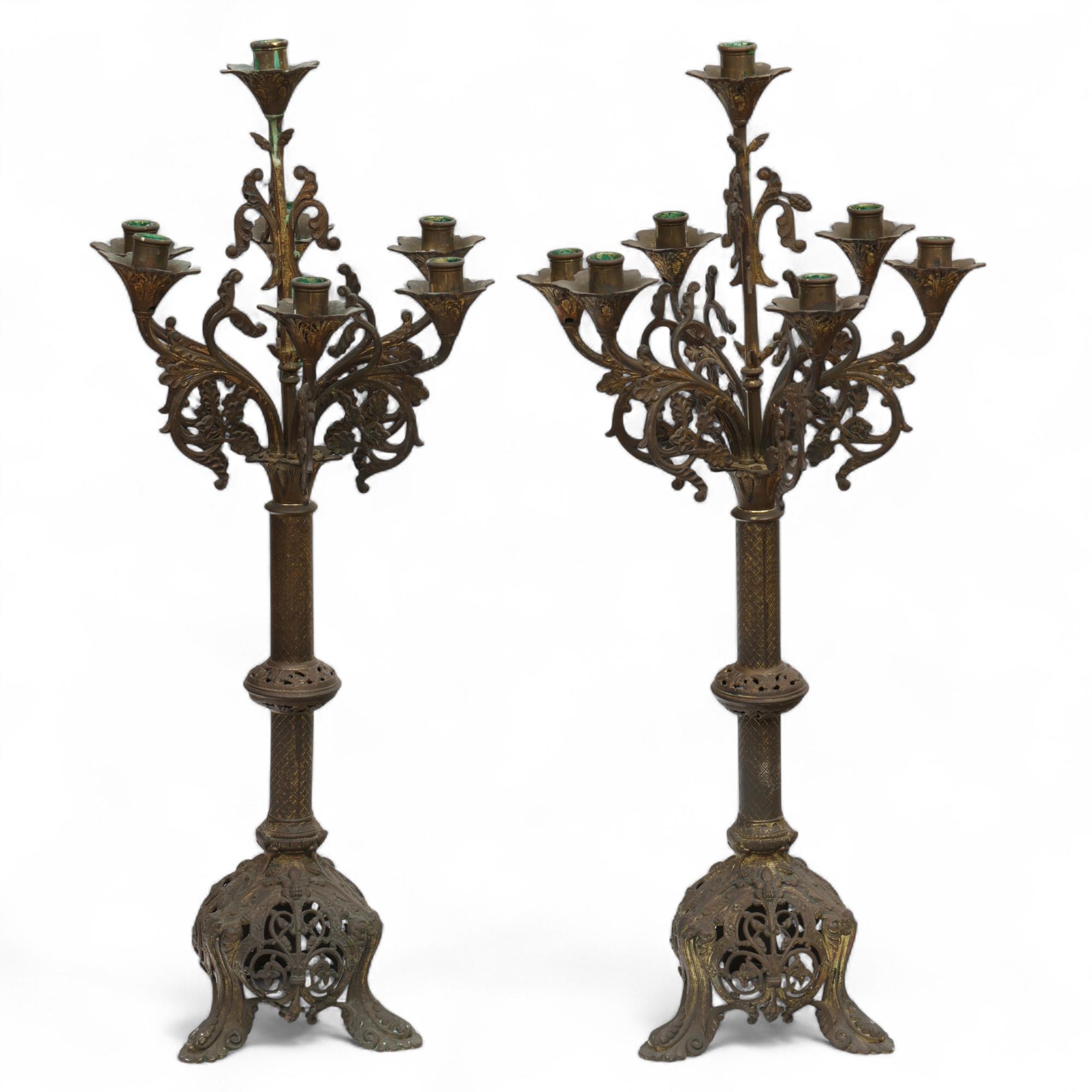 Paar gegoten koperen zeven lichts kandelabers, circa 1900;