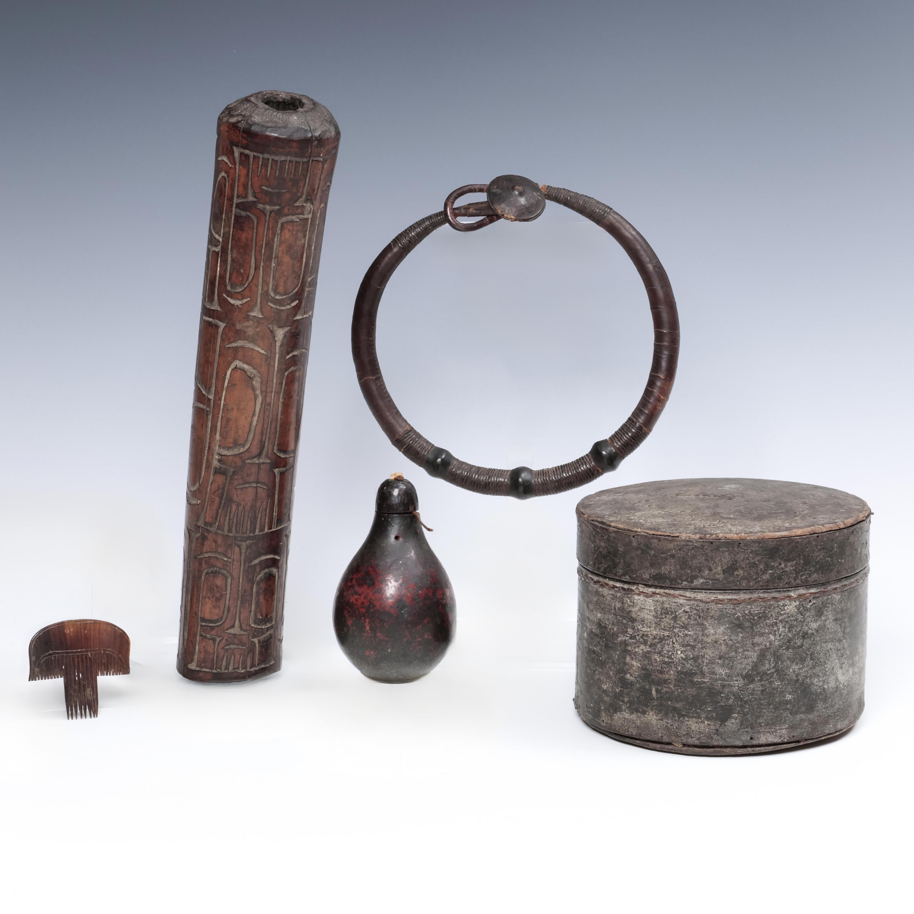 comprising of a Ceram, buffalo horn comb; a bark lided circulair box; a gourd container; an Asmat blow horn, fu and a Nias leather necklace, kalabubu (broken)