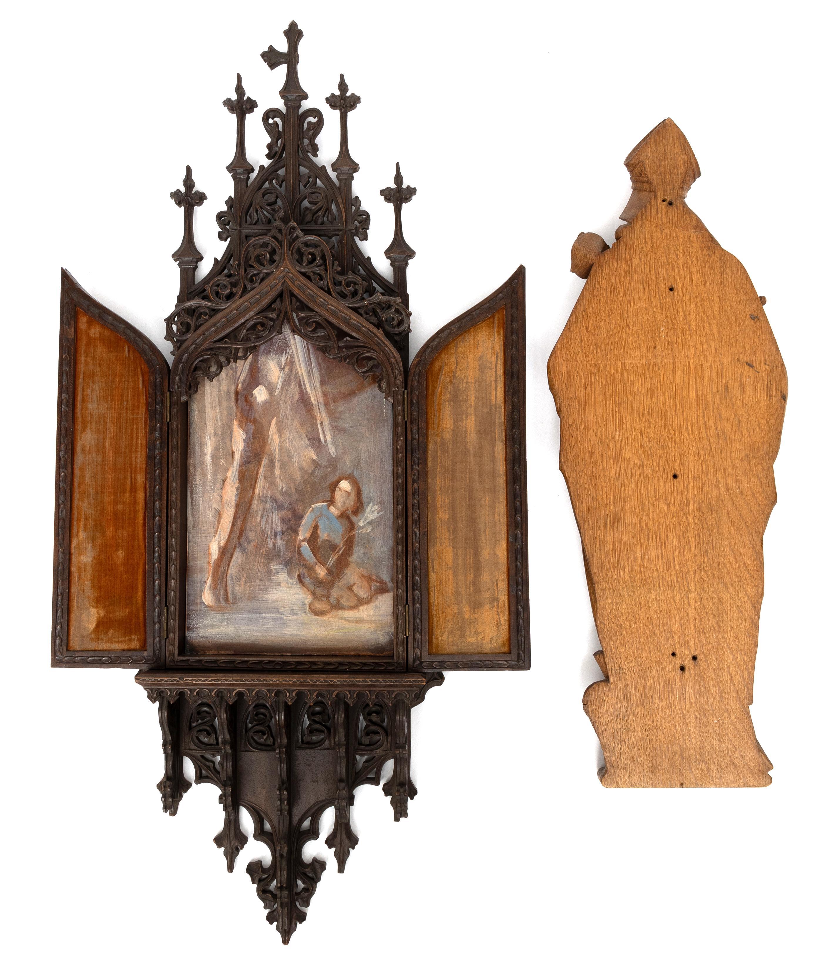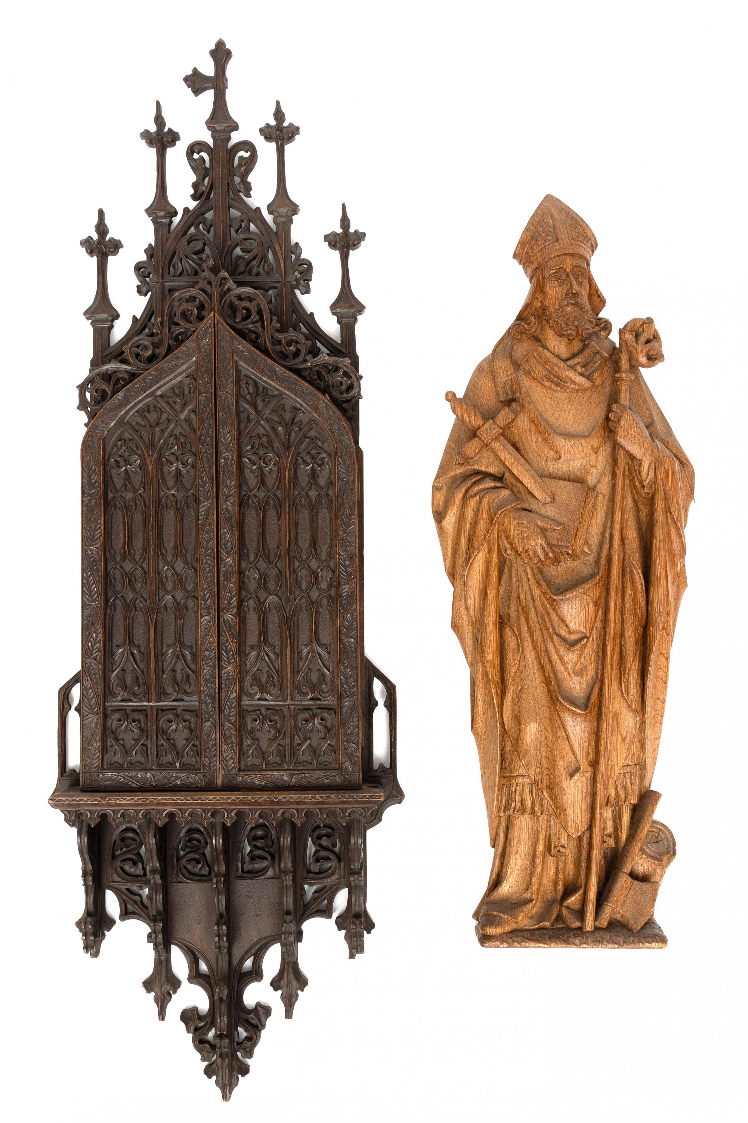 Eikenhouten reliëf plaquette voorstellende Bonifatius en gestoken houten schrijn, circa 1900;