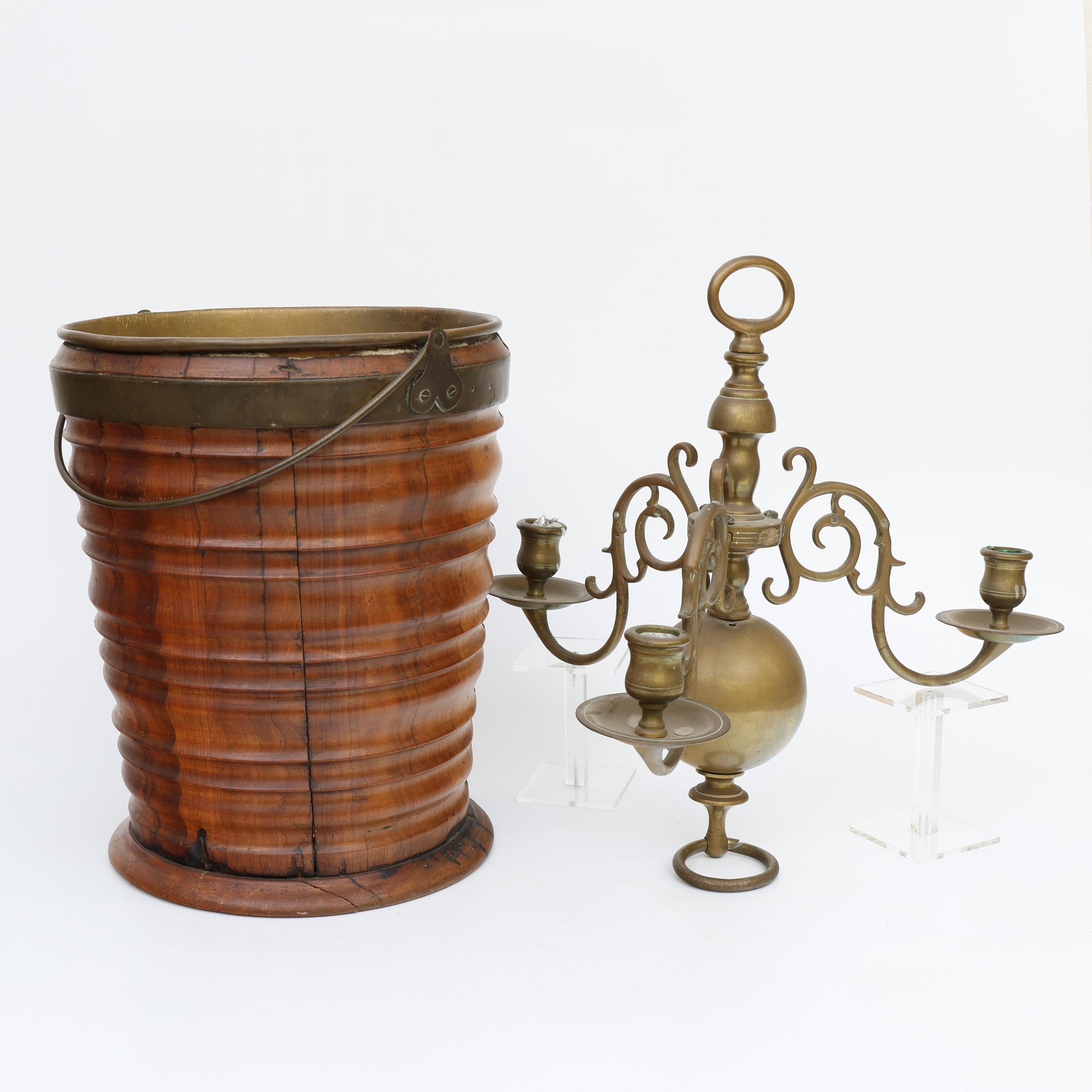 Met koperen binnenbak, hengsel en montuur. Hierbij drie lichts koperen bolkroontje.