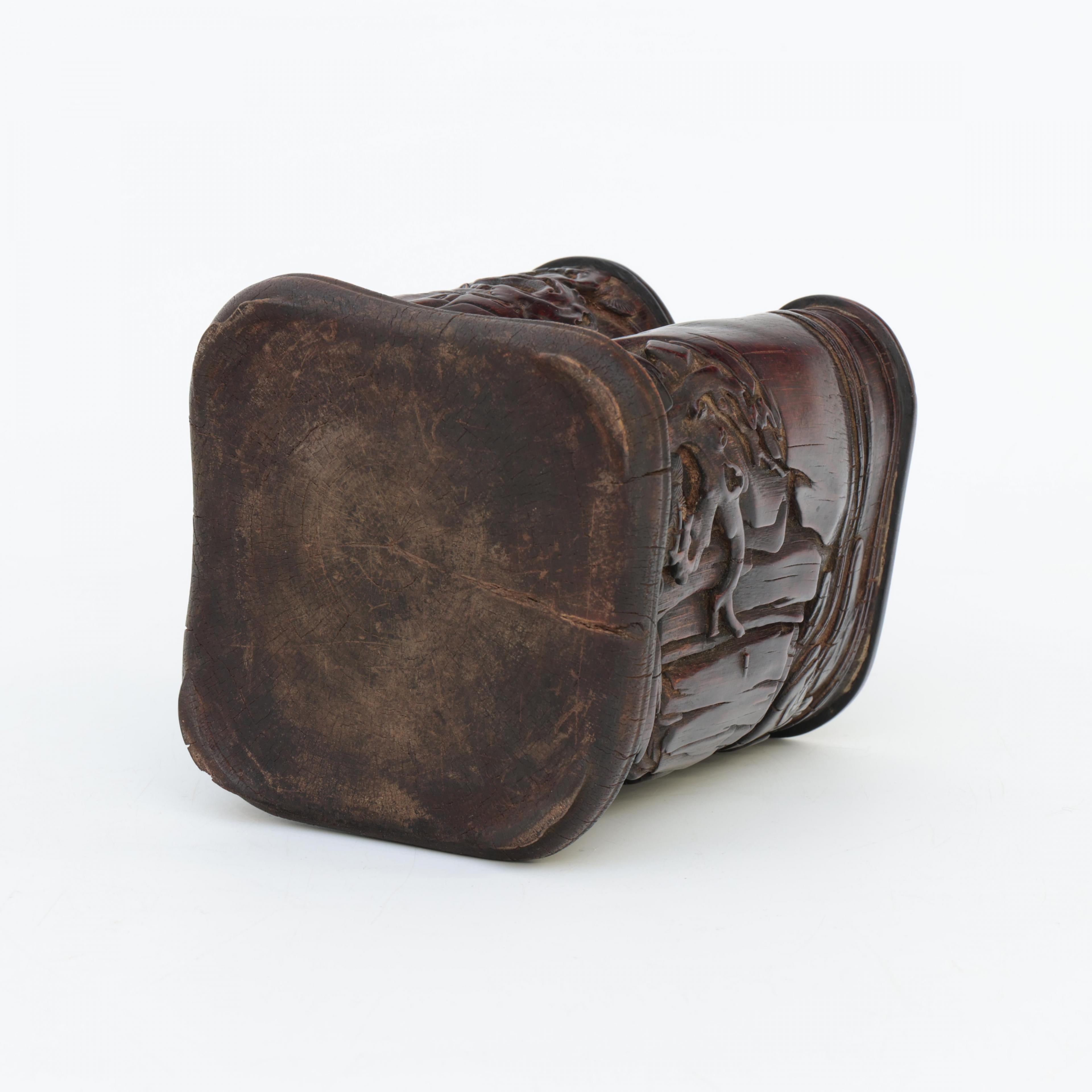 carved with figures in a boat in an extensive pine-strewn river landscape (minor wear and some natural splits to the wood)