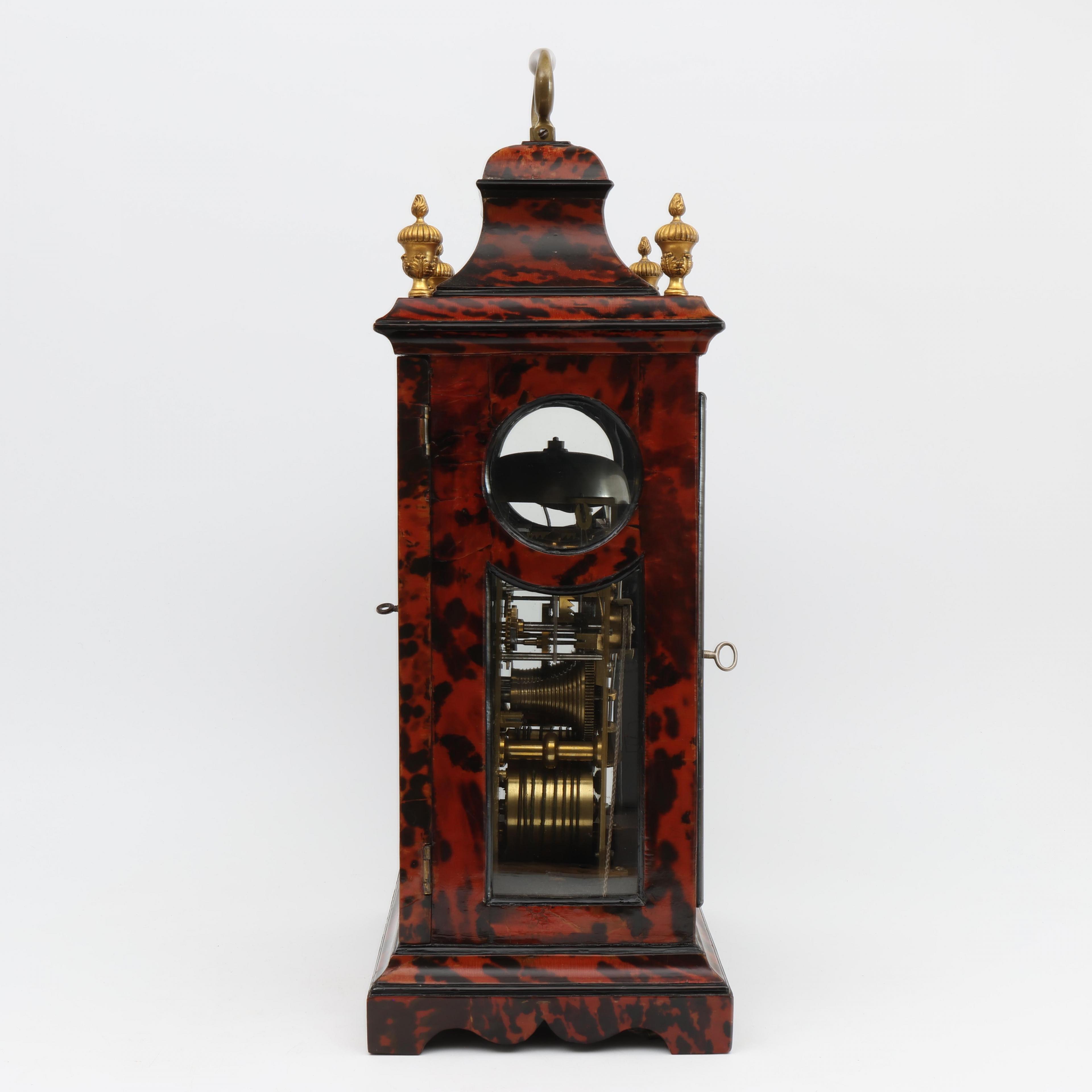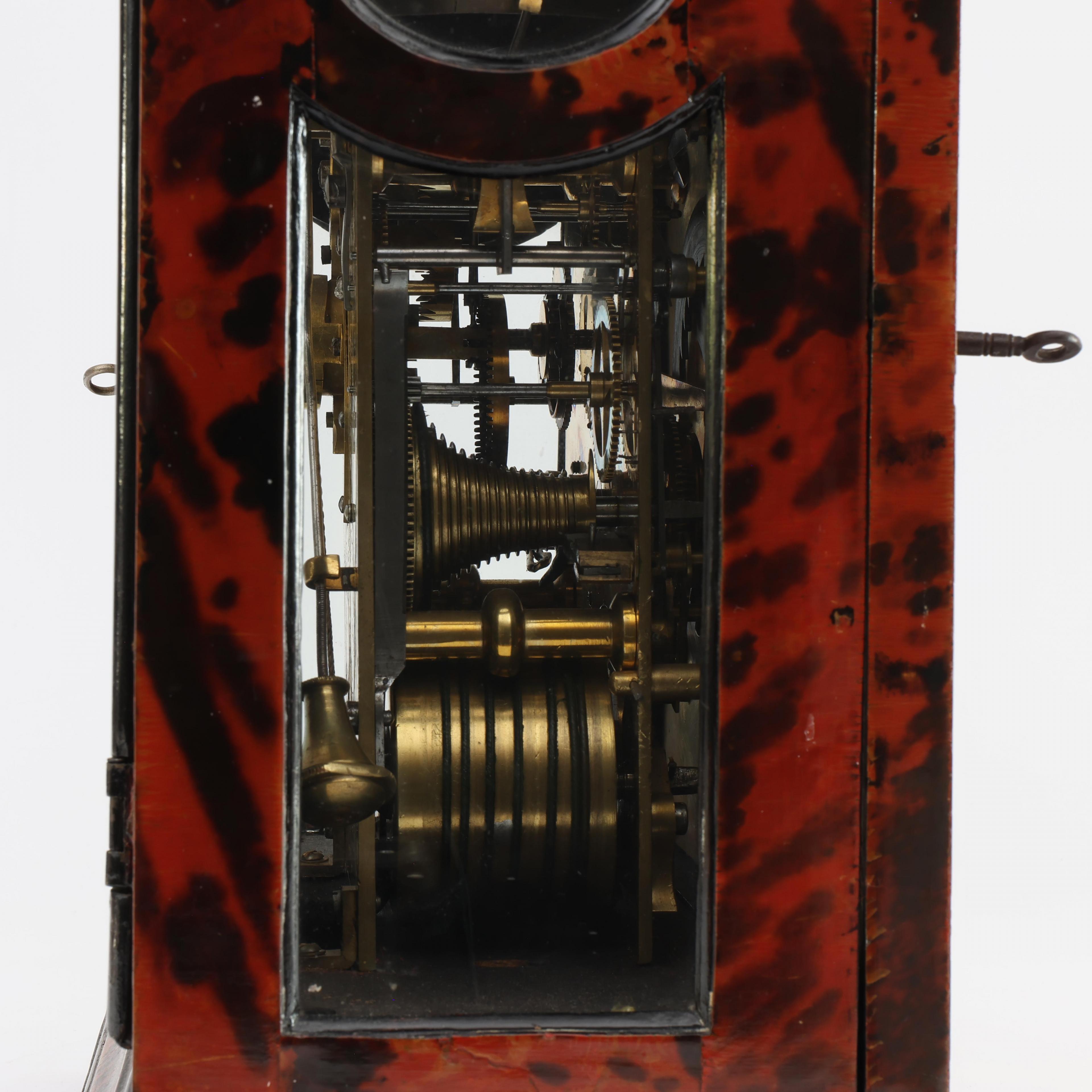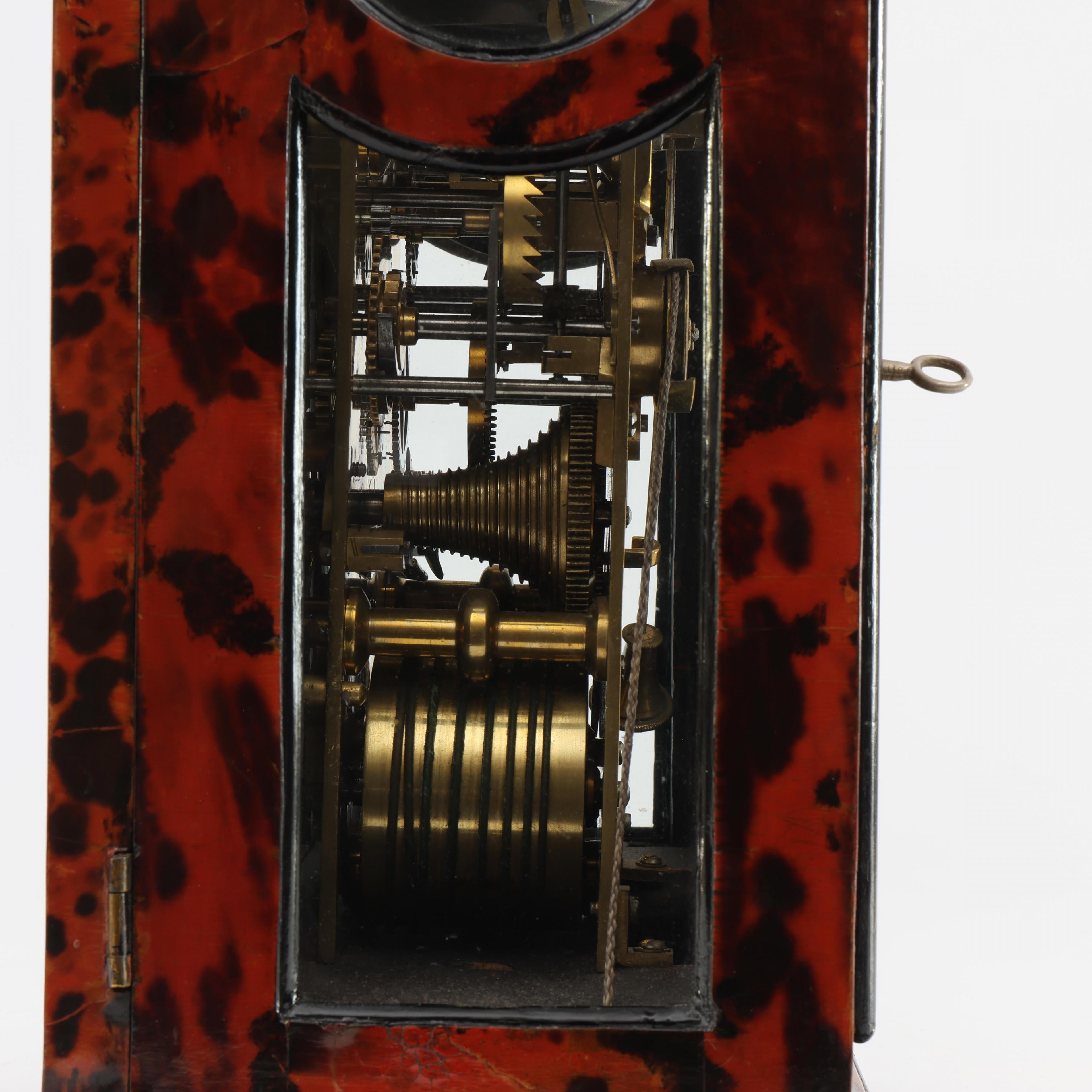 Uurwerk uitgevoerd met spillegang, snek, slagwerk op bel, wekkerwerk met trekmechanisme. Messing wijzerplaat met verzilverde uurring met Romeinse cijfers voor uuraanduiding en Arabische cijfers voor minutenaanduiding, datum, wekkerwerk, slaan/niet slaan aanduiding in de toog. Fraai gegraveerde achterplatine met florale decoratie. Geplaatst in met rood gekleurd schildpad opgelegde houten kast. Vier koperen pinakels op de hoeken, koperen handvat.
