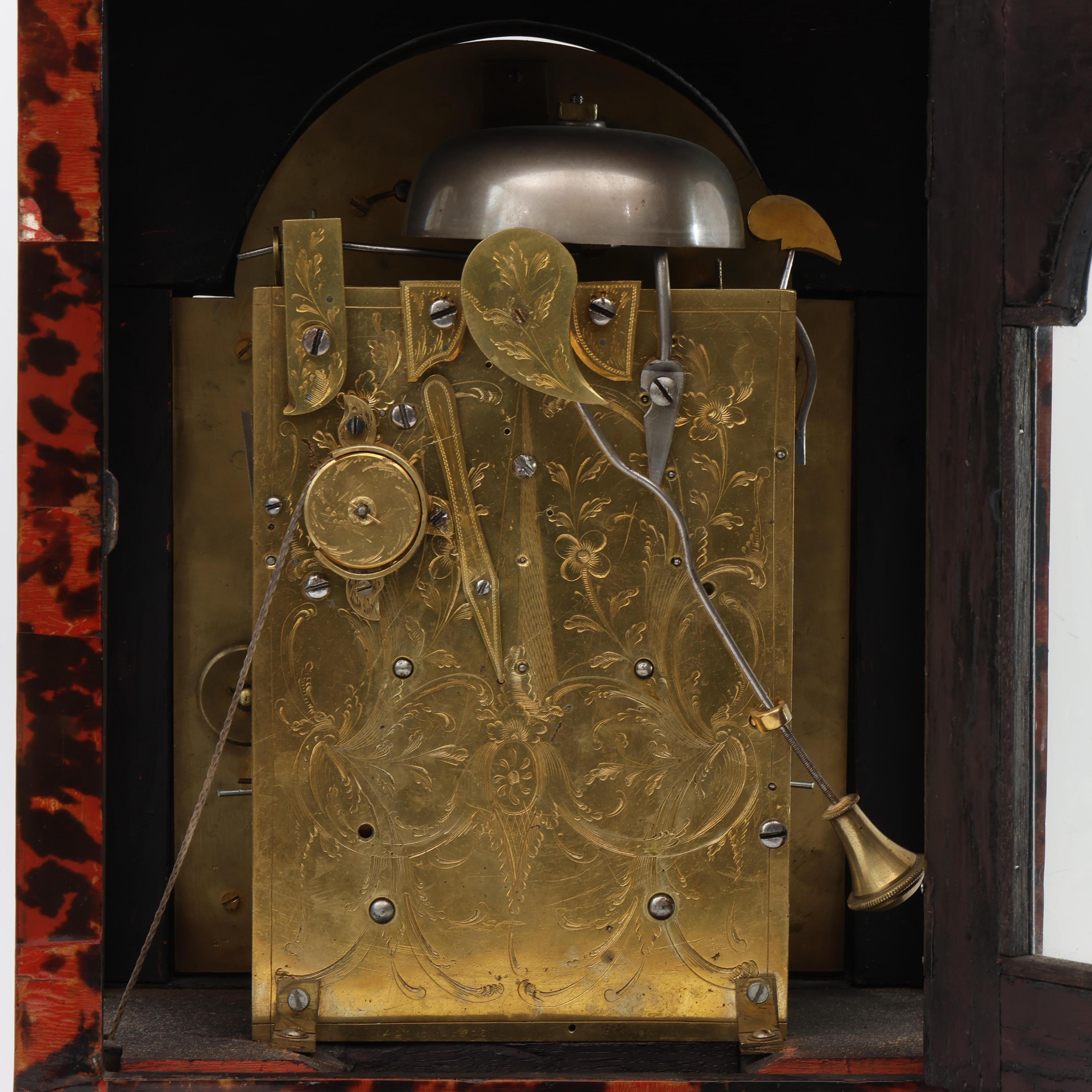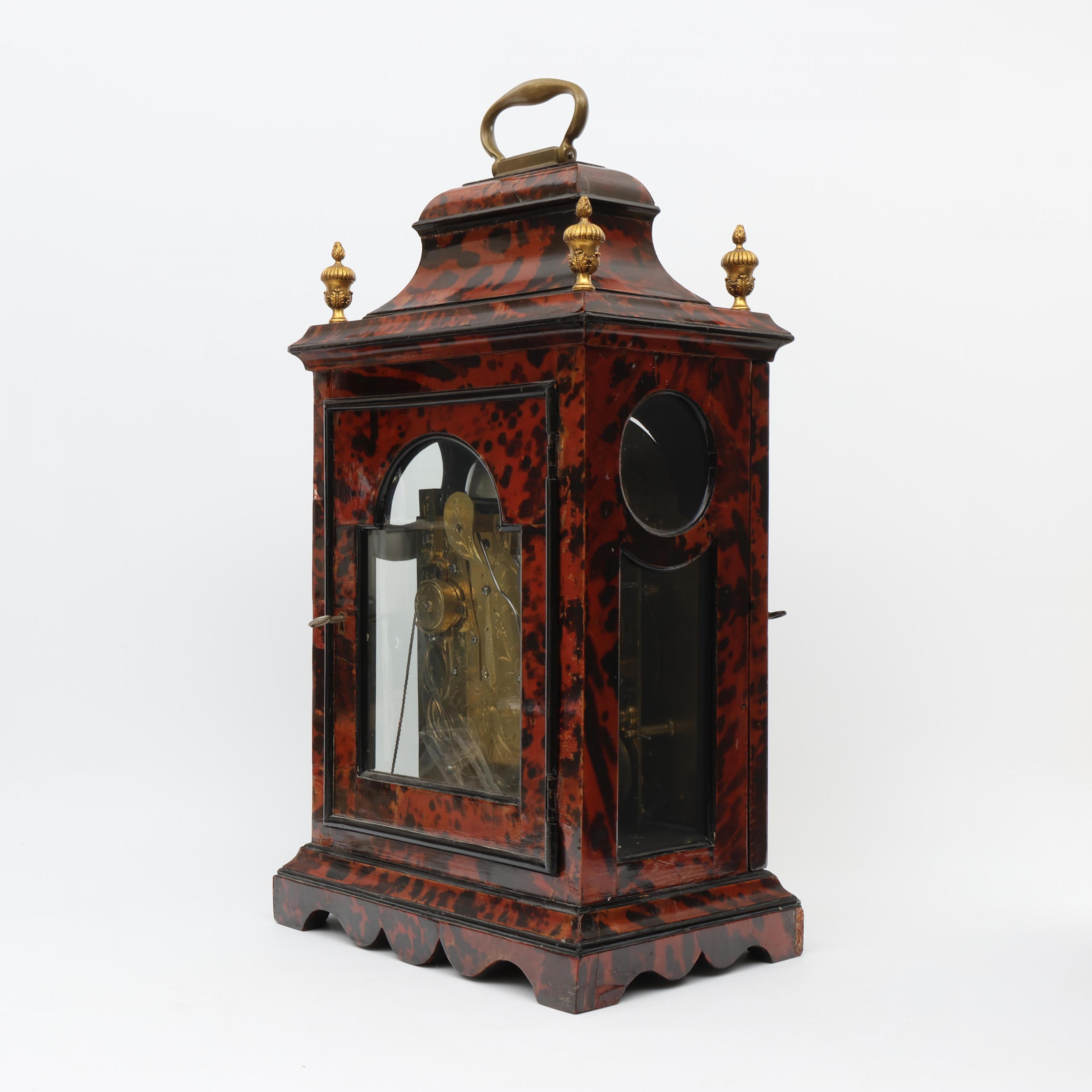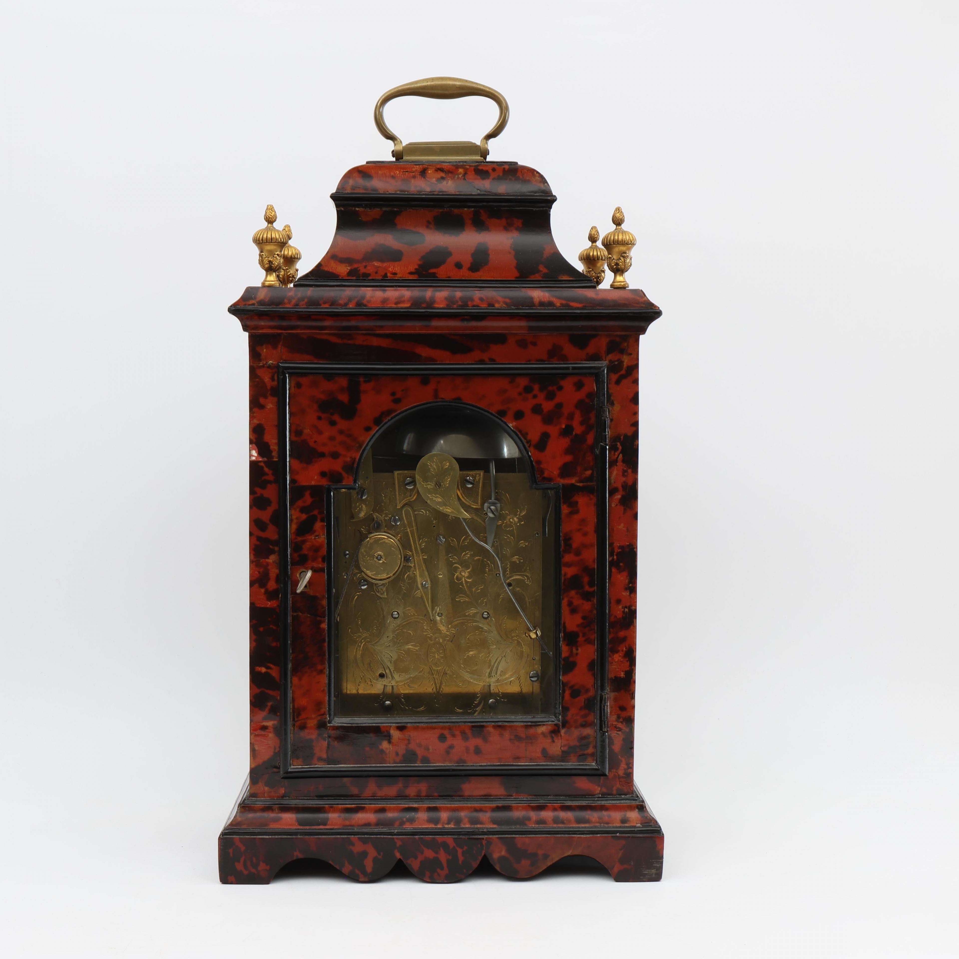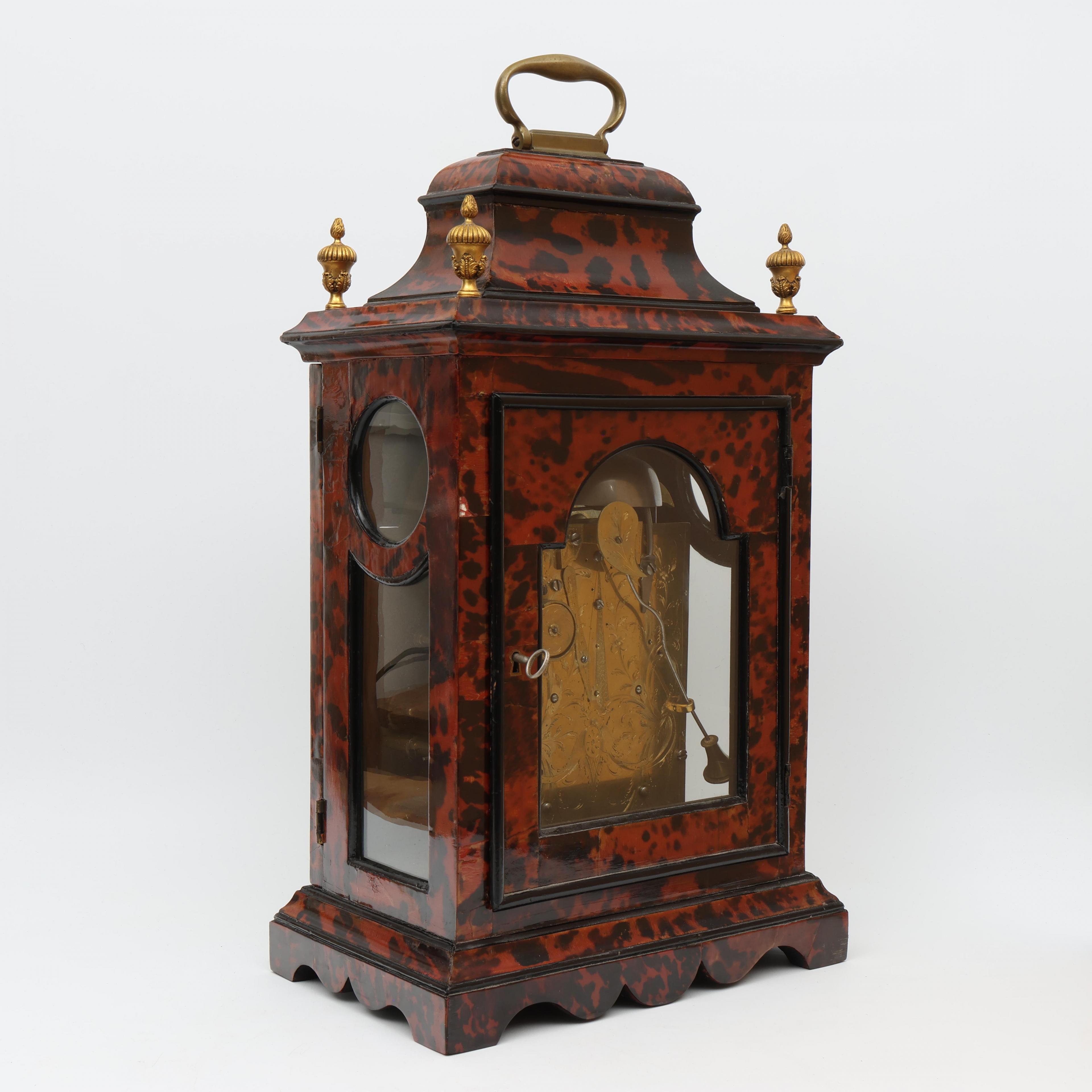 Uurwerk uitgevoerd met spillegang, snek, slagwerk op bel, wekkerwerk met trekmechanisme. Messing wijzerplaat met verzilverde uurring met Romeinse cijfers voor uuraanduiding en Arabische cijfers voor minutenaanduiding, datum, wekkerwerk, slaan/niet slaan aanduiding in de toog. Fraai gegraveerde achterplatine met florale decoratie. Geplaatst in met rood gekleurd schildpad opgelegde houten kast. Vier koperen pinakels op de hoeken, koperen handvat.
