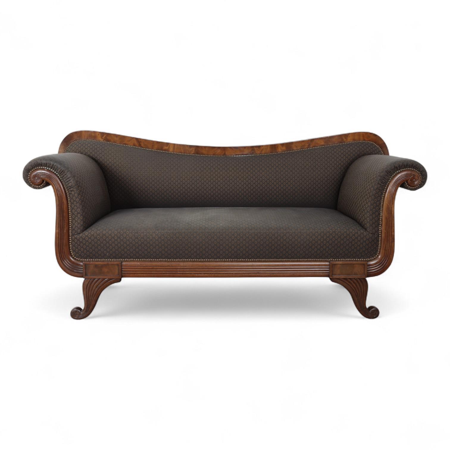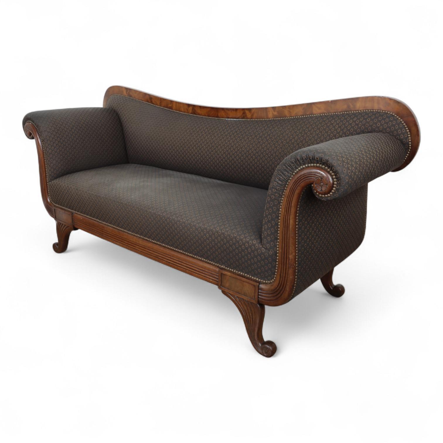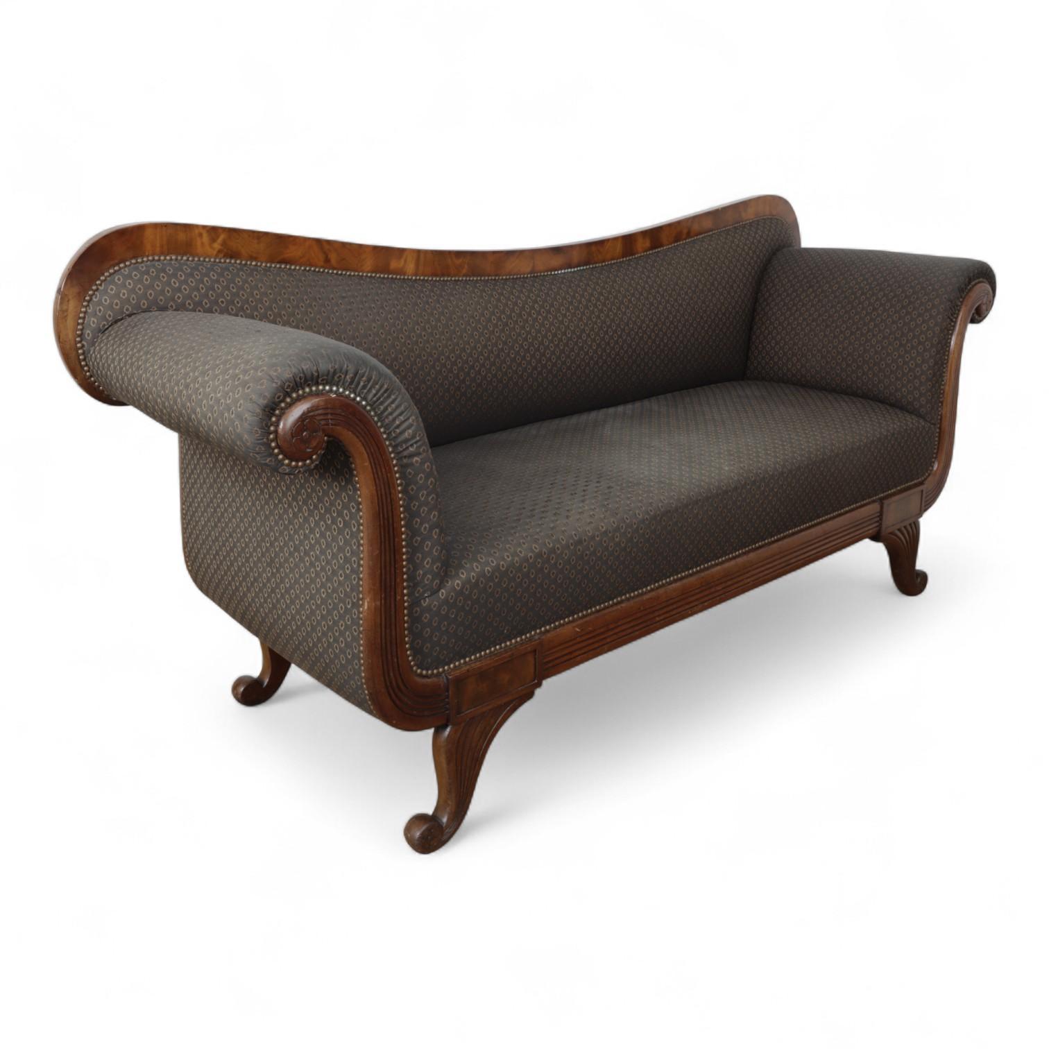 met voluutvormige armleggers en grijsblauwe stoffering (restauratie)
