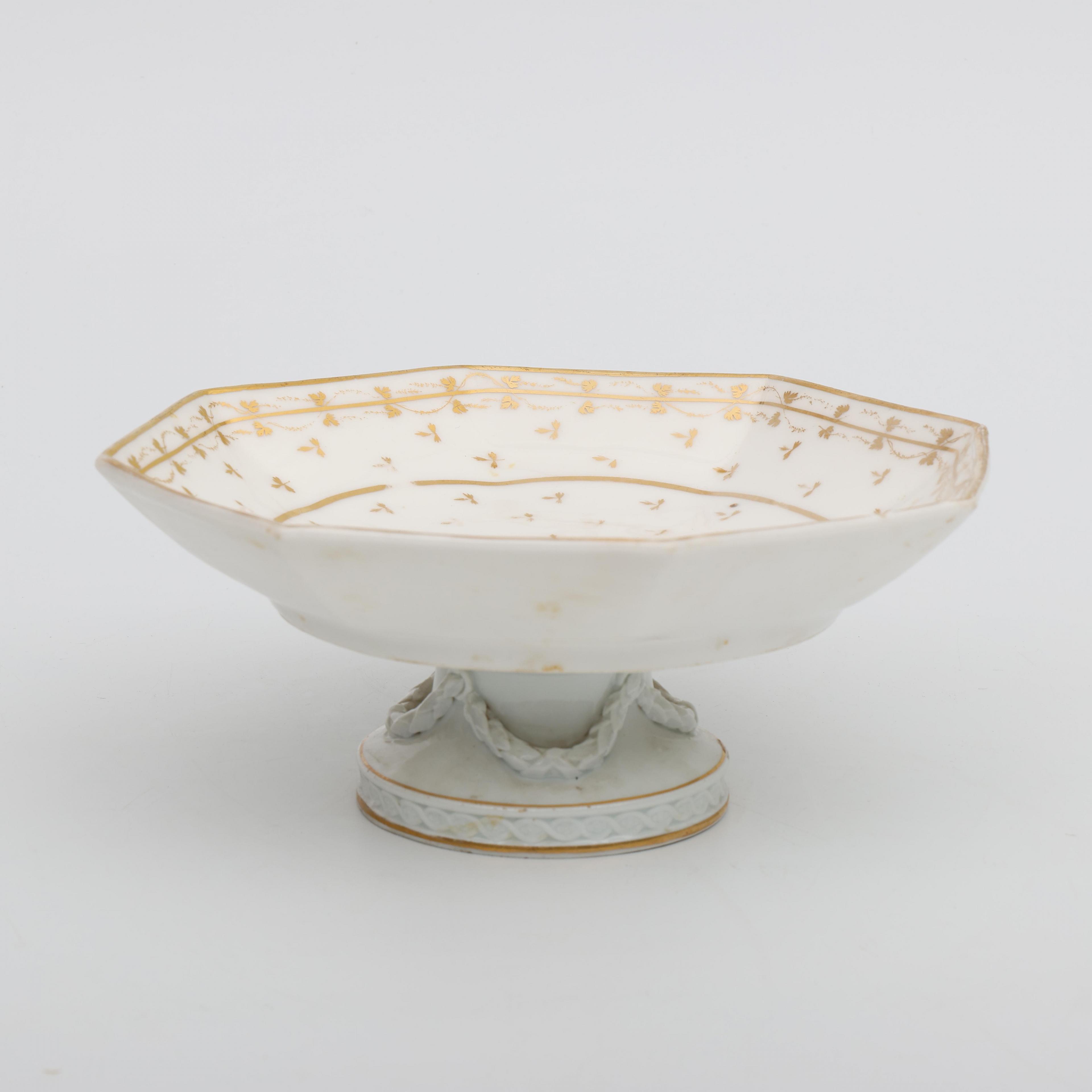 Uitgevoerd met geornamenteerd voet met opgelegde guirlande, verguld decor met bladmotieven. (rand met chip, sleets).