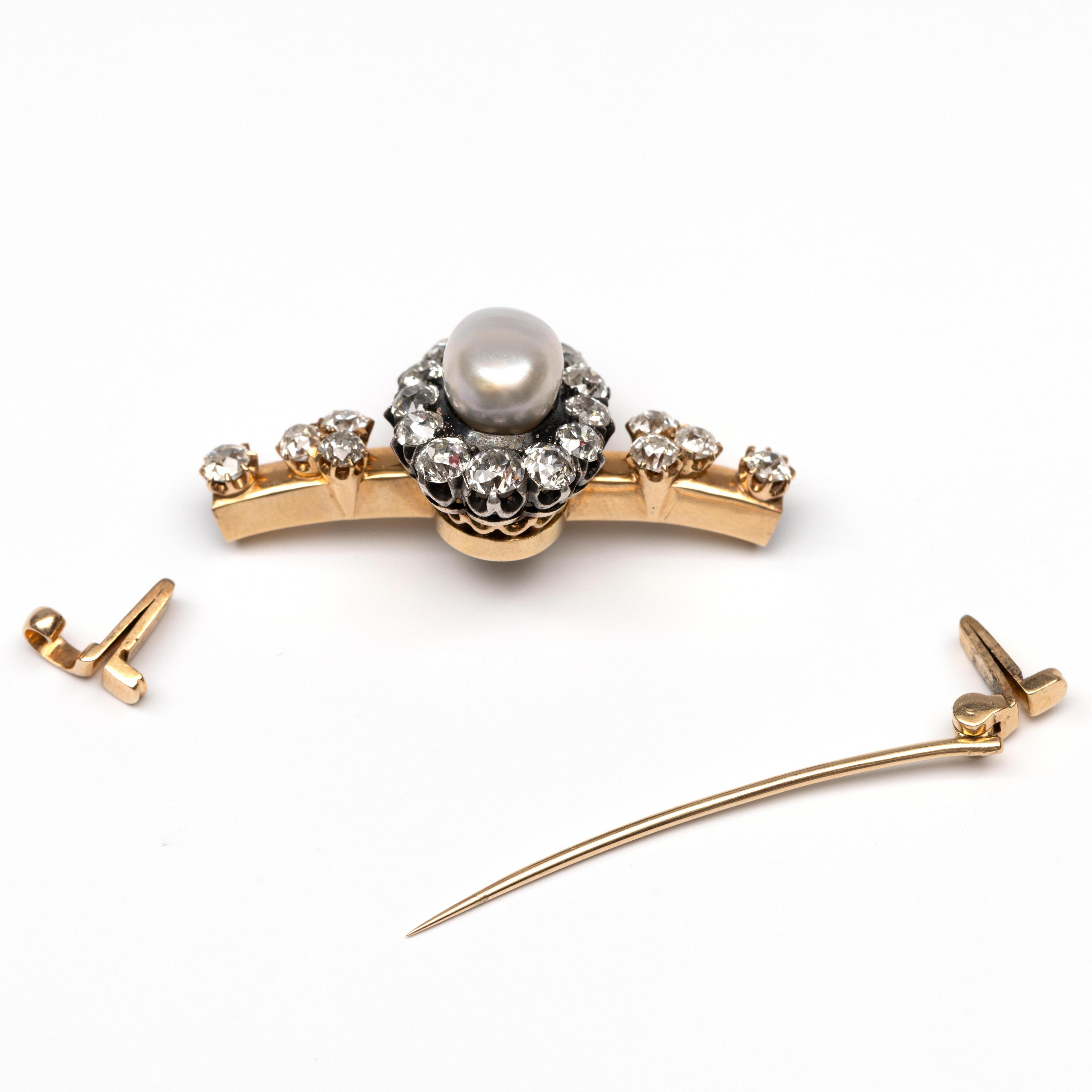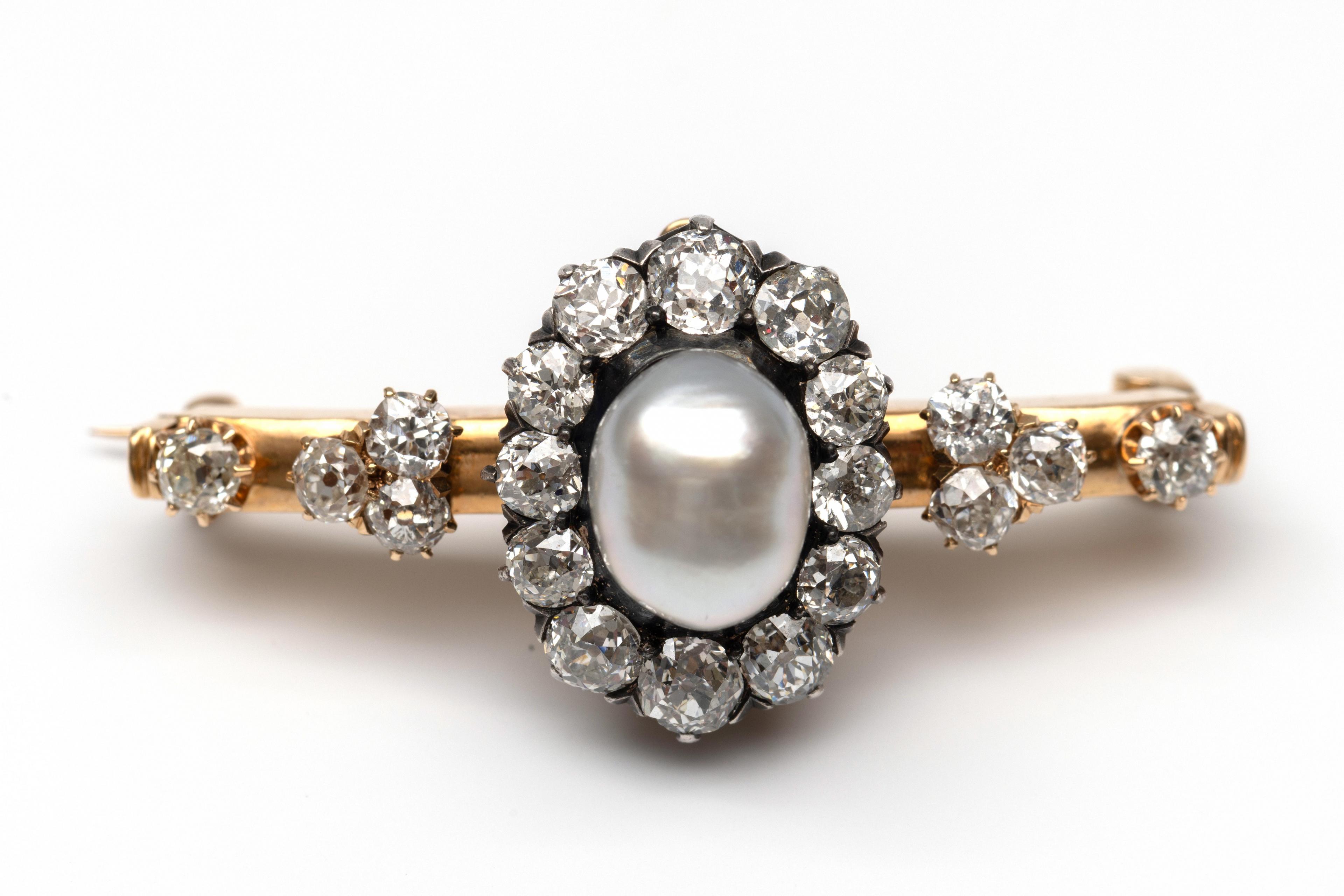 14 k. Gold and silver bar brooch, circa 1900. Centrally set with a natural oval pearl (approx. 9.8 x 7.7 mm) (no certificate) surrounded by old brilliant-cut diamonds, each flanked by four other old brilliant-cut diamonds. Total diamond weight: approximately 2.80 ct. A bail at the bottom of the entourage for a pendant. The brooching is removable on both sides; originally, the brooch also served as the top of a bracelet.