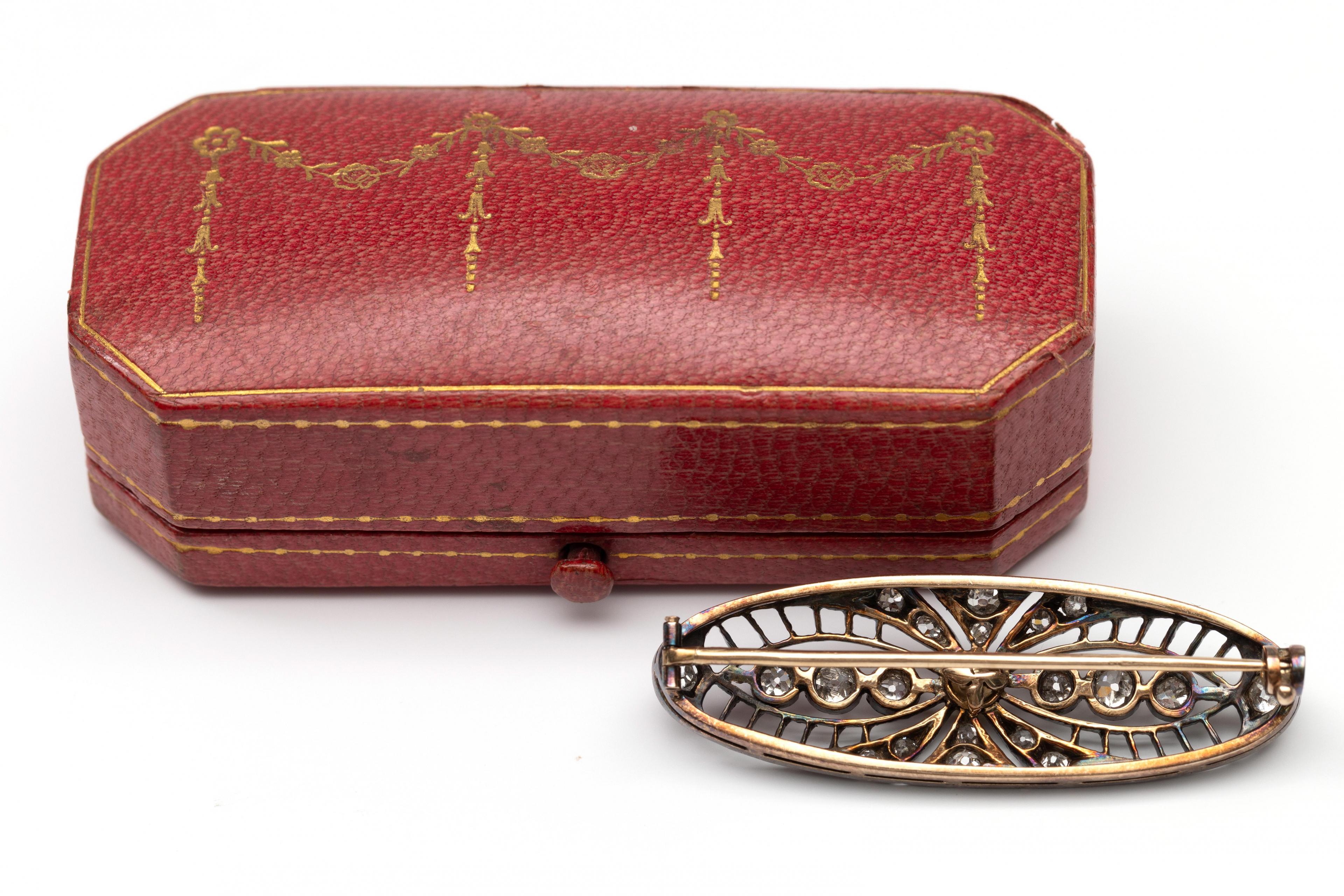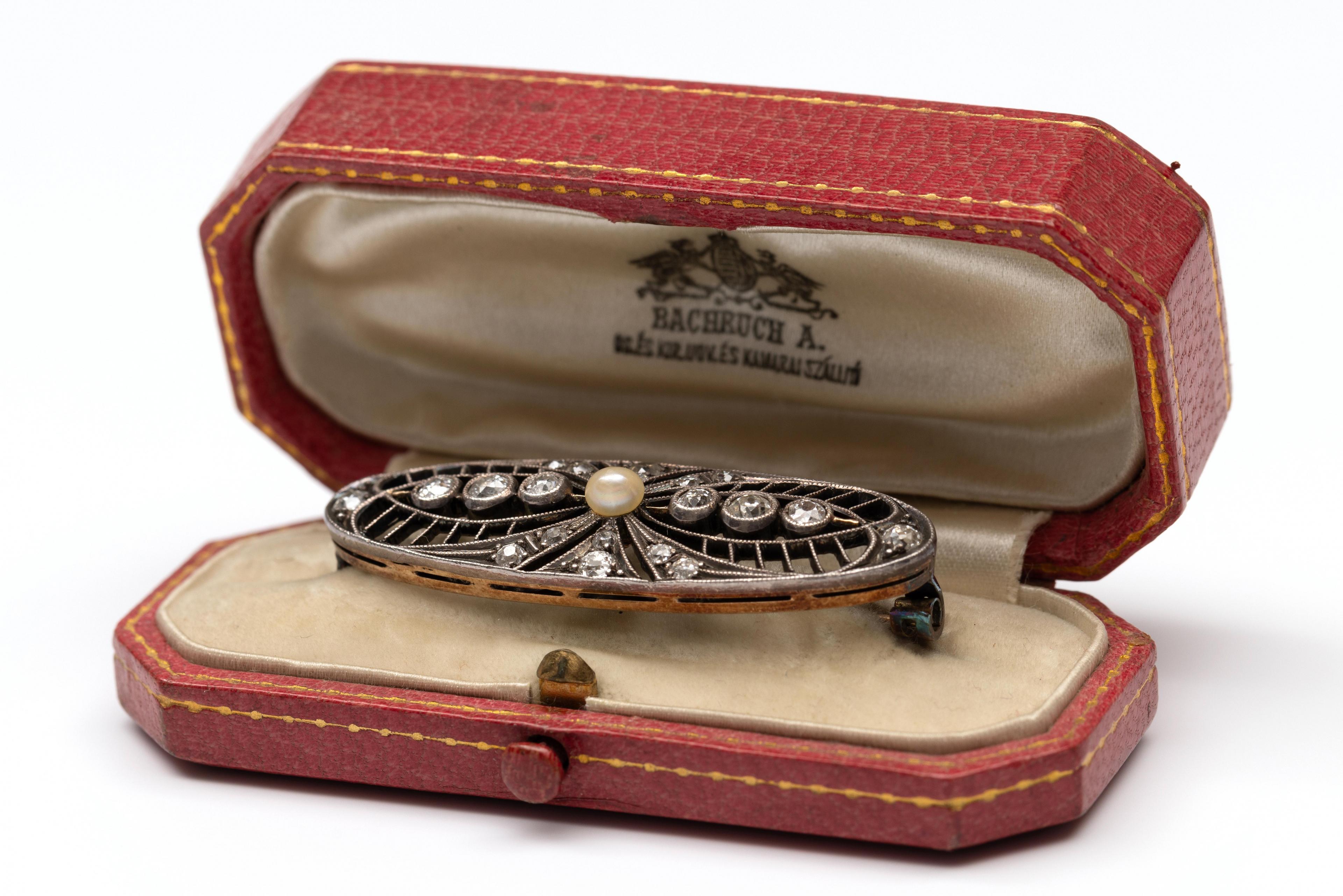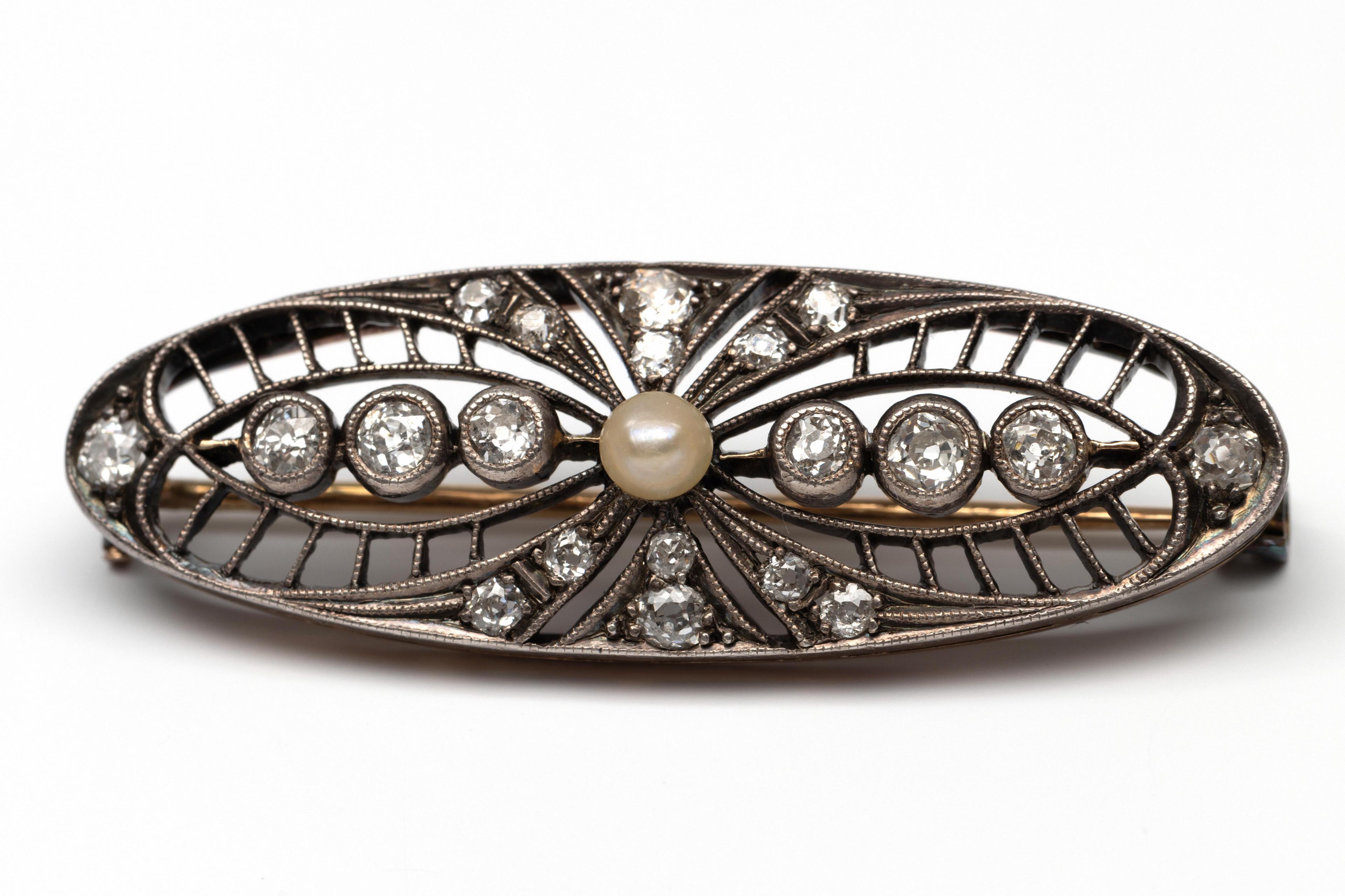 Gold and silver oval openwork brooch, ca. 1900. Set with old brilliant-cut diamond weighing approximately 0.65 ct. in total. A bouton pearl (4.5 mm diameter) mounted in the center. Presented in a red leather case.
