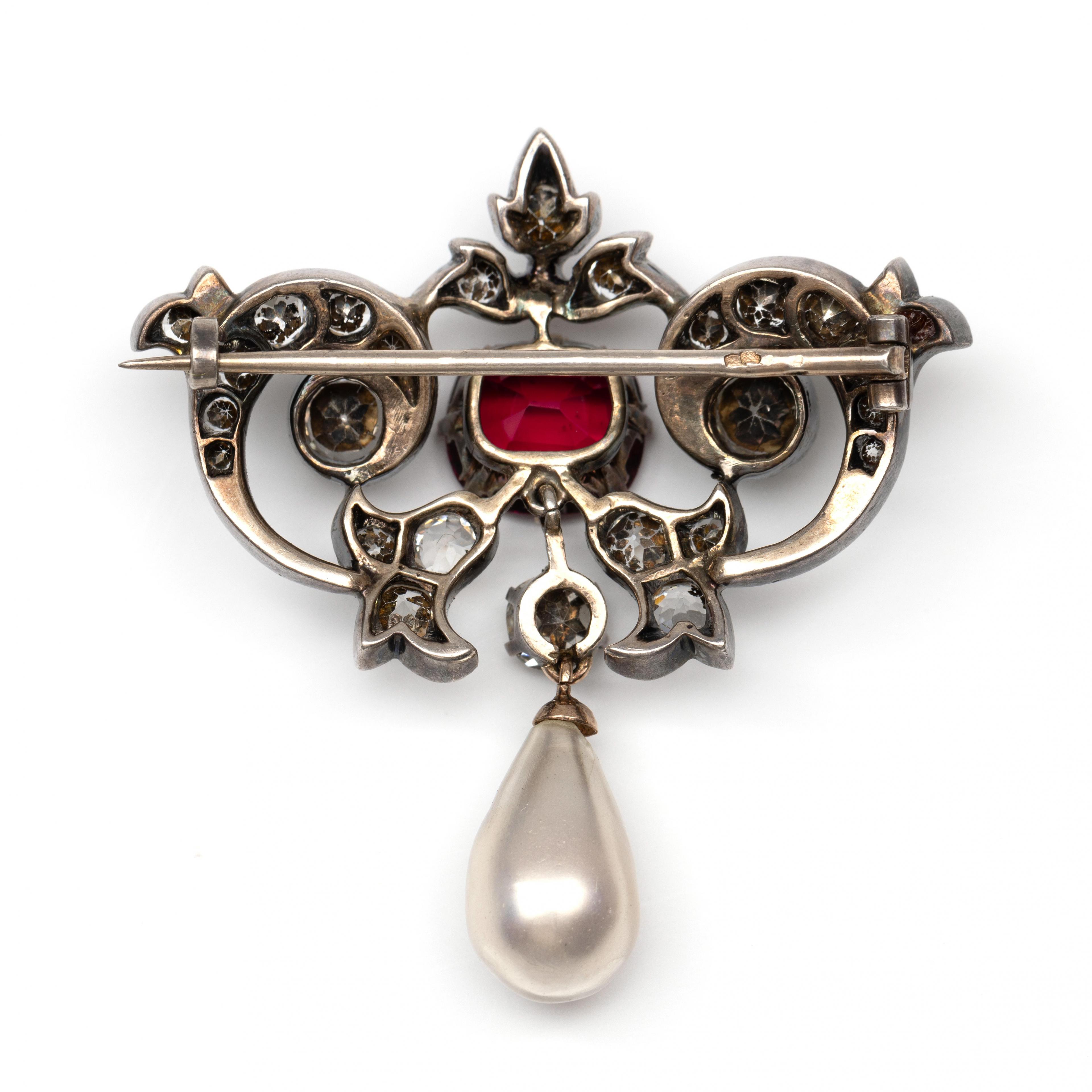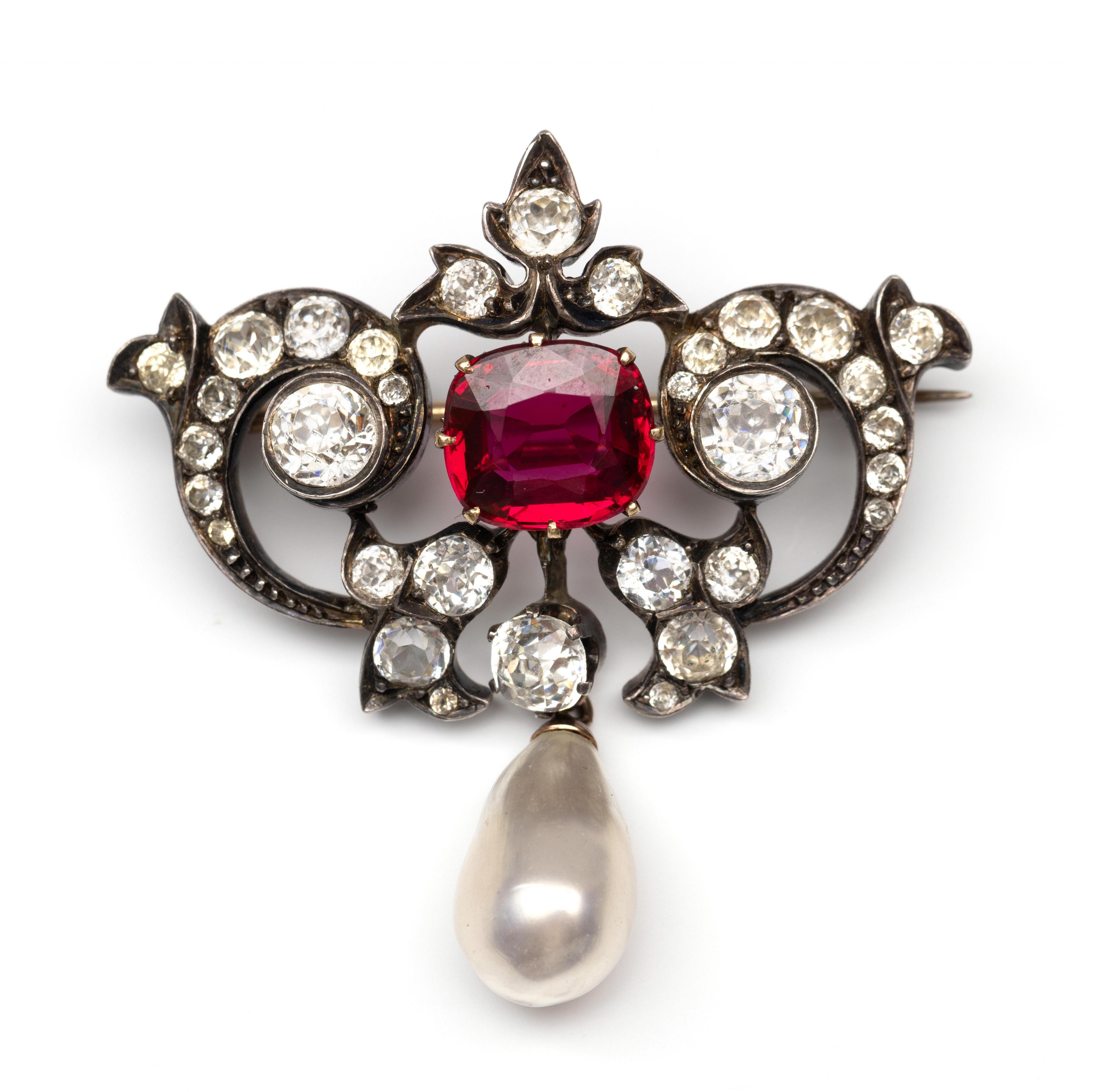 France, silver brooch, early 20th century. With curly motifs, set with paste. A cushion-shaped faceted synthetic ruby mounted in the center. A teardrop-shaped imitation pearl dangling at the bottom.