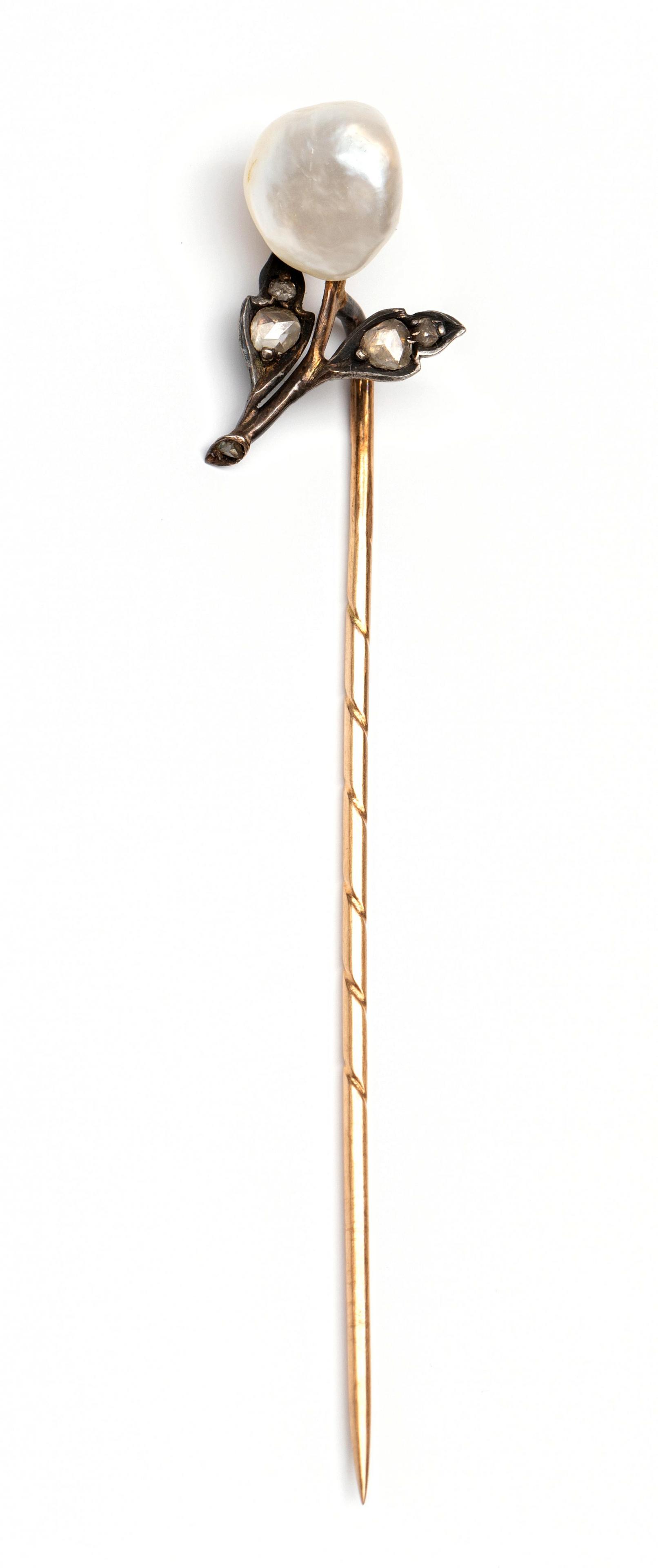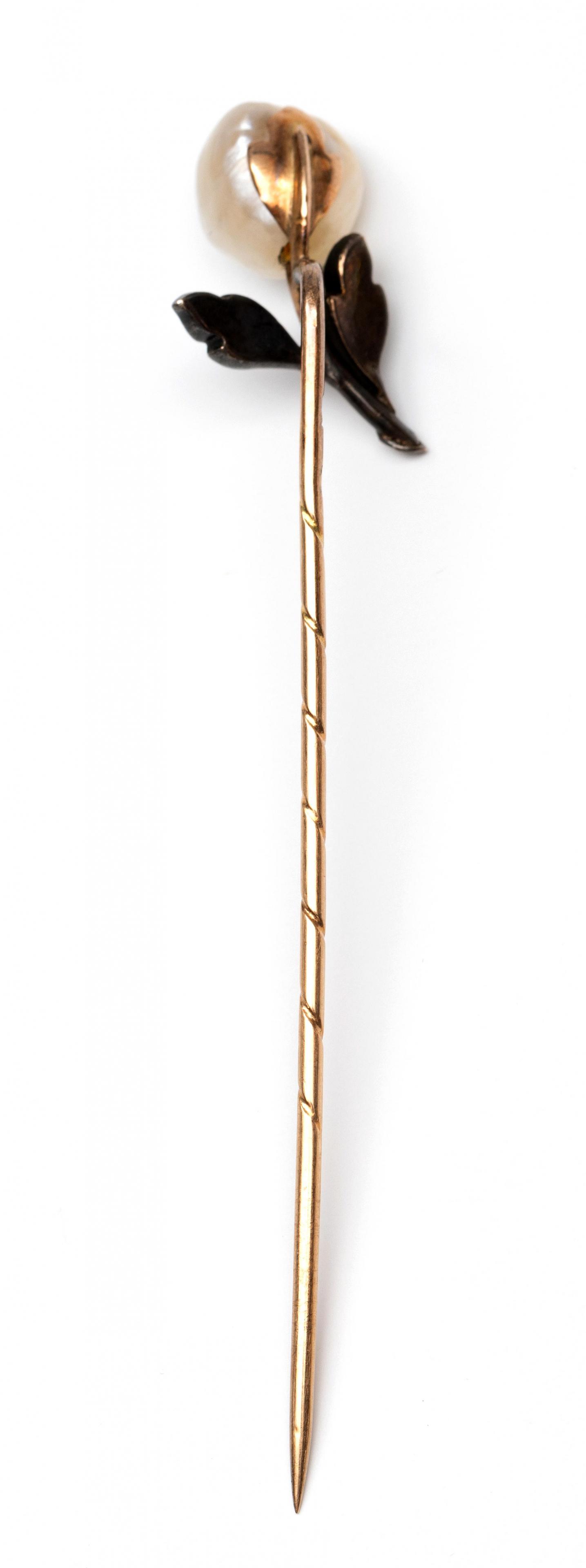Austria-Hungary, gold (580/000) with silver pin, early 20th century. In the shape of a flower, its petals set with rose-cut diamonds, the bud a natural baroque pearl (approx. 9.8 x 9.1 mm) (no certificate available)