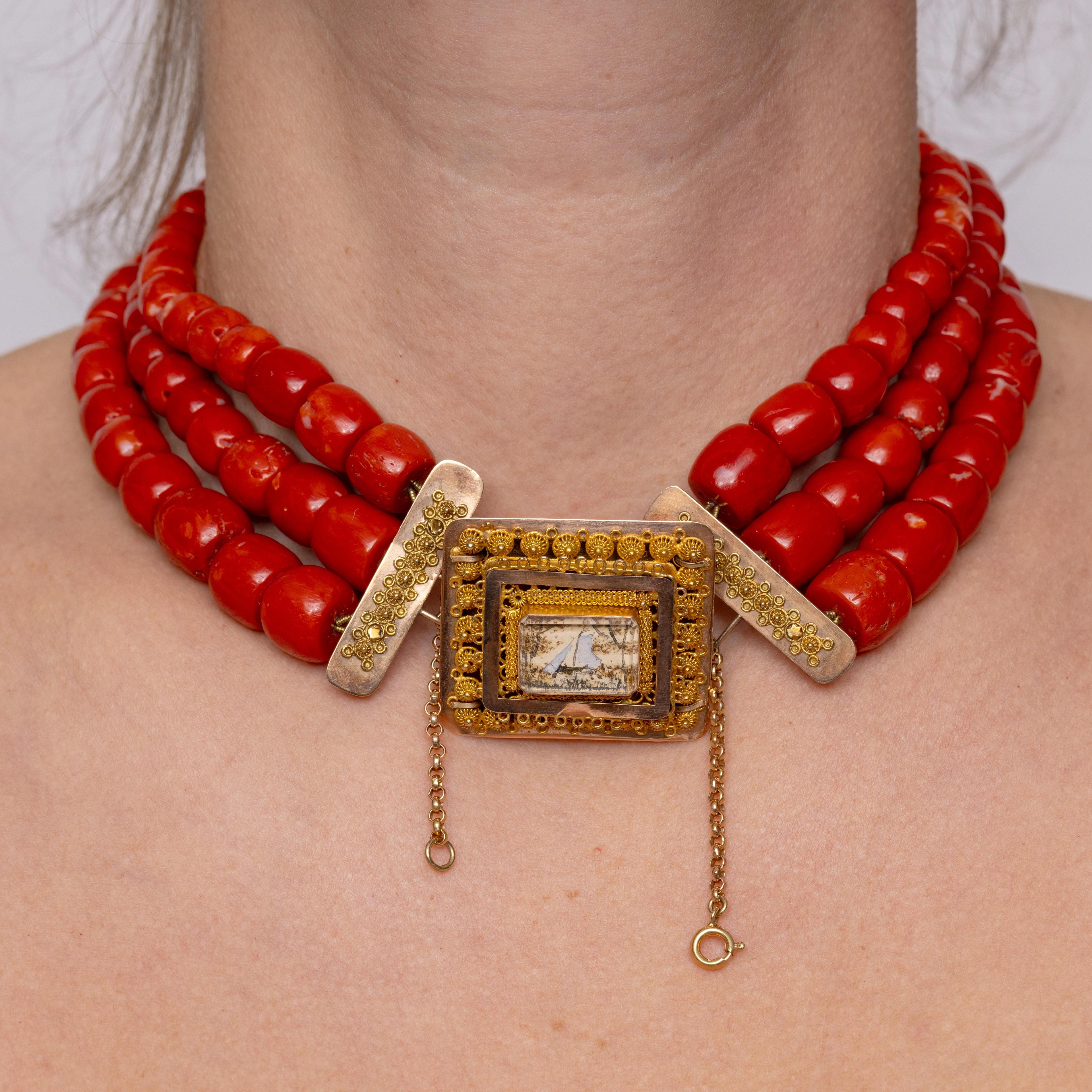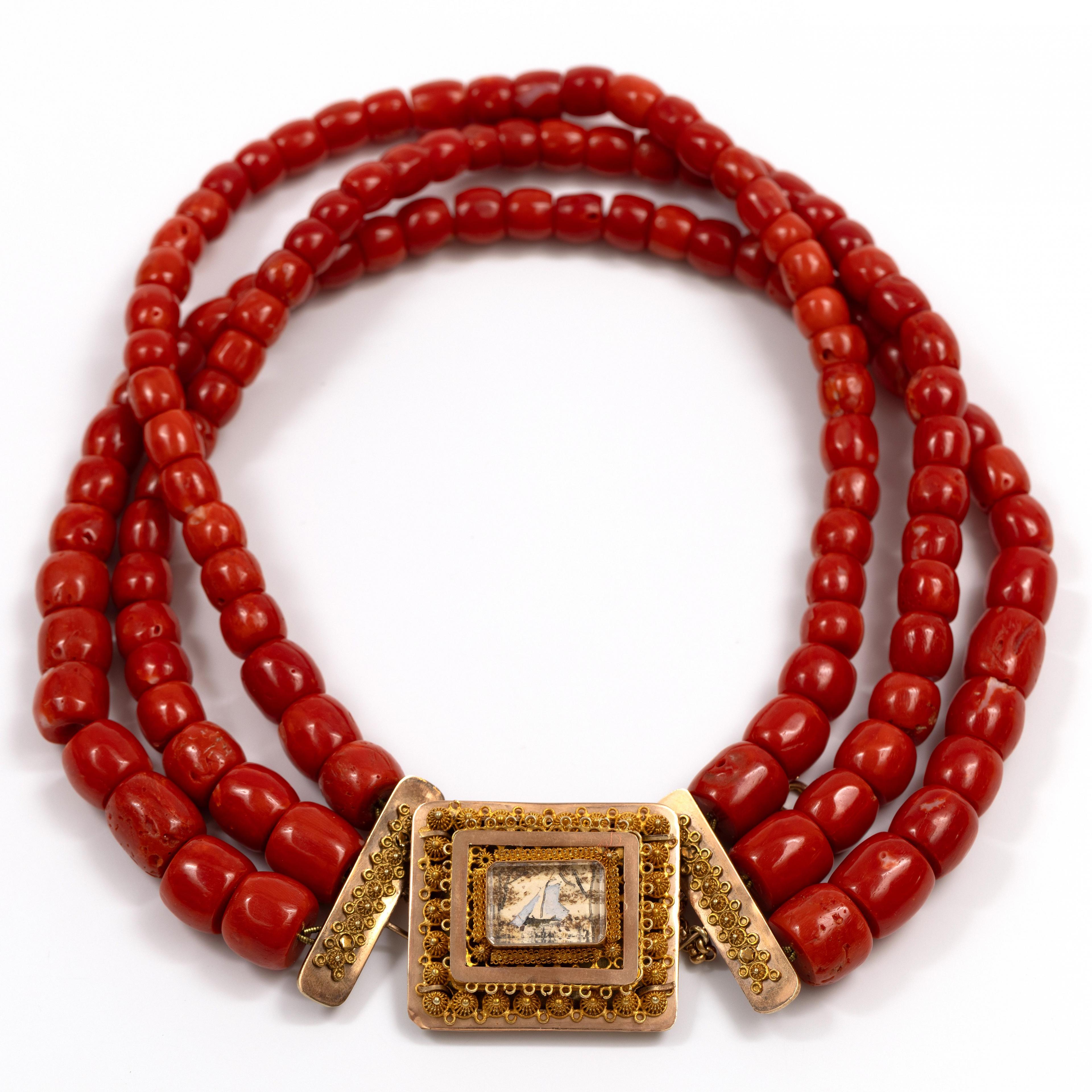 Volendam, coral necklace. Made of three strands of modern red coral, the beads barrel-shaped, decreasing in size from the clasp (diameter 12.5-7 mm). Attached to a 14 k. gold clasp, second half of the 20th century, depicting a ship. Makers mark J.H. van der Naaten, Edam, 1969-1987